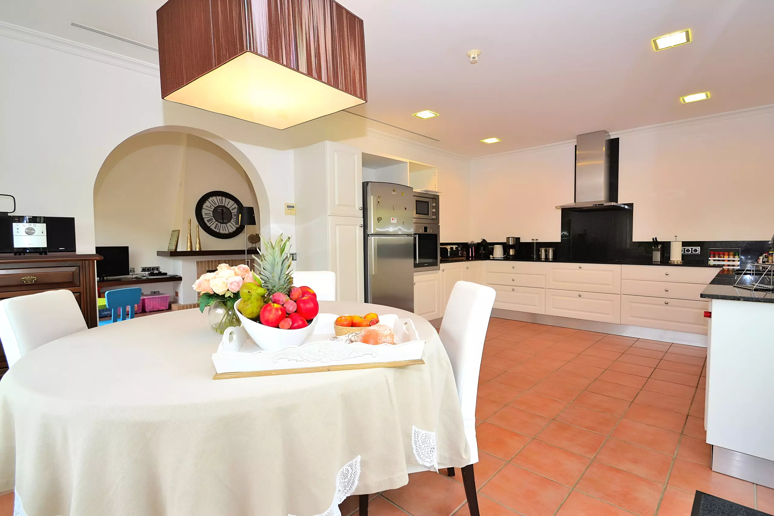 Il y a une grande cuisine très bien équipée avec un coin repas, d'où vous avez accès à la terrasse et au jardin. Elle mène au salon spacieux avec canapé et cheminée, tout est inondé de lumière, lumineux et convivial. L'équipement est de haute qualité et de bon goût.