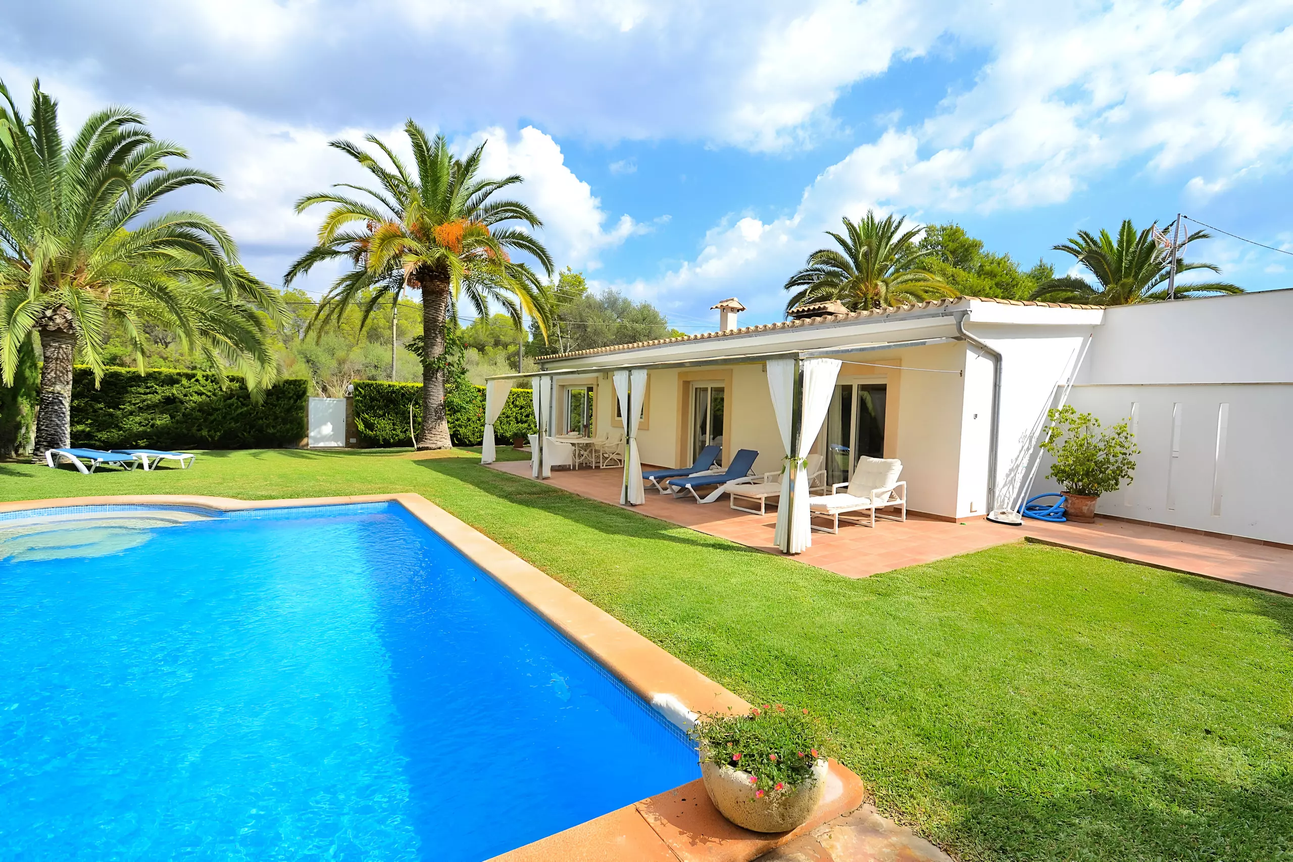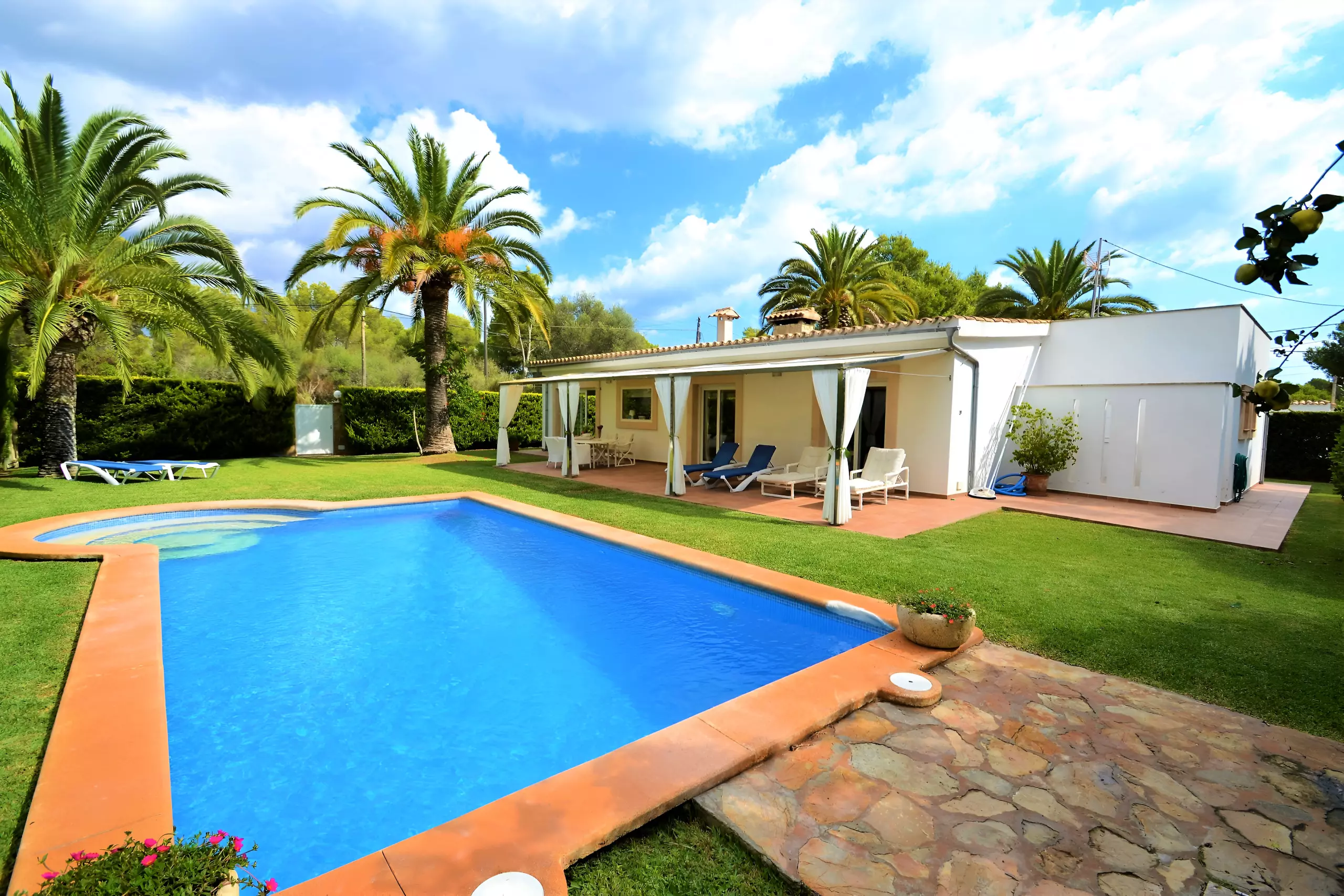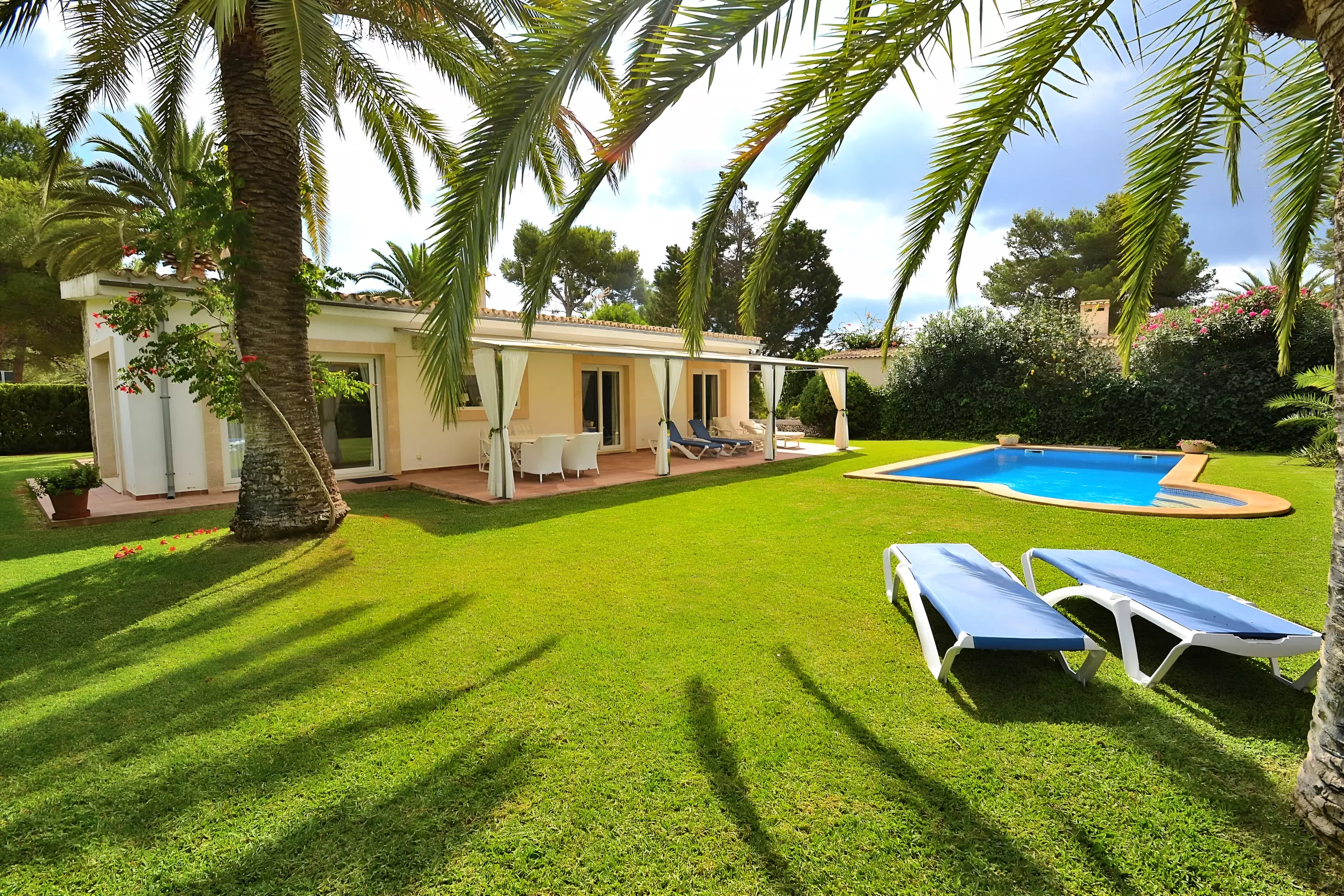 Située dans un beau terrain de jardin, cette maison de vacances moderne se trouve à quelques minutes de la plage de sable de Cala Murada.