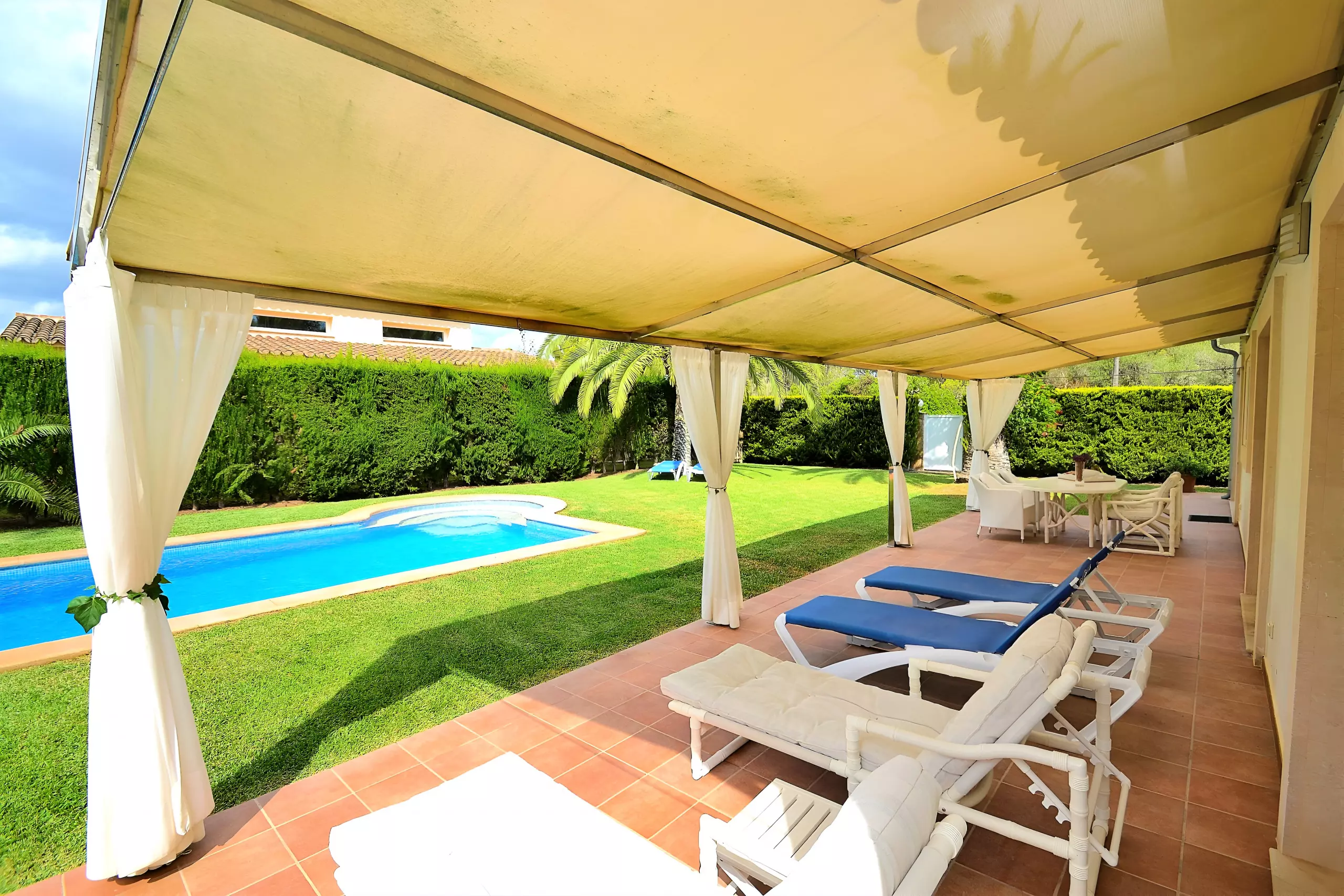 La piscine privéemesure 4 m x 8 m, 1,60 - 2,00 m de profondeur, avec des escaliers. Elle contient de l'eau salée naturelle et est purifiée sans aucun chlore.