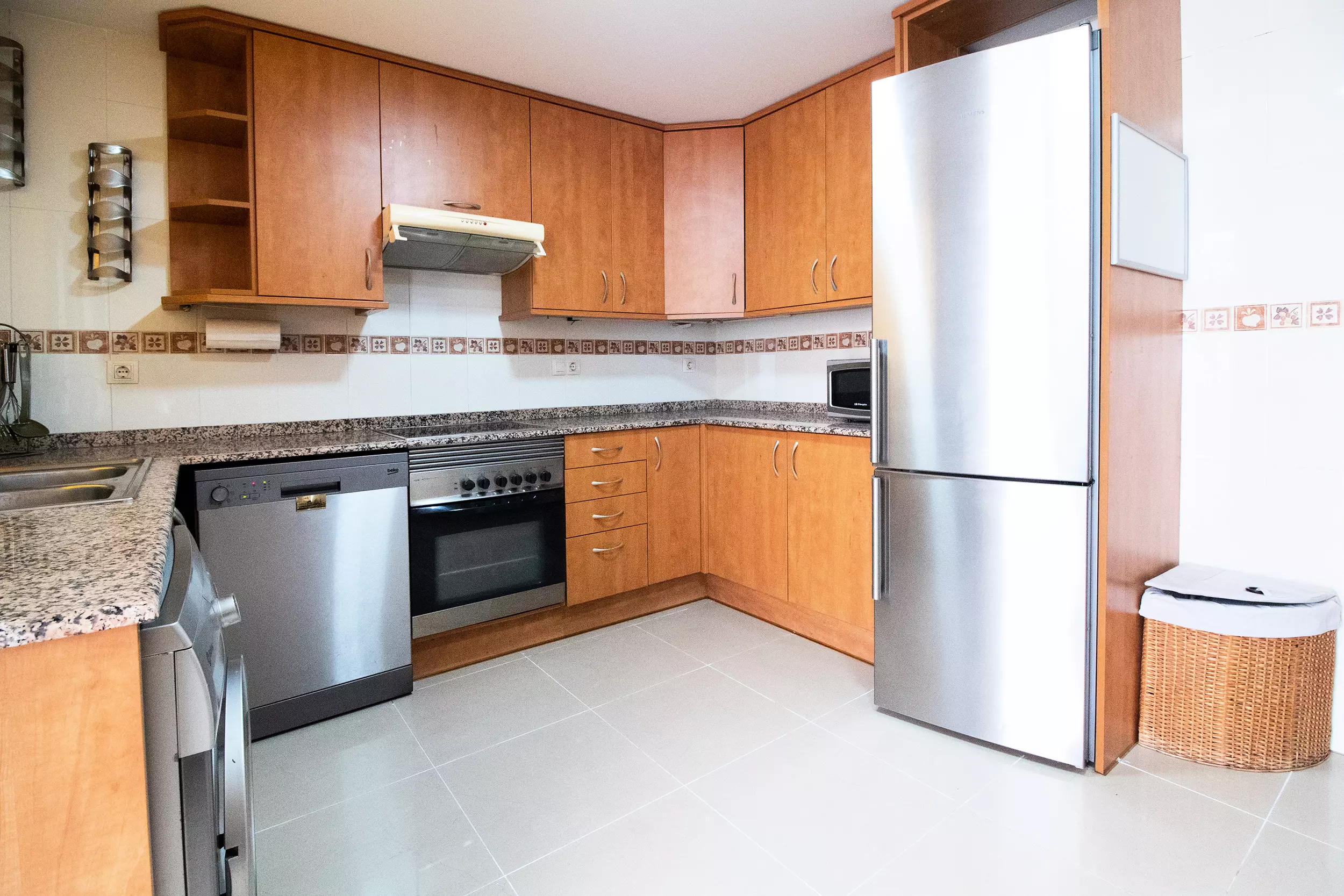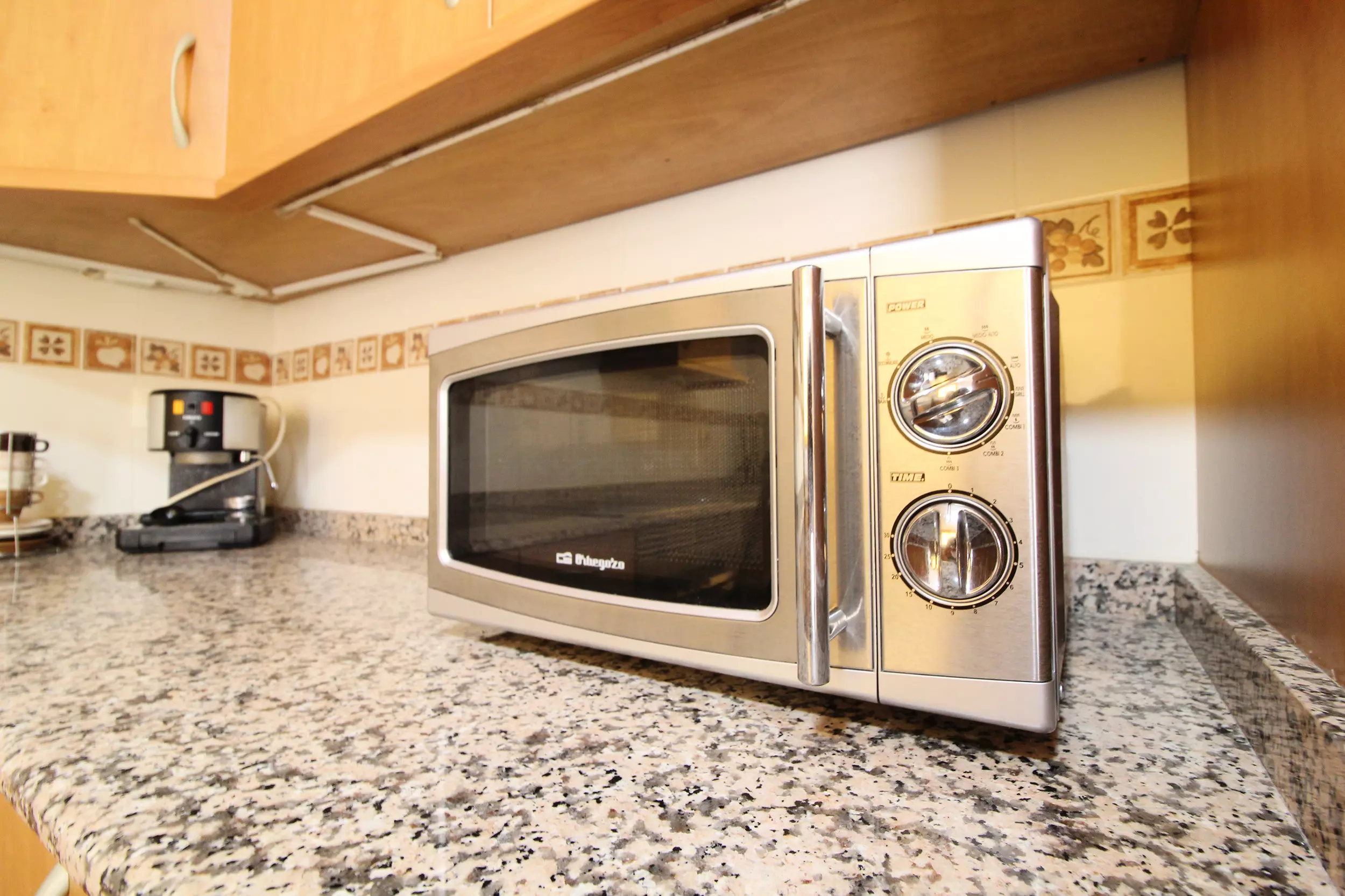 La cuisine indépendante, à mixte: gaz et électricité, est équipée avec réfrigérateur, micro-ondes, four, congélateur et vaisselle/couverts.