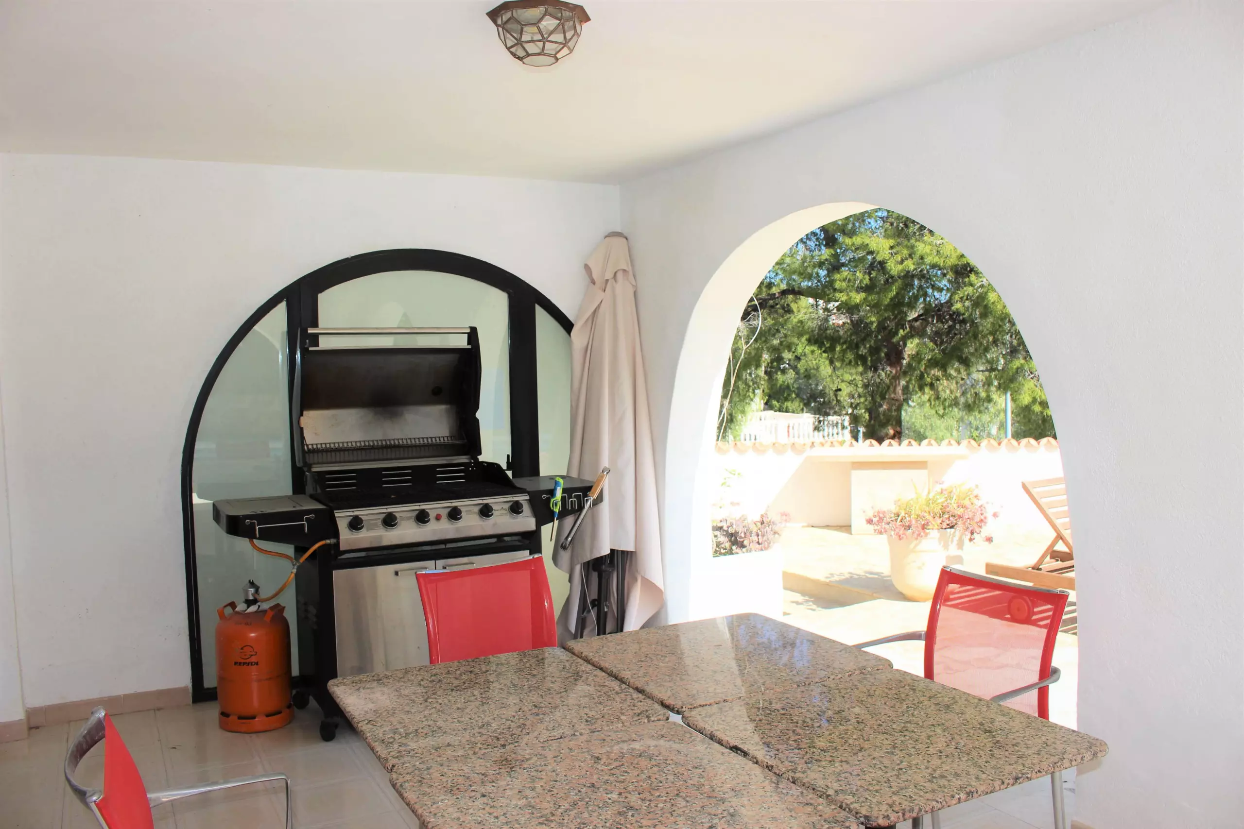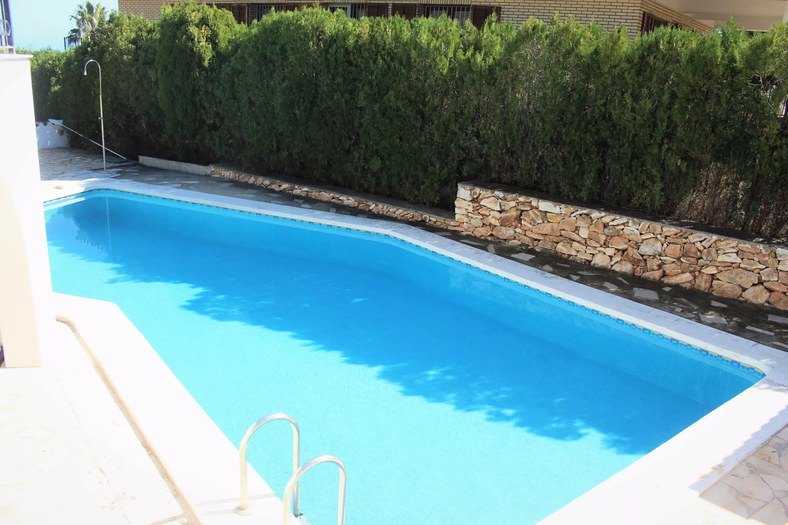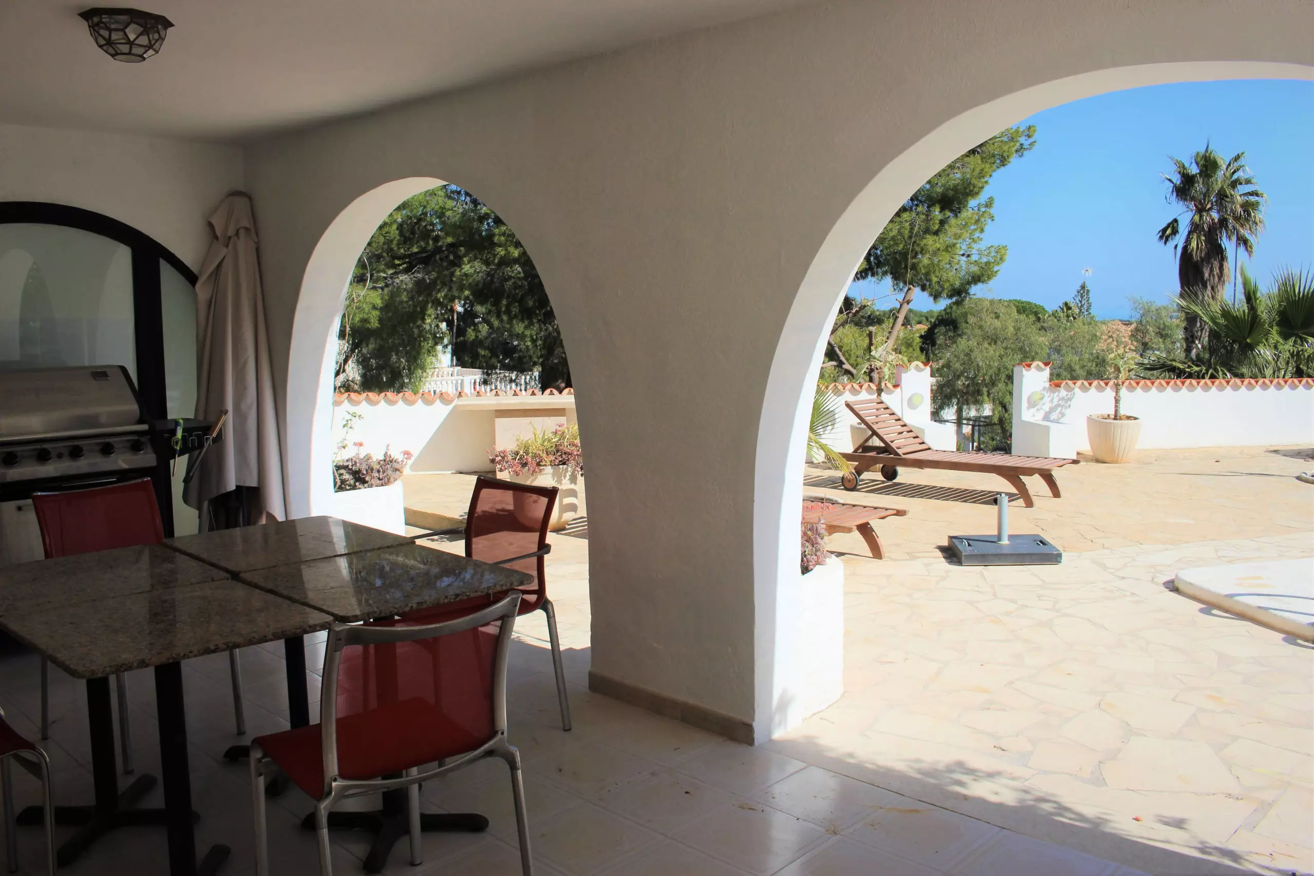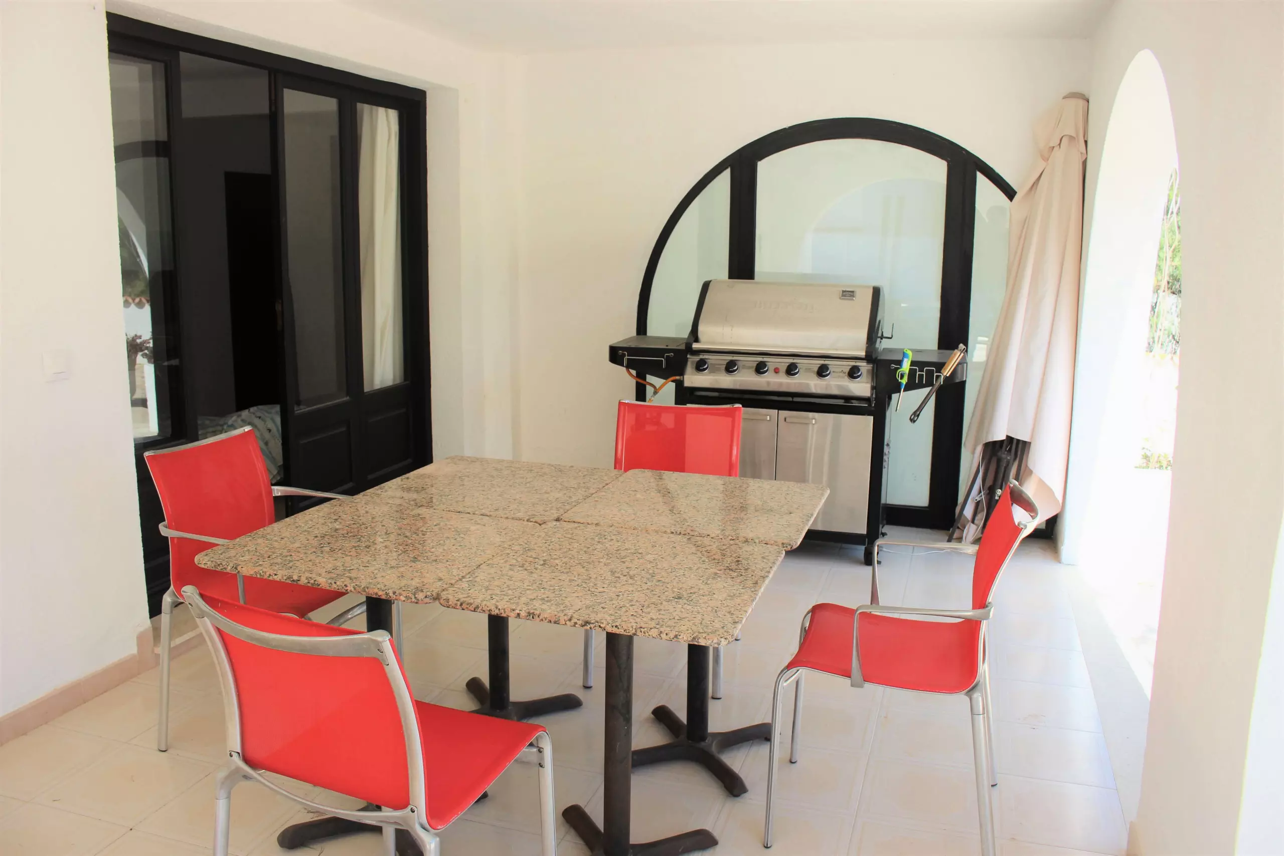 À l'extérieur de la villa, un espace extérieur couvert avec barbecue et table à manger. Et la piscine privée, ouverte toute la saison de location, avec des chaises longues et un parasol pour prendre le soleil et se détendre. Il dispose également d'un parking extérieur privé pour 2 voitures.
