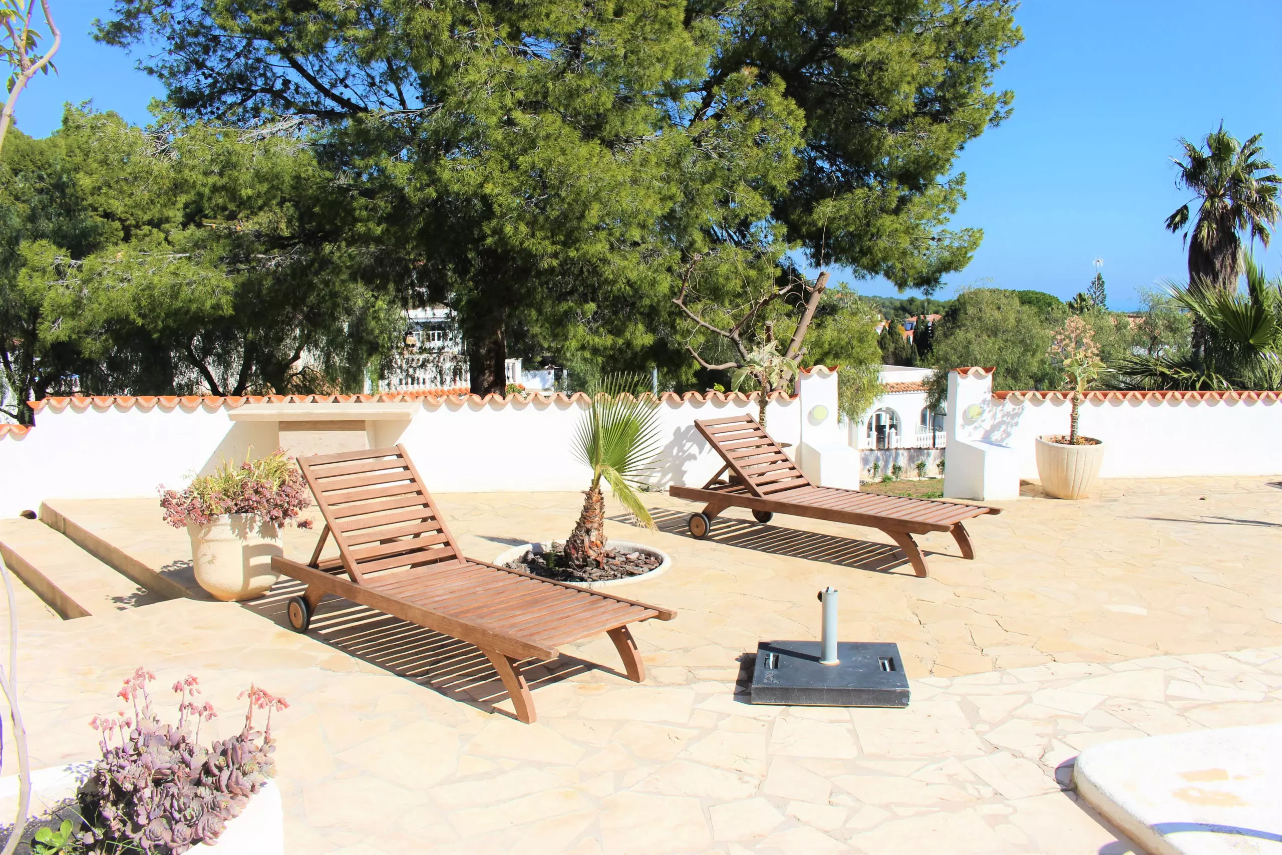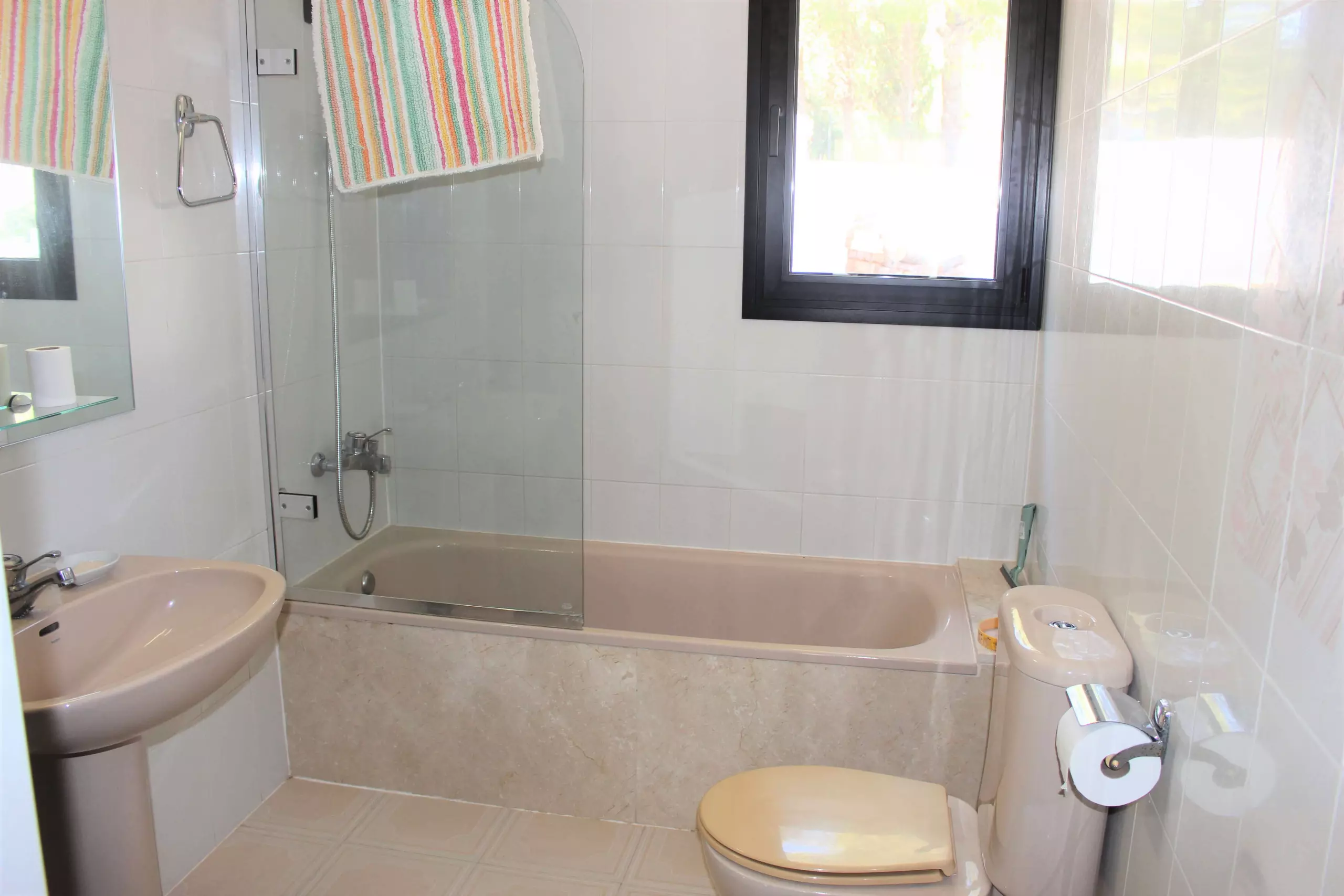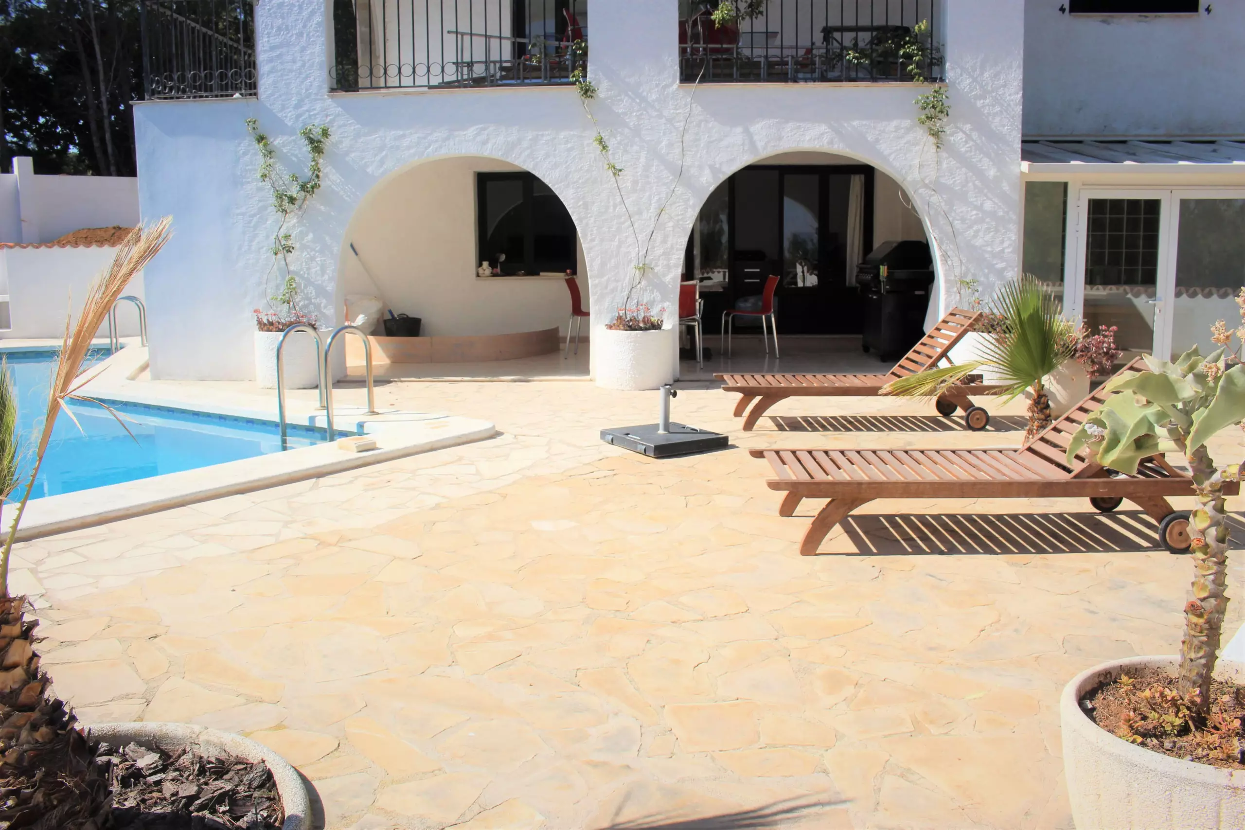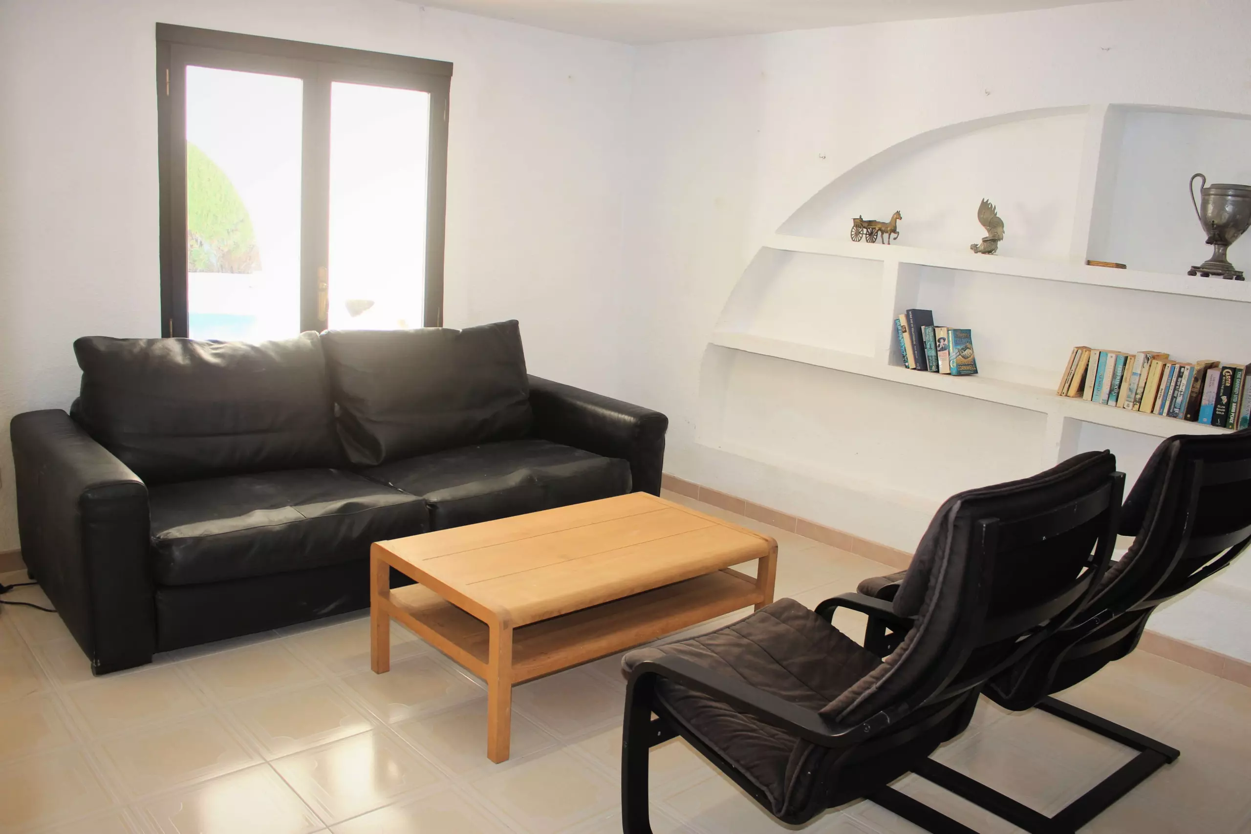 À l'extérieur de la villa, un espace extérieur couvert avec barbecue et table à manger. Et la piscine privée, ouverte toute la saison de location, avec des chaises longues et un parasol pour prendre le soleil et se détendre. Il dispose également d'un parking extérieur privé pour 2 voitures.