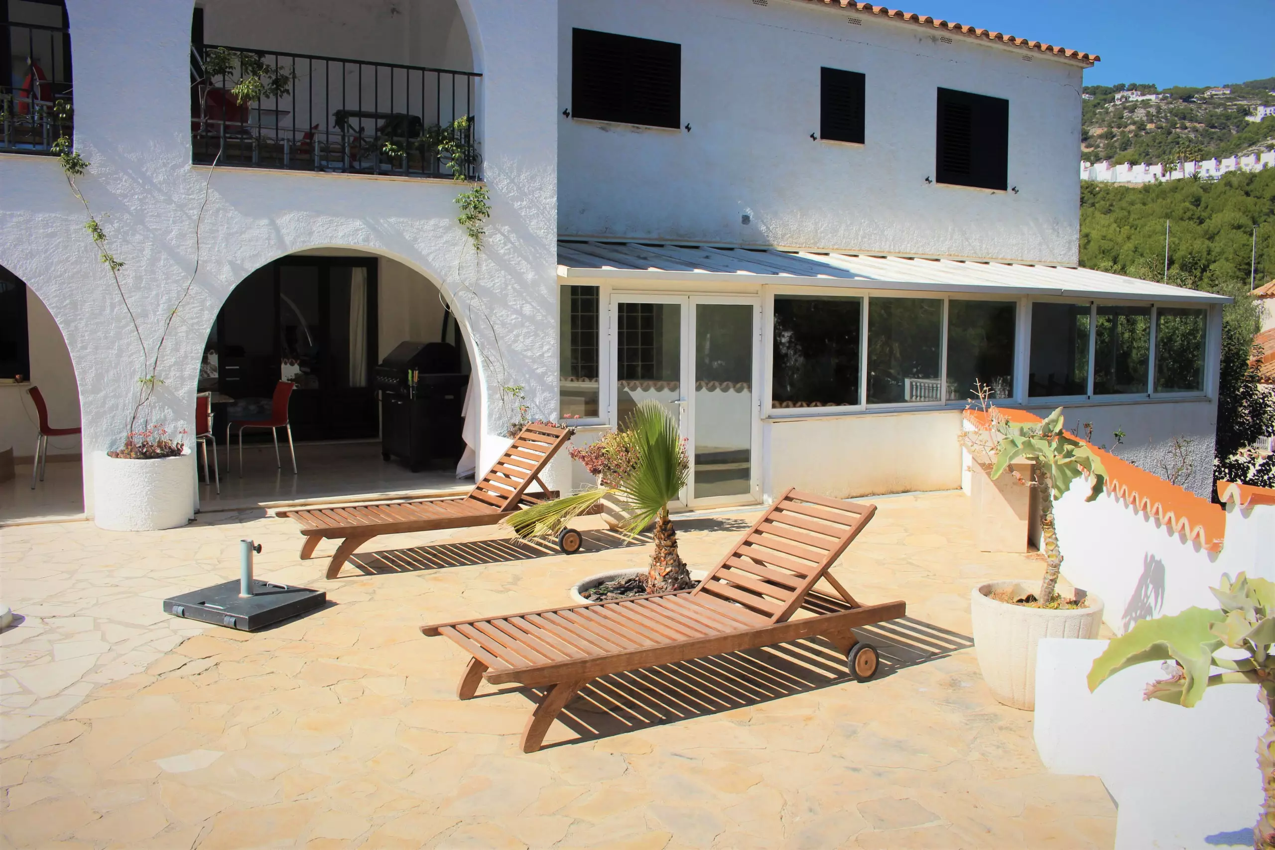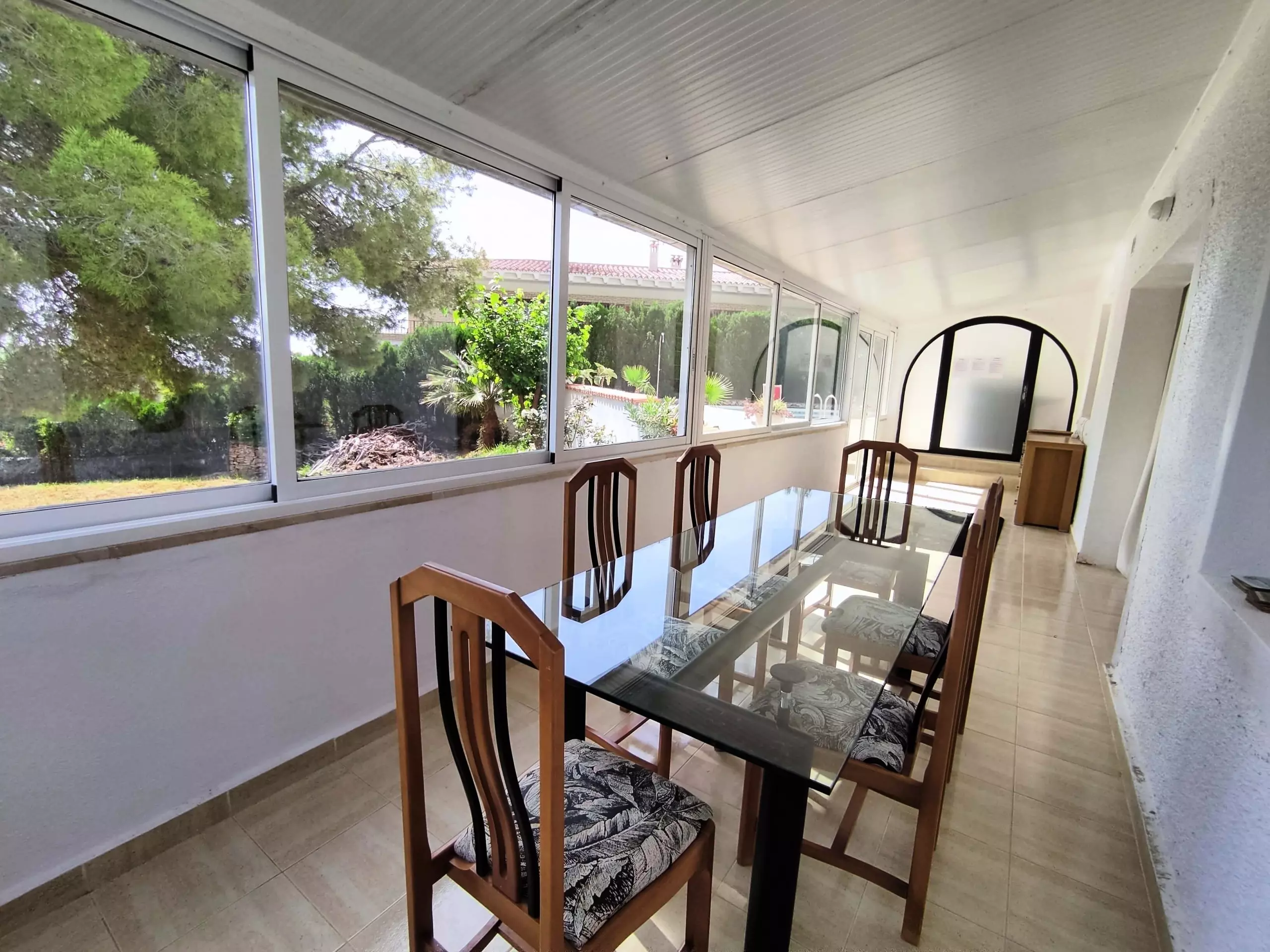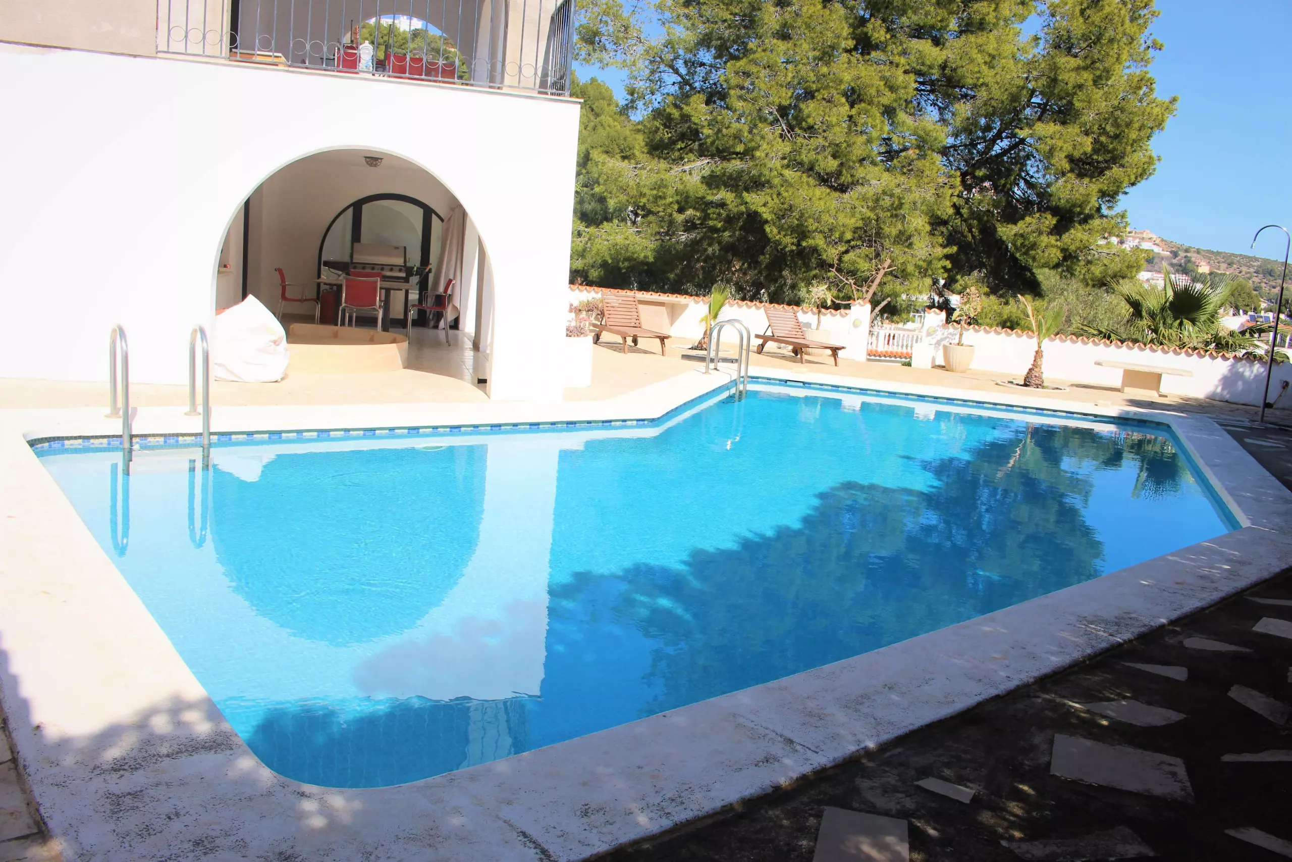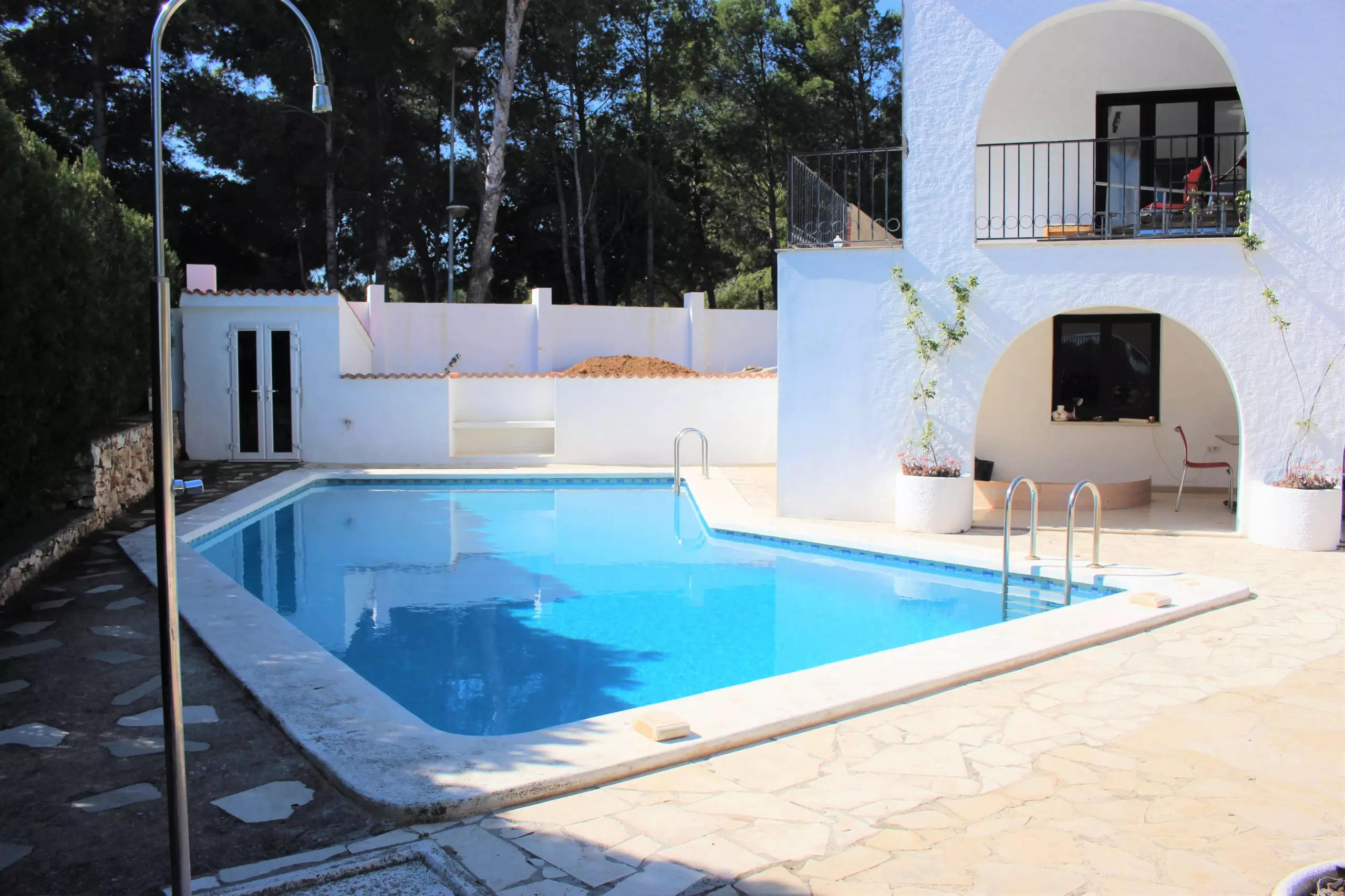 À l'extérieur de la villa, un espace extérieur couvert avec barbecue et table à manger. Et la piscine privée, ouverte toute la saison de location, avec des chaises longues et un parasol pour prendre le soleil et se détendre. Il dispose également d'un parking extérieur privé pour 2 voitures.