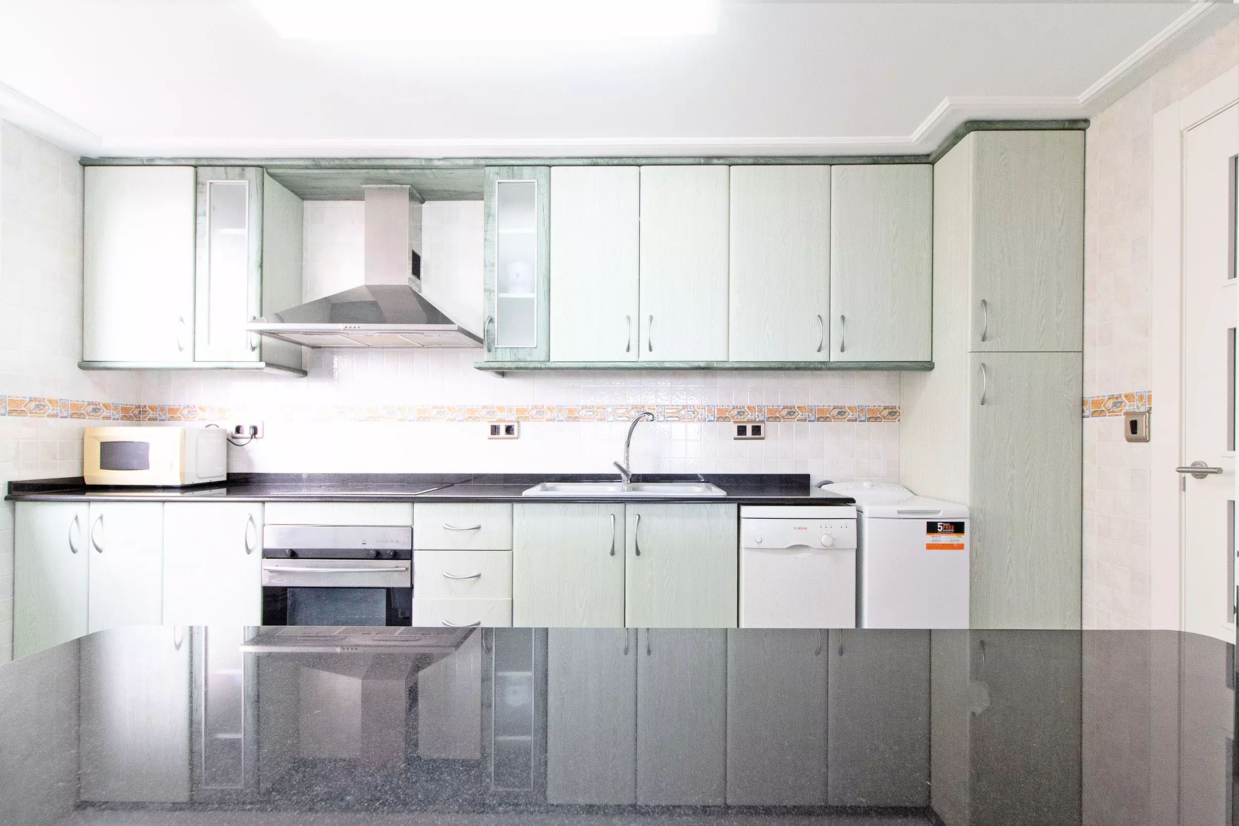 La cuisine indépendante, de vitrocéramique, est équipée avec réfrigérateur, micro-ondes, four, congelateur, lave-linge, lave-vaisselle, vaisselle/couvert, ustensiles/cuisine, cafetière, grille pain et presse-agrumes.