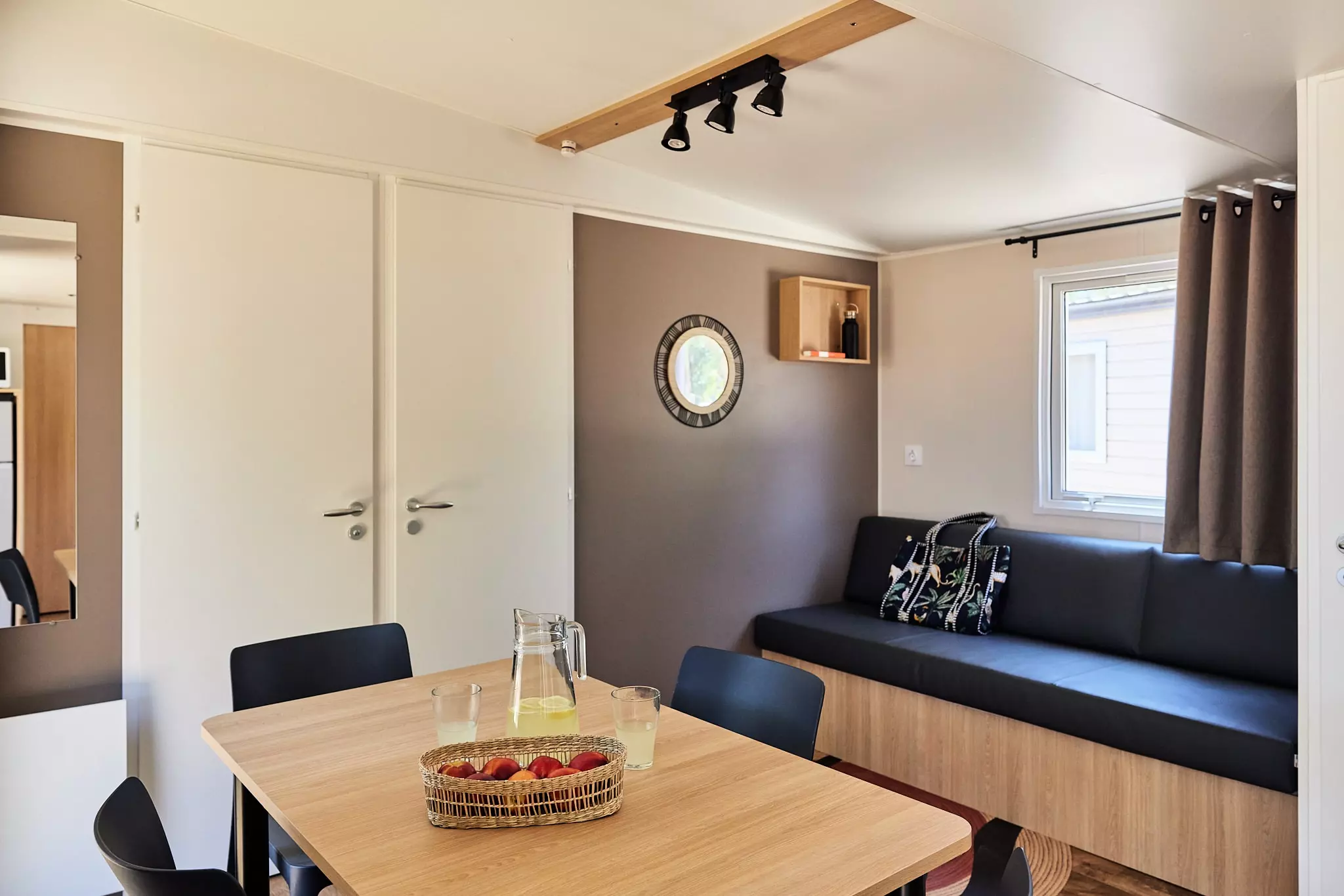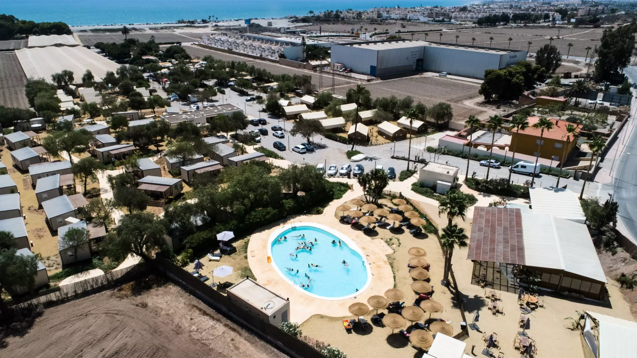Bungalow with two bedrooms, one with a double bed and the other with two beds with a bunk bed. Kitchen in living room area and some with terrace.