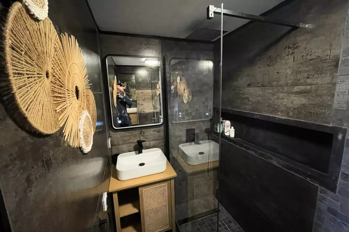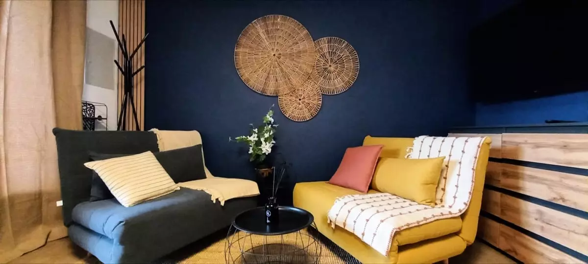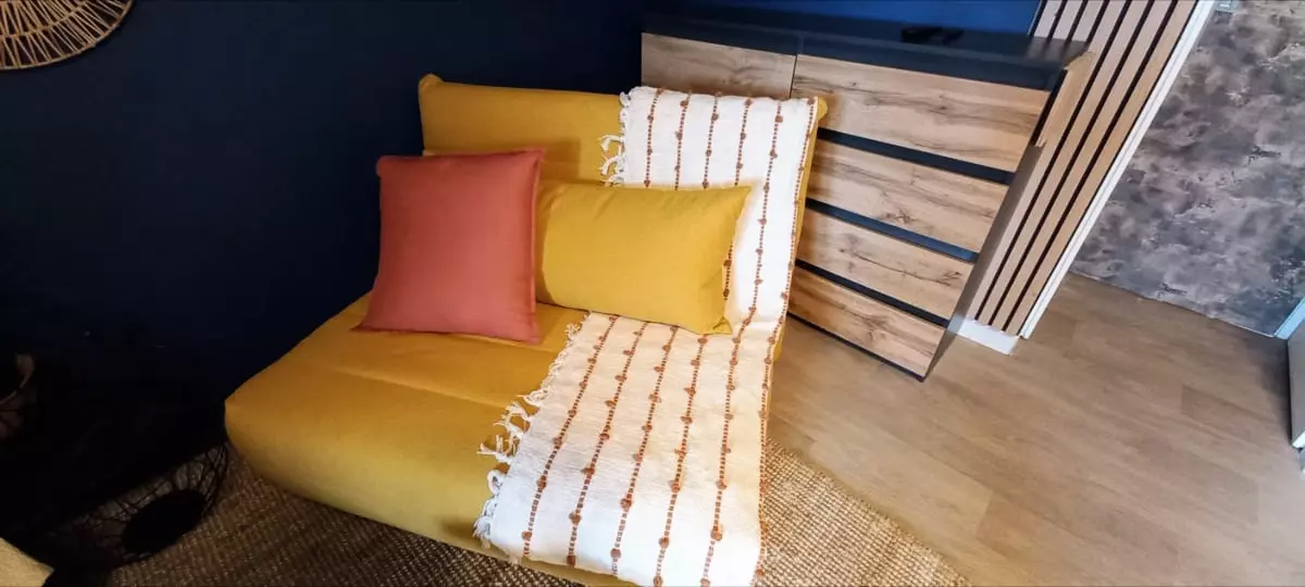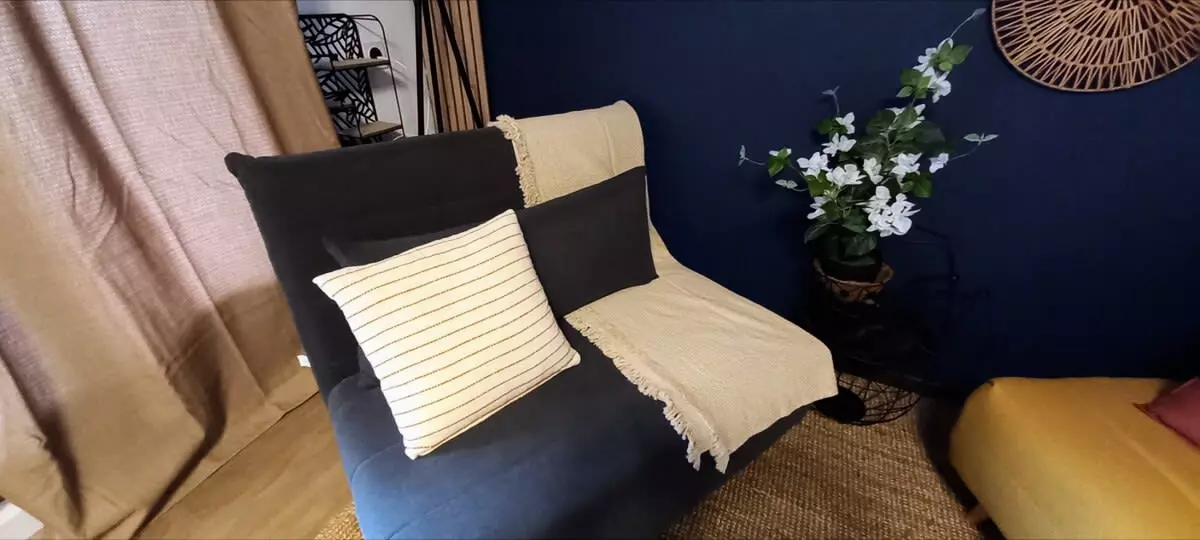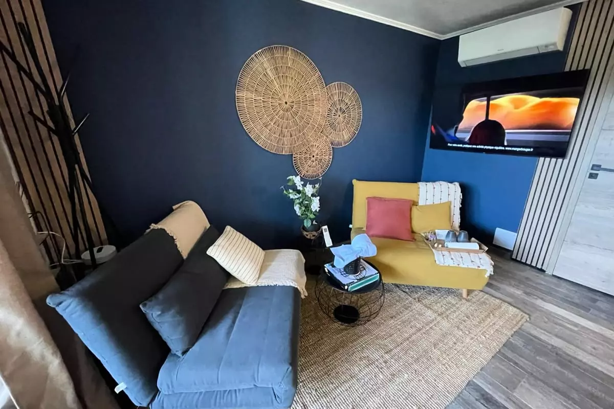 Au salon, vous trouverez 2 canapés lits une place, la télévision avec la fibre, Netflix , Amazon Prime et une commode pour ranger vos affaires.