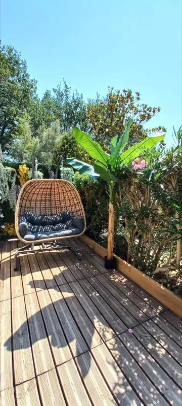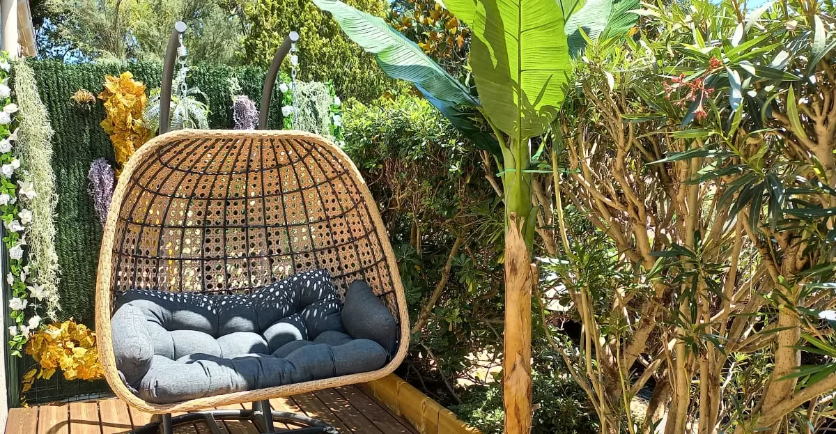 En terrasse, un salon de jardin avec son œuf double place vous attend pour vos moments détente ainsi qu'une table, 4 chaises et un barbecue pour prendre vos repas.