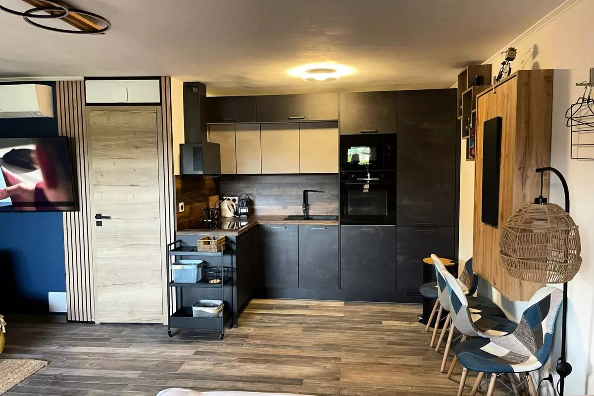 Notre petit cocon est un studio avec une cuisine, un salon, un espace nuit et une salle de bain avec baignoire.
