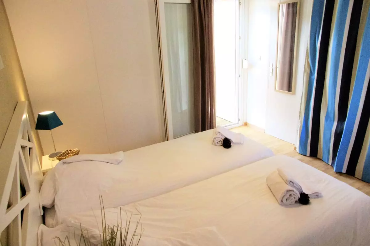Elle fait 36 mètres carrés, dispose une terrasse meublée, comprend une chambre avec plusieurs rangements et peut accueillir jusqu'à quatre personnes.