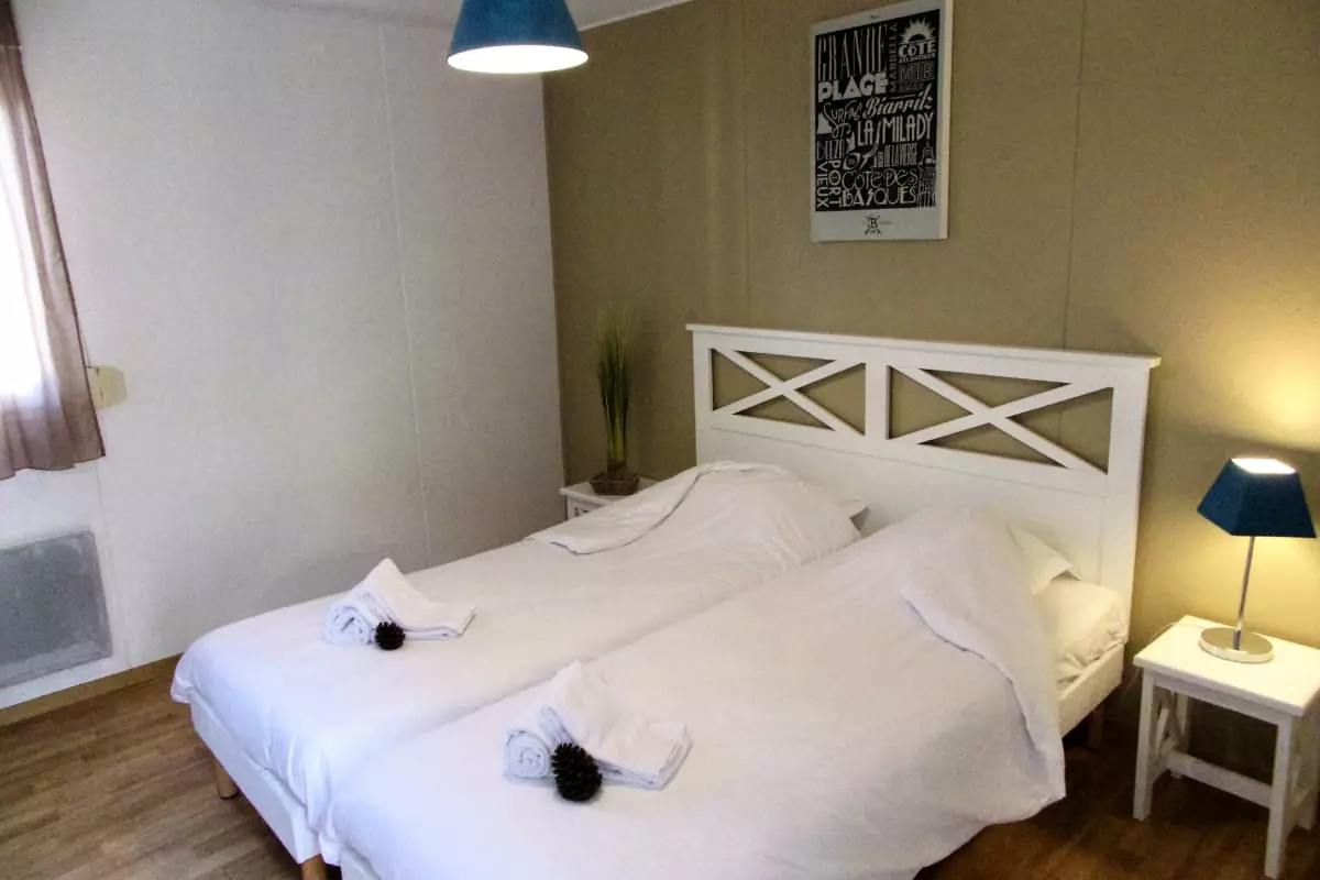 Elle comprend une chambre avec deux lits simples ; une salle de douche ; une cuisine équipée ; et un salon avec un canapé convertible donnant sur la terrasse meublée.