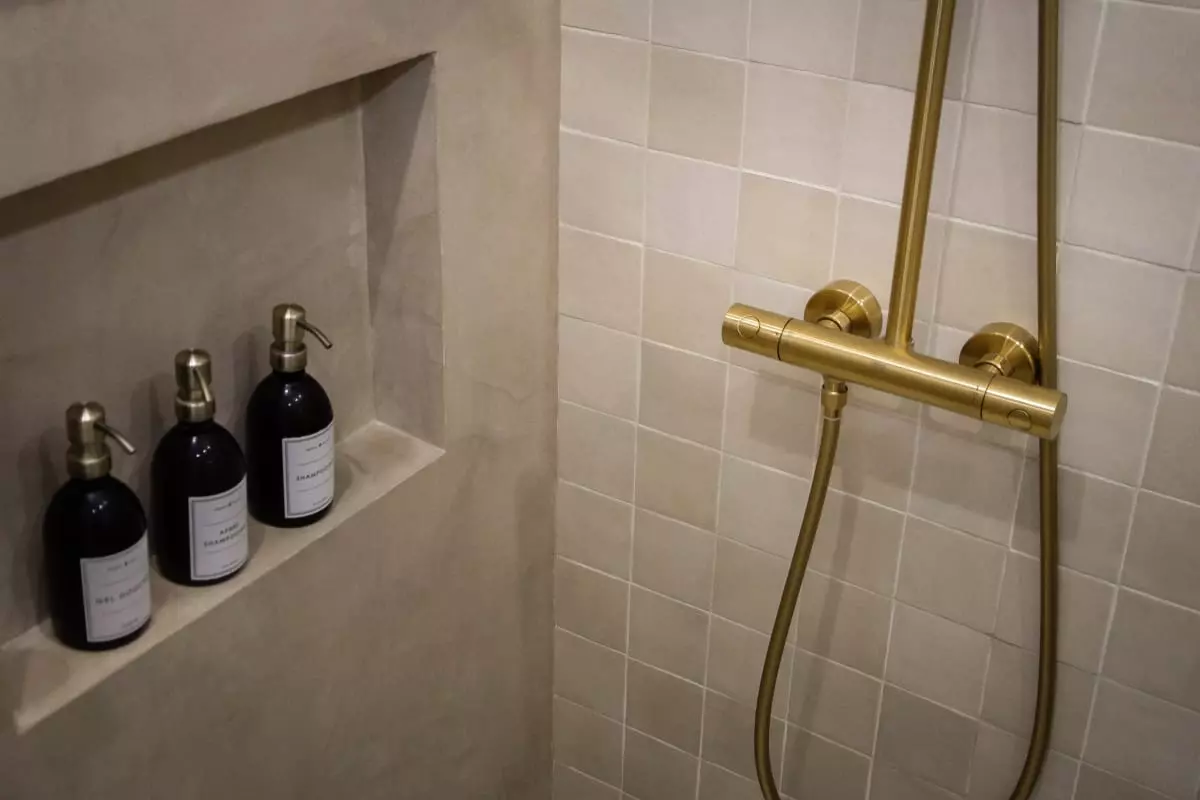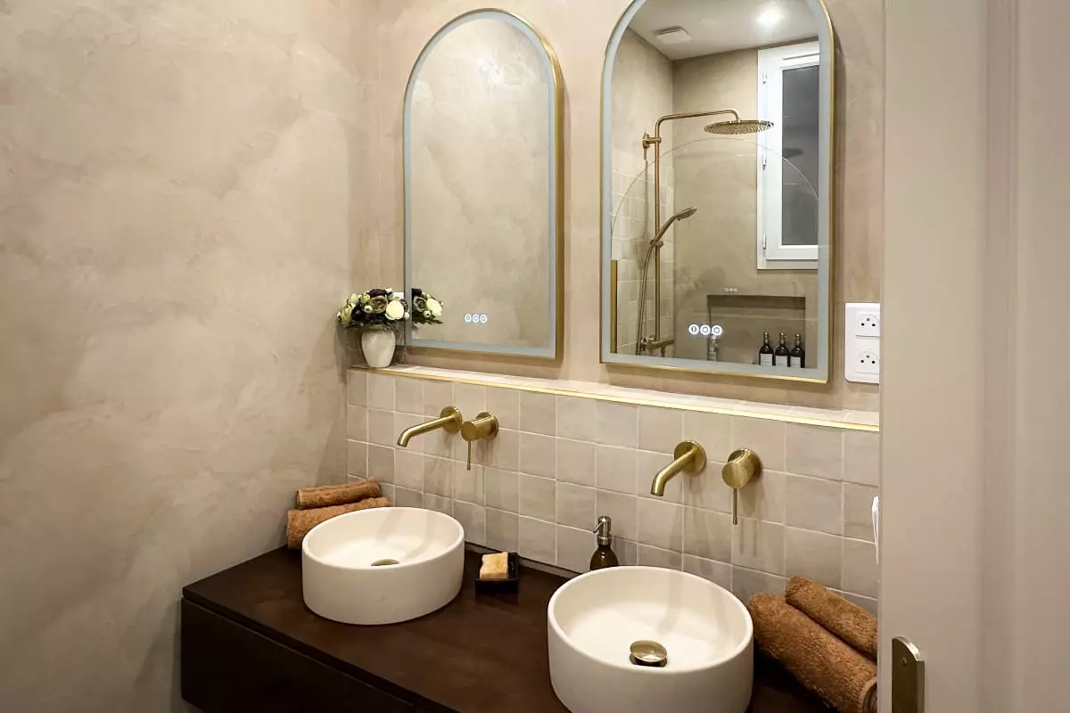La salle de bain dispose d'une double vasque et d'une douche à l'italienne, avec un sèche-serviette. Les WC sont séparés.