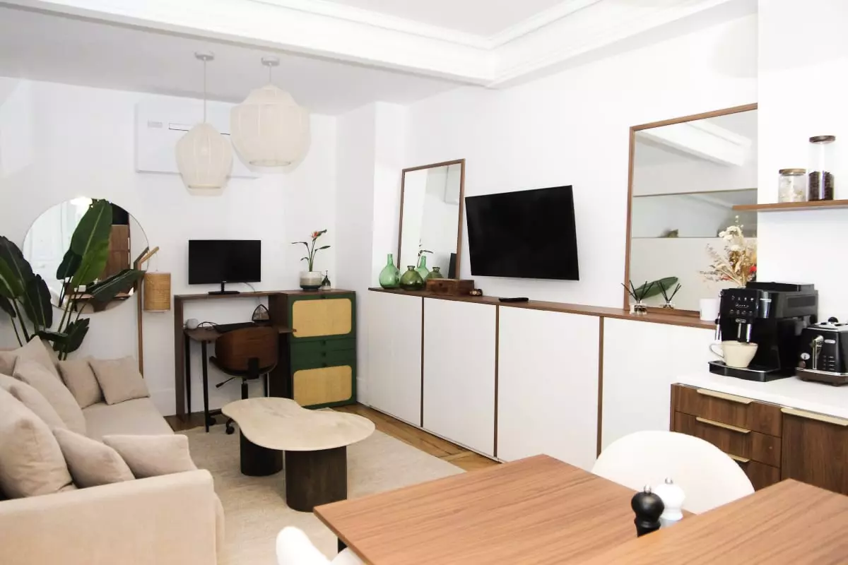 L'espace de vie spacieux, mêlant moulures d'époque et parquet ancien, se compose d'une cuisine entièrement équipée (lave-vaisselle, four, micro-onde) s'ouvrant sur un confortable séjour avec un canapé-lit pour 2 personnes (150x190 cm) et une TV connectée pour des moments de détente.