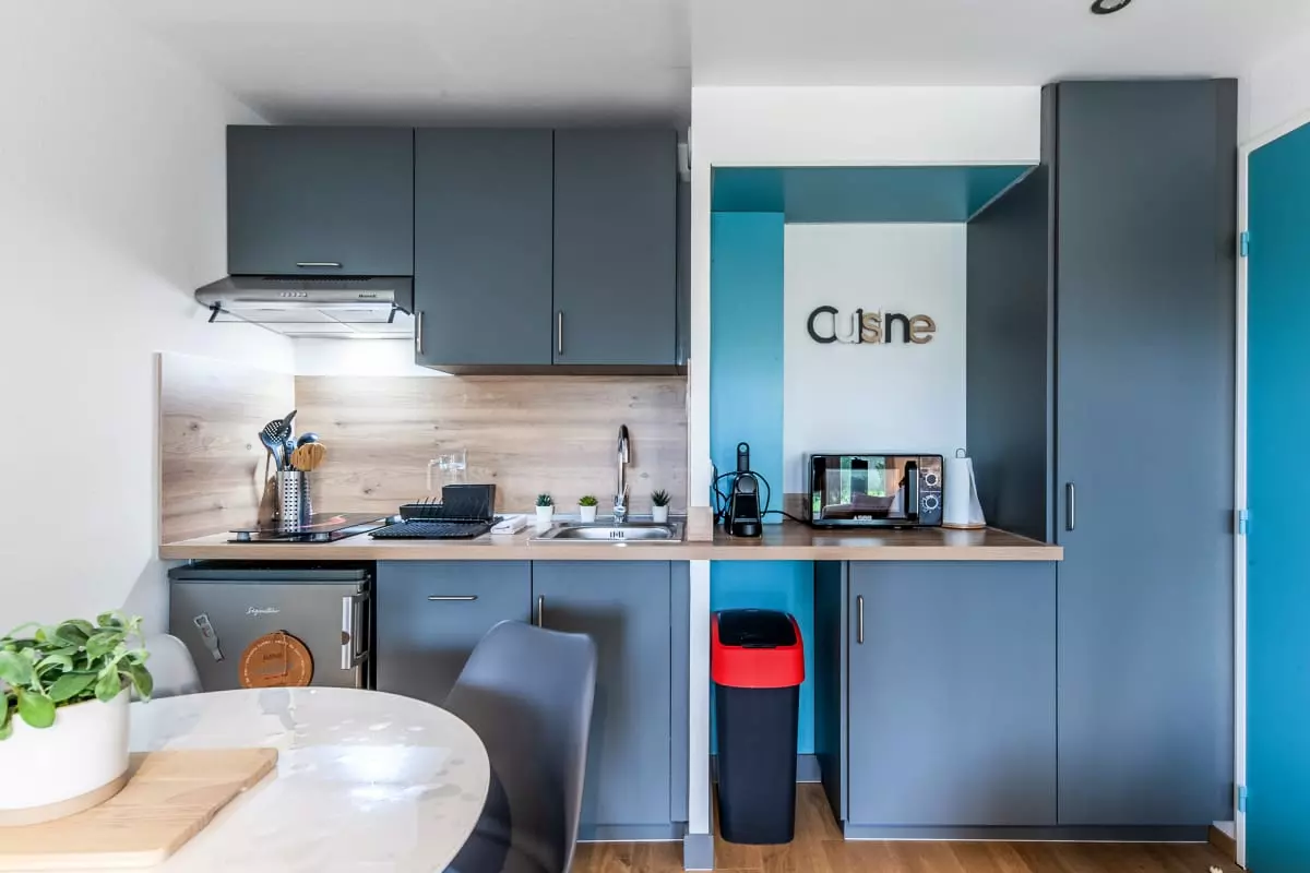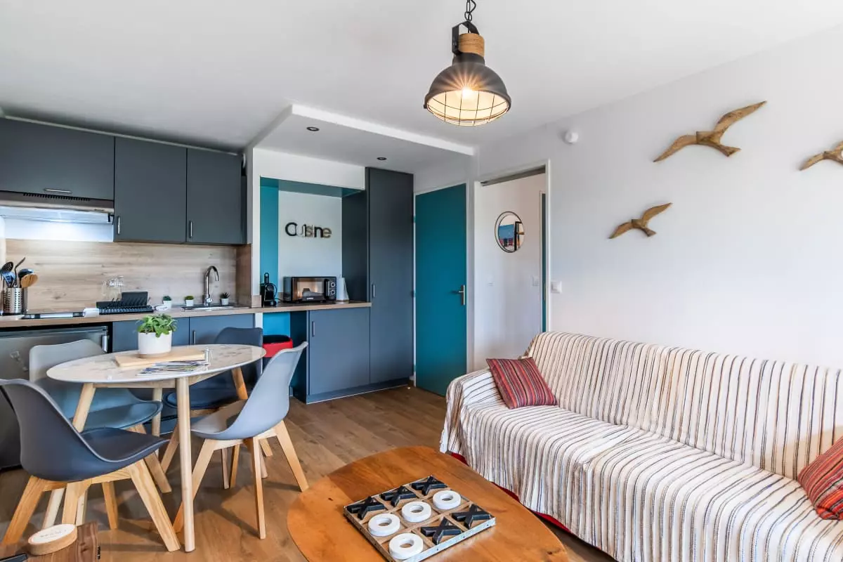 • une cuisine ouverte bien équipée (machine à café filtre, bouilloire, grille-pain, micro-ondes, frigo, lave-vaisselle, plaques de cuisson),