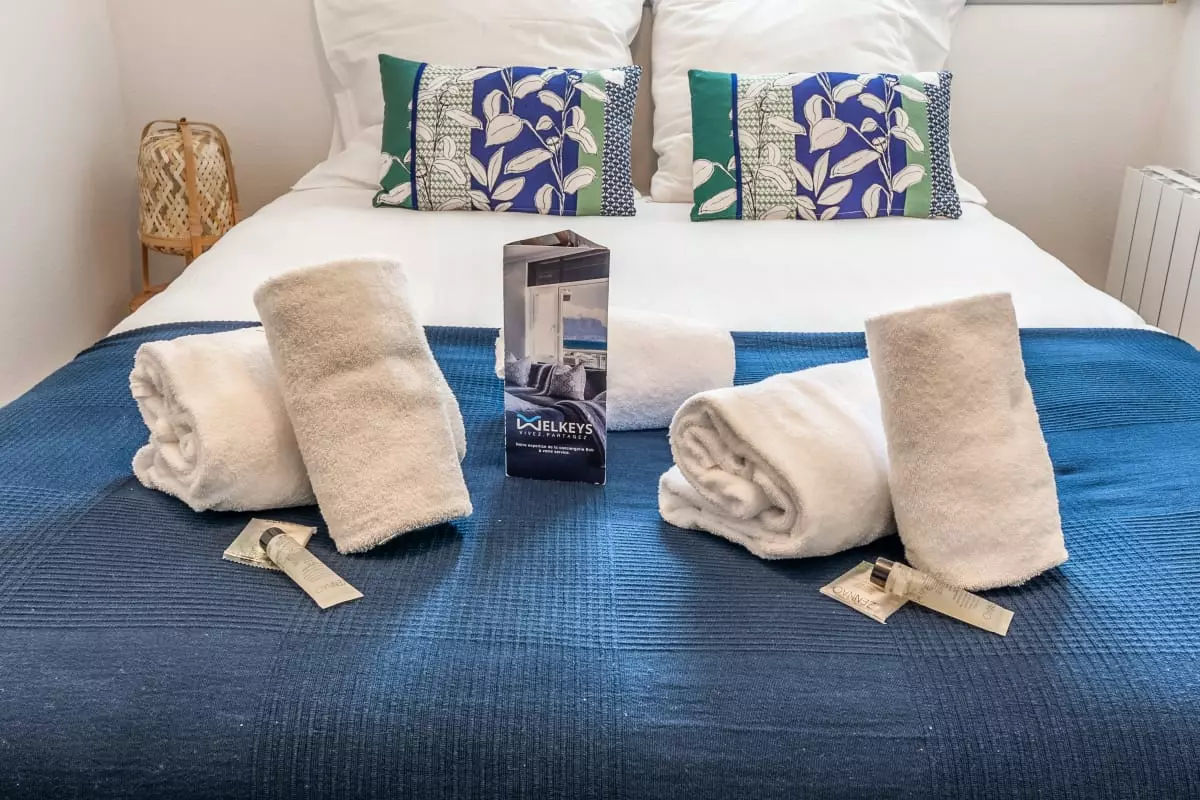 → Avant votre arrivée et après votre départ, notre équipe réalise un ménage de qualité hôtelière et met à votre disposition des serviettes de bain, du linge de lit de qualité hôtelière ainsi qu'une ligne de produits de soin naturels.
