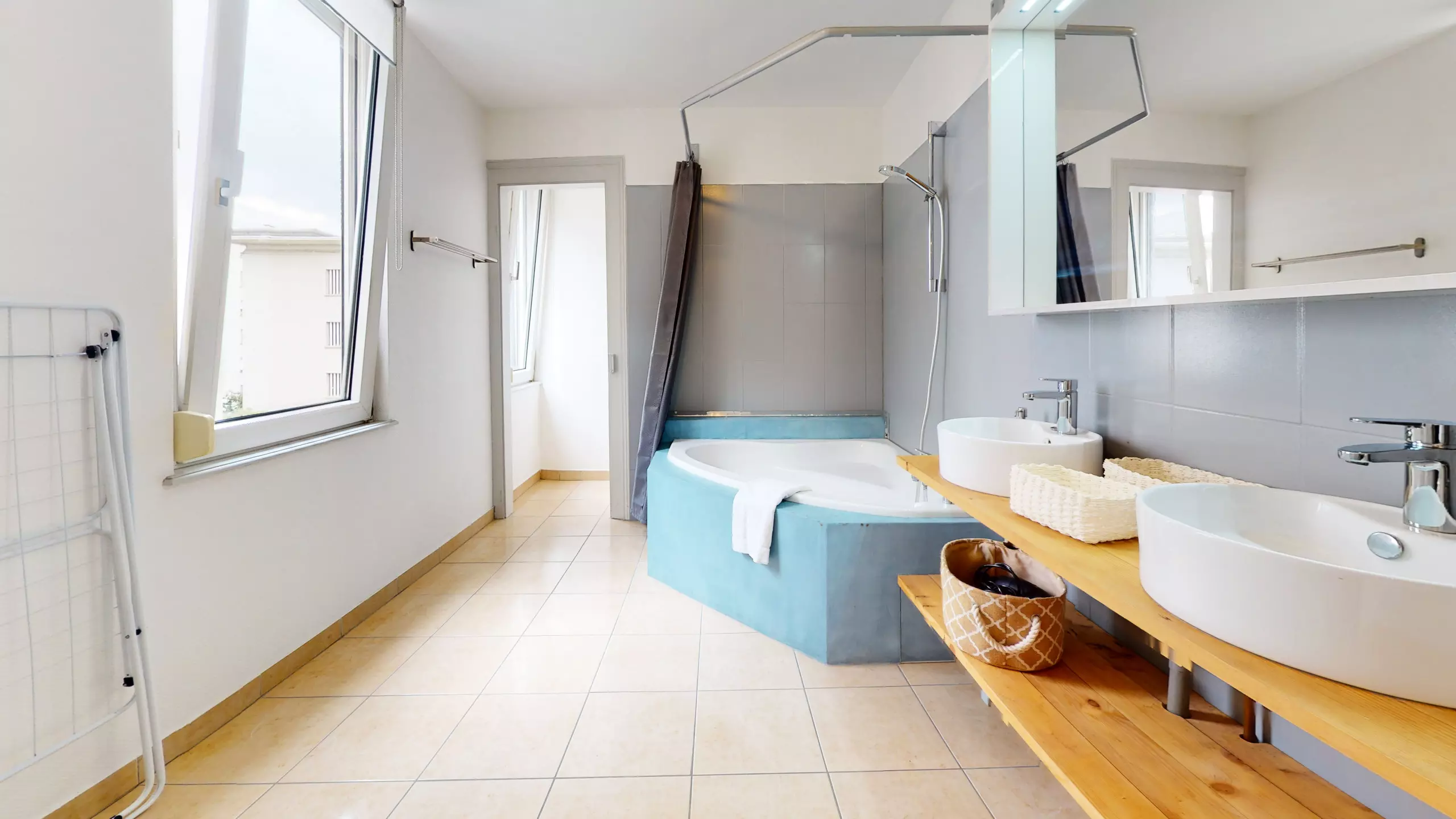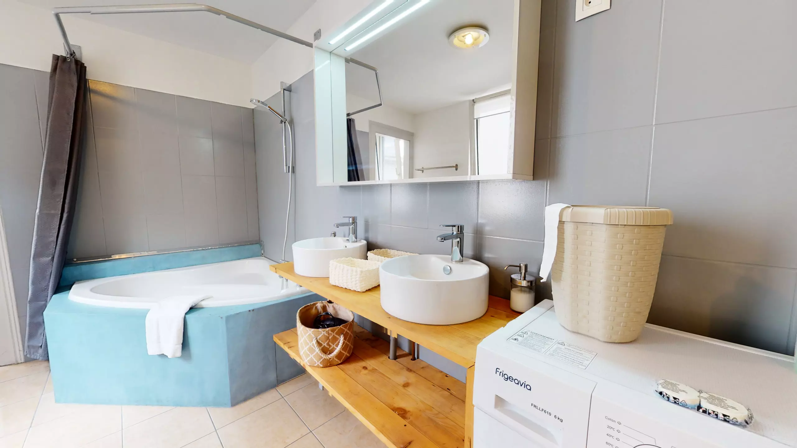 ? ?une salle de bain avec une grande baignoire d'angle, une lave-linge et toilette,