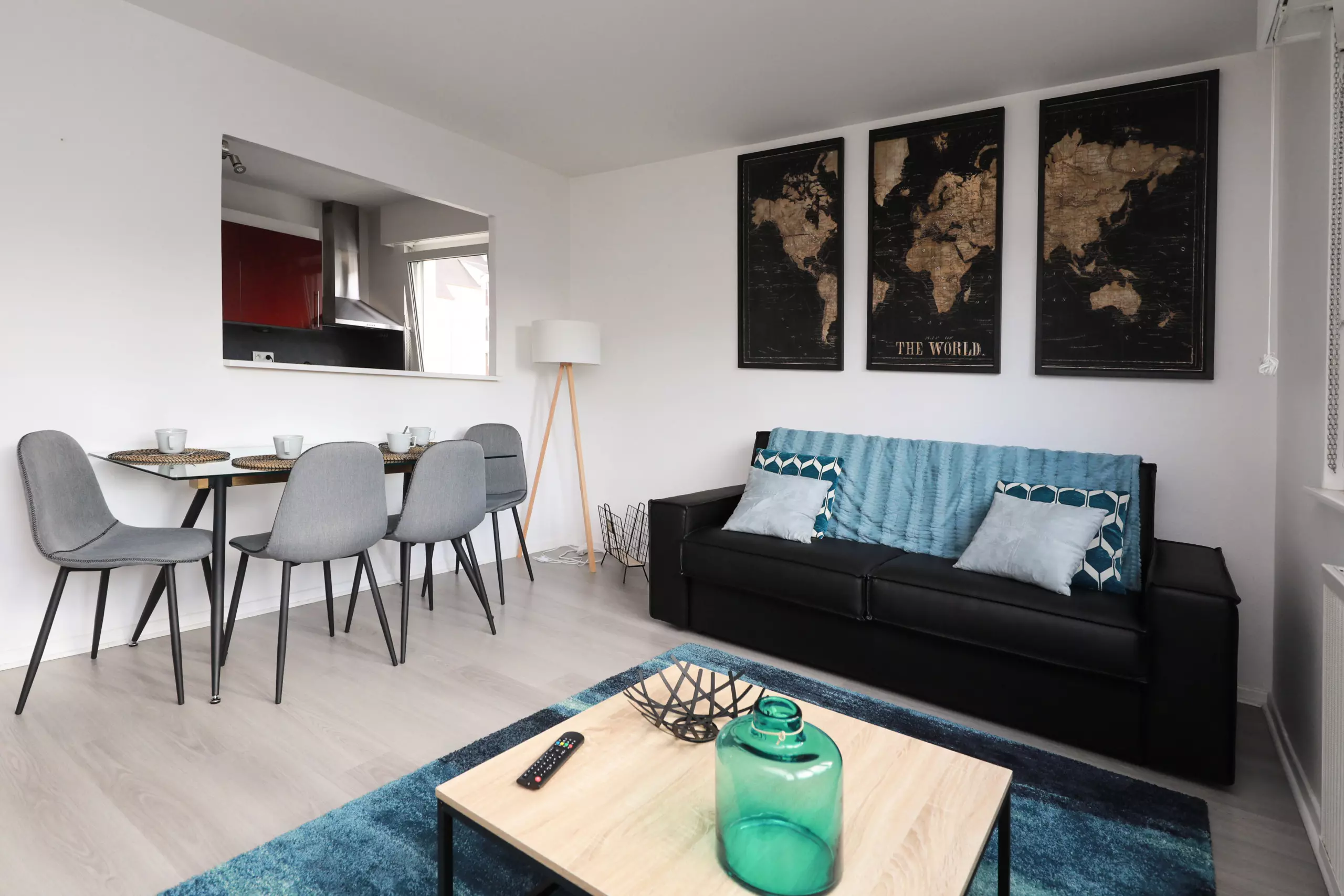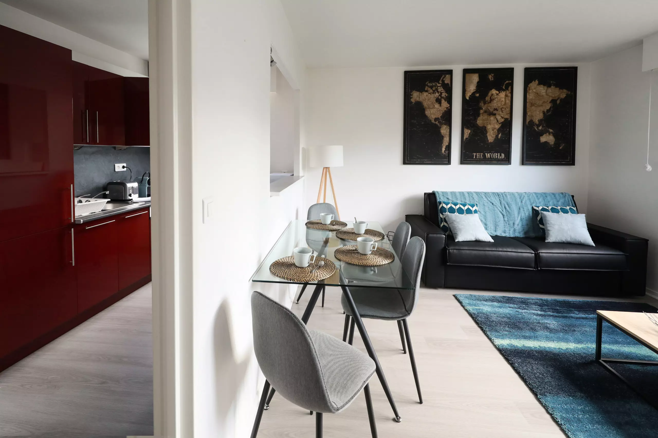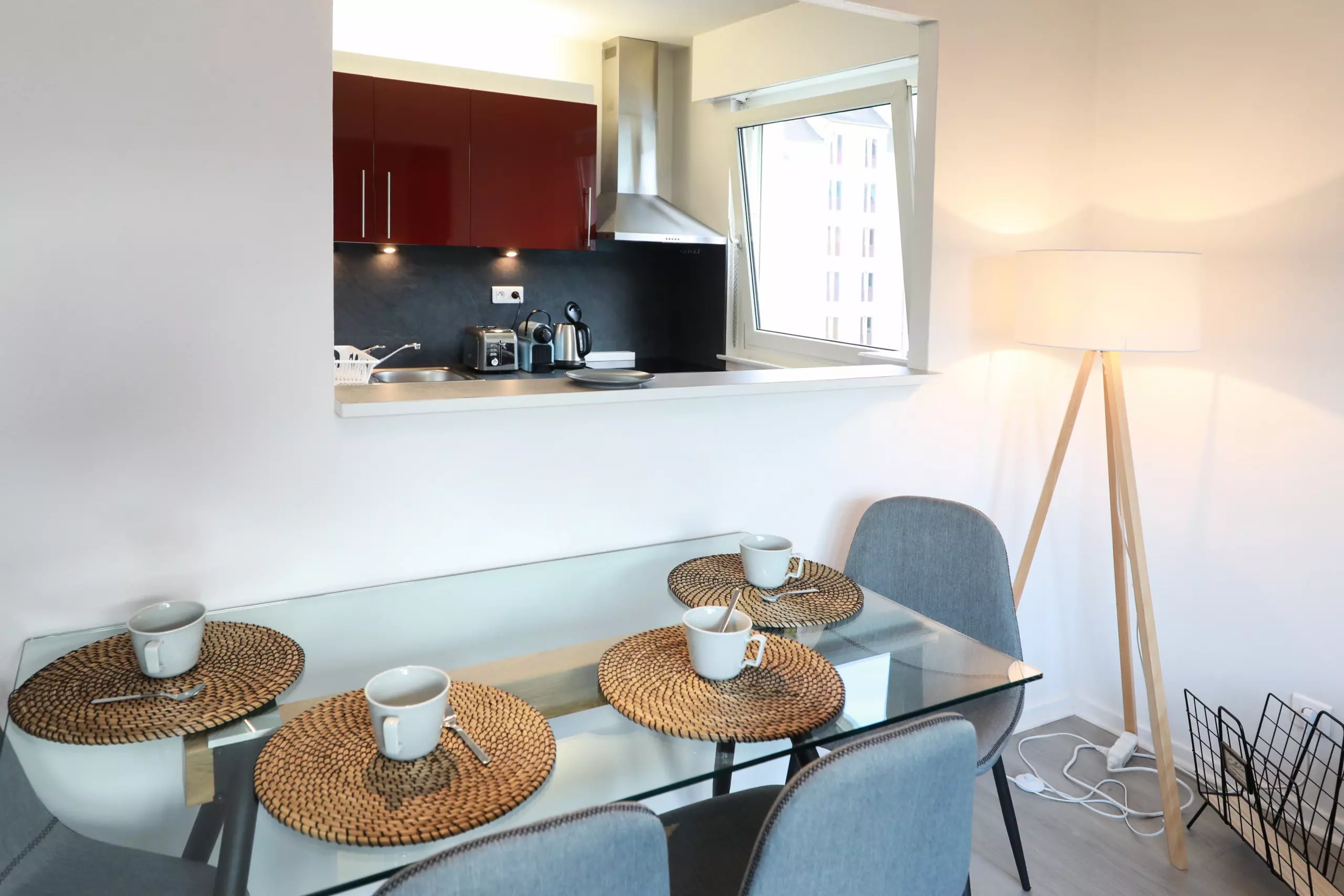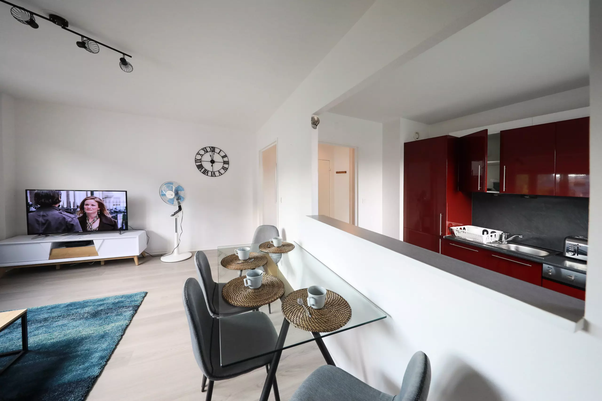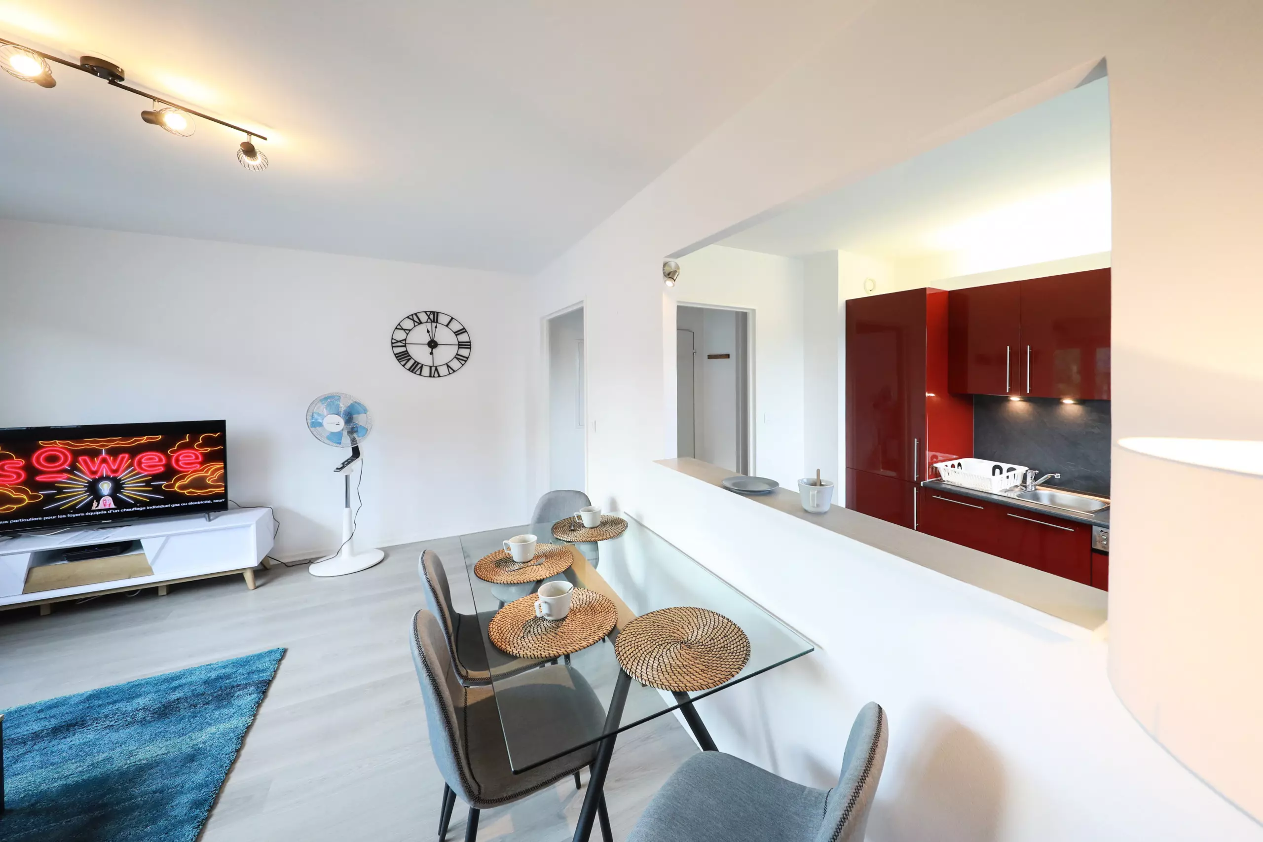?La cuisine ultra équipée ouverte sur un salon lumineux (réfrigérateur-congélateur, four, micro-onde, plaque vitrocéramique, hotte décorative, lave-vaisselle, cafetière Nespresso, bouilloire, grille-pain, poêles, casseroles, vaisselles et ustensiles de cuisine),