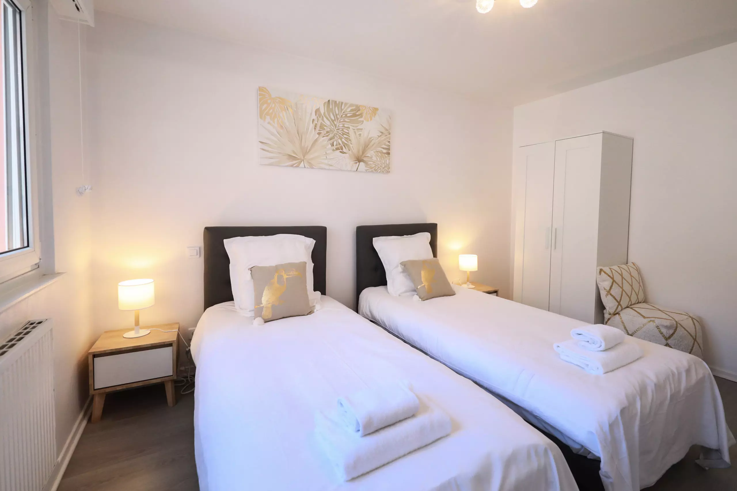 ? D'une chambre avec 2 lits, avec armoire de rangement,