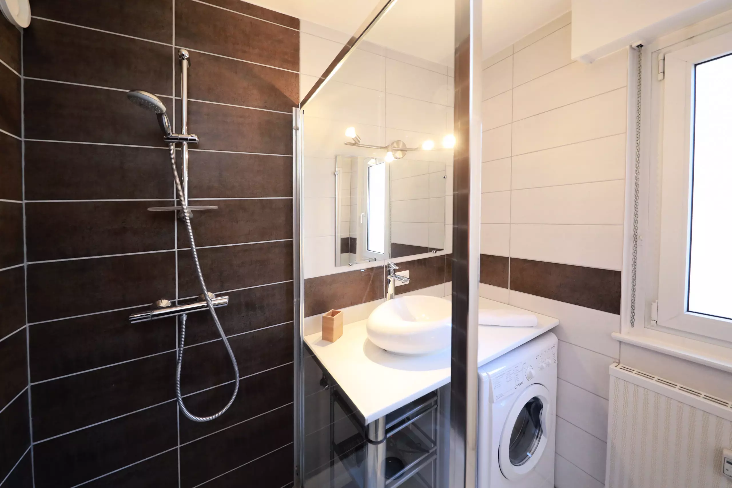 ?D'une la salle de bain attenante à la chambre, avec une douche à l'italienne et un lave-linge séchant,