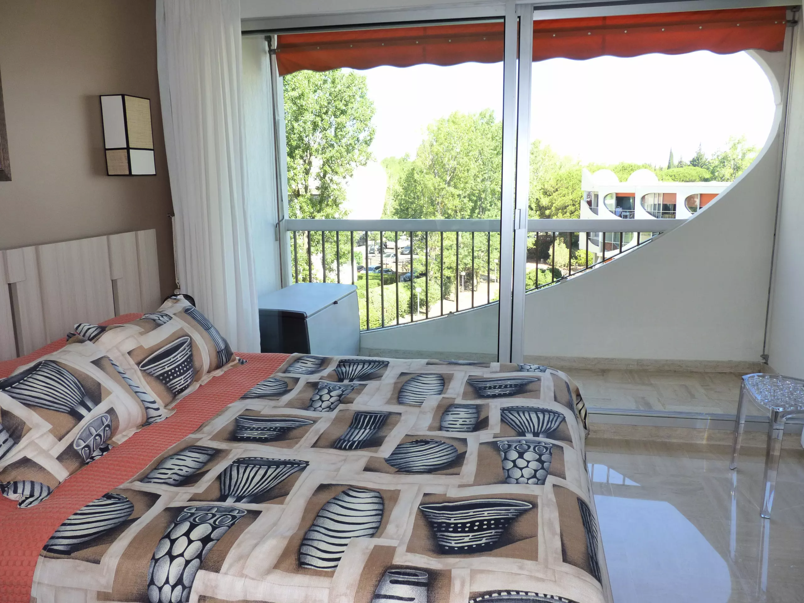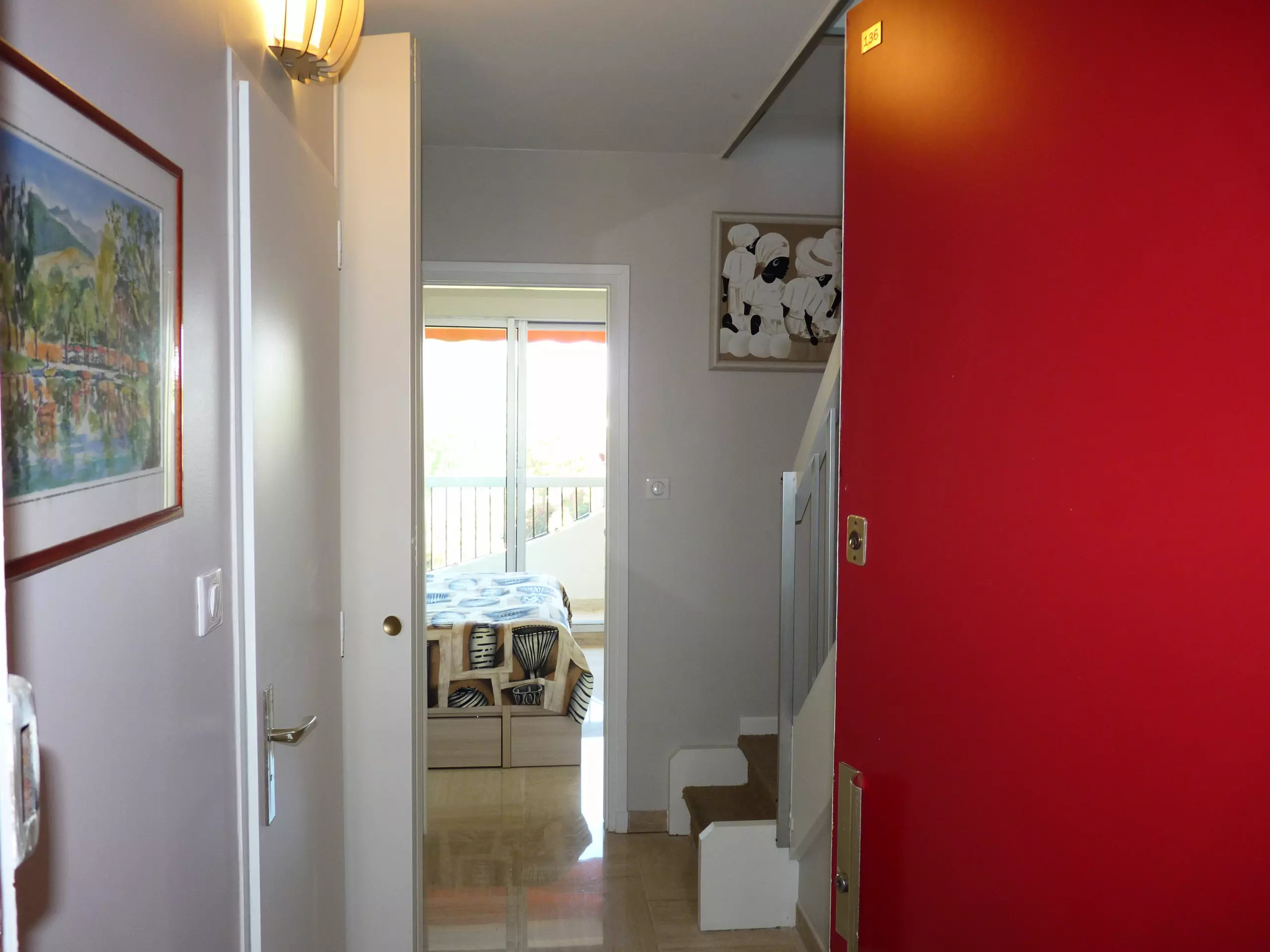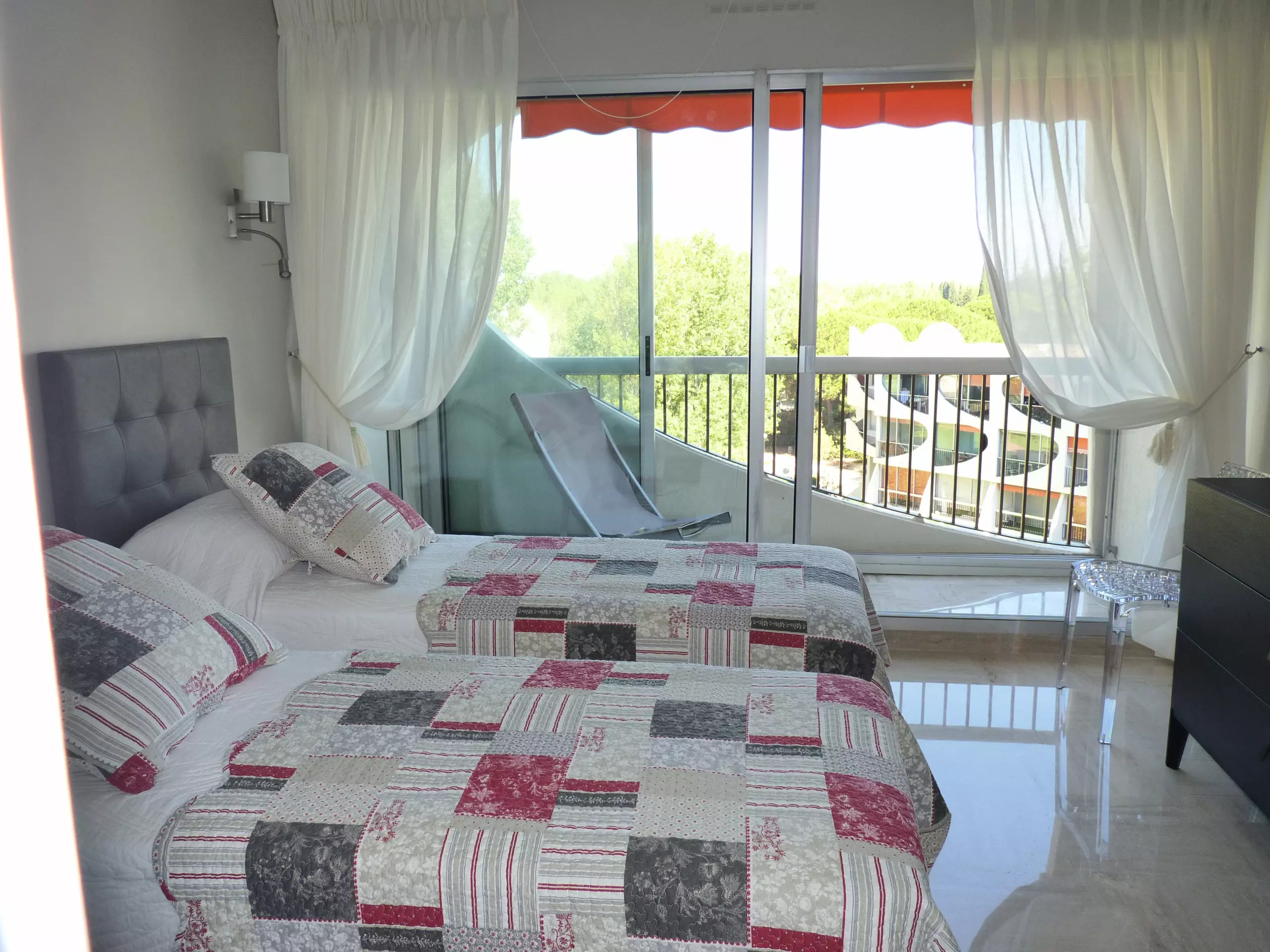 L'entrée de cet appartement de luxe à La Grande Motte est située au 3ème étage qui dessert une chambre spacieuse avec un grand lit dressing et véranda donnant sur la verdure, une salle d'eau avec WC et des placards.