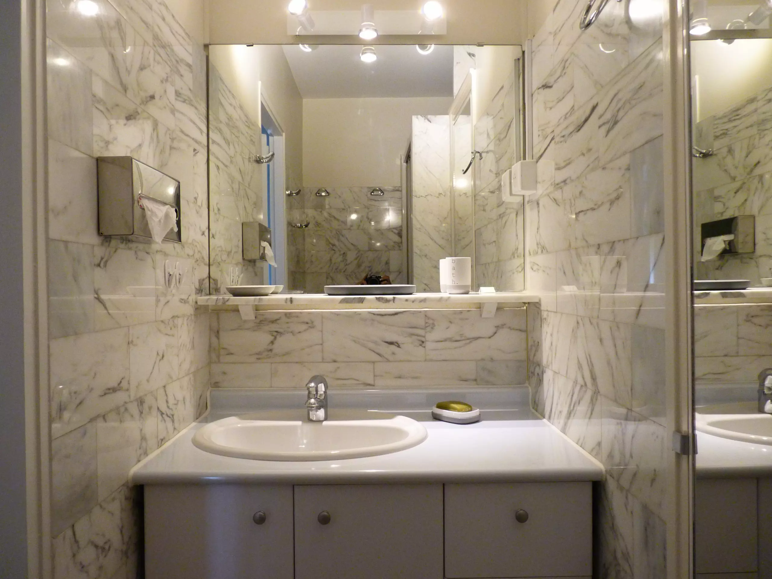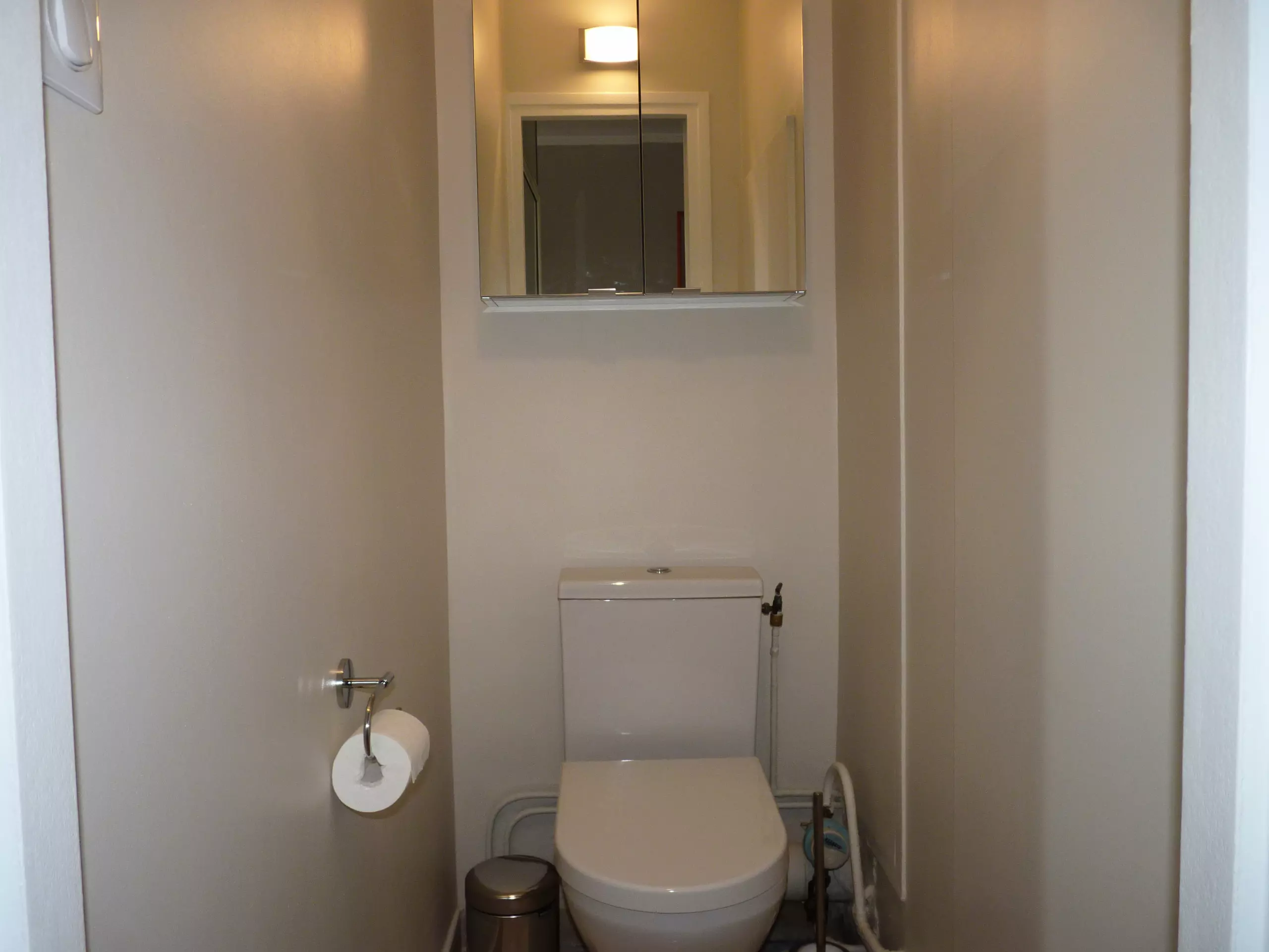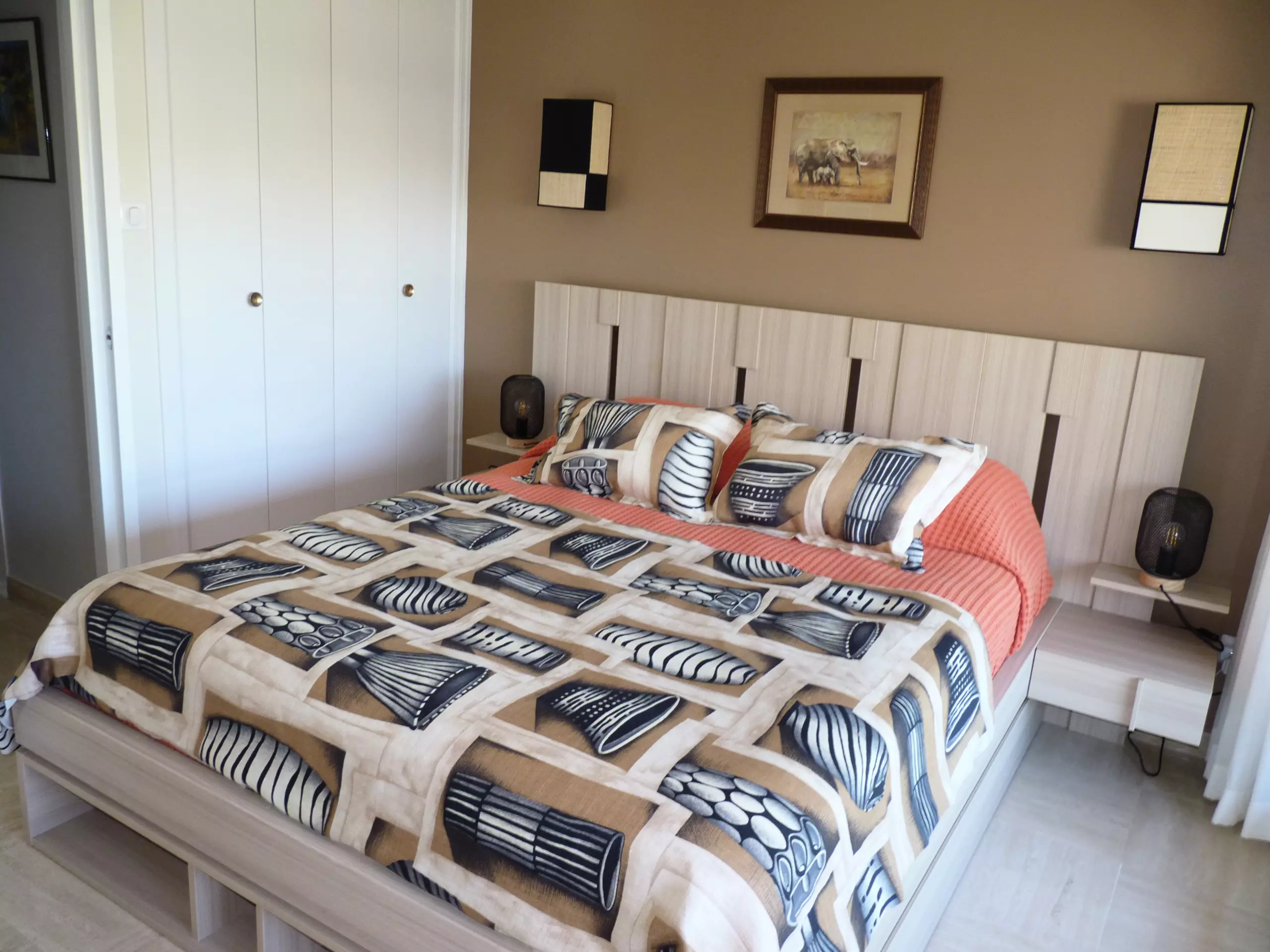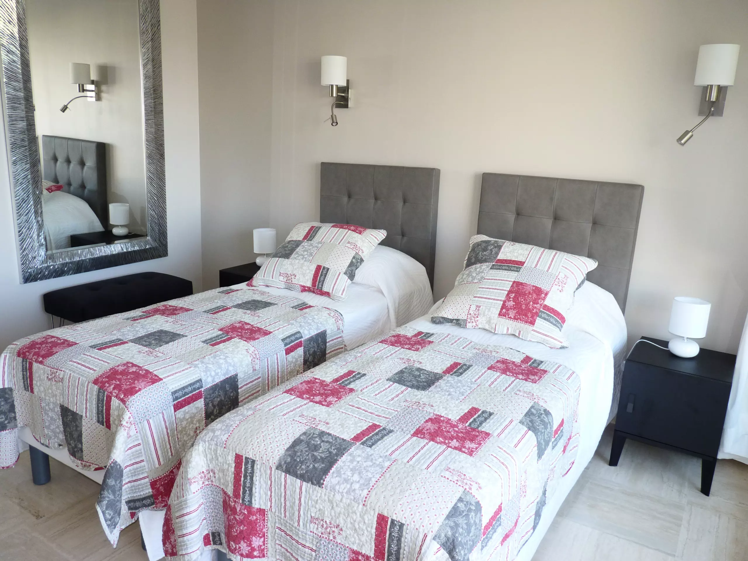 L'entrée de cet appartement de luxe à La Grande Motte est située au 3ème étage qui dessert une chambre spacieuse avec un grand lit dressing et véranda donnant sur la verdure, une salle d'eau avec WC et des placards.
