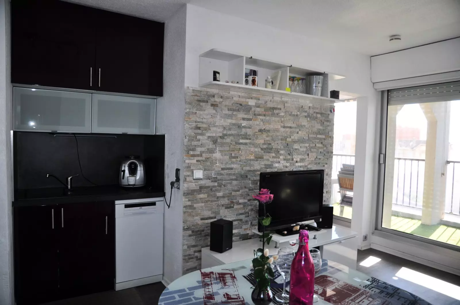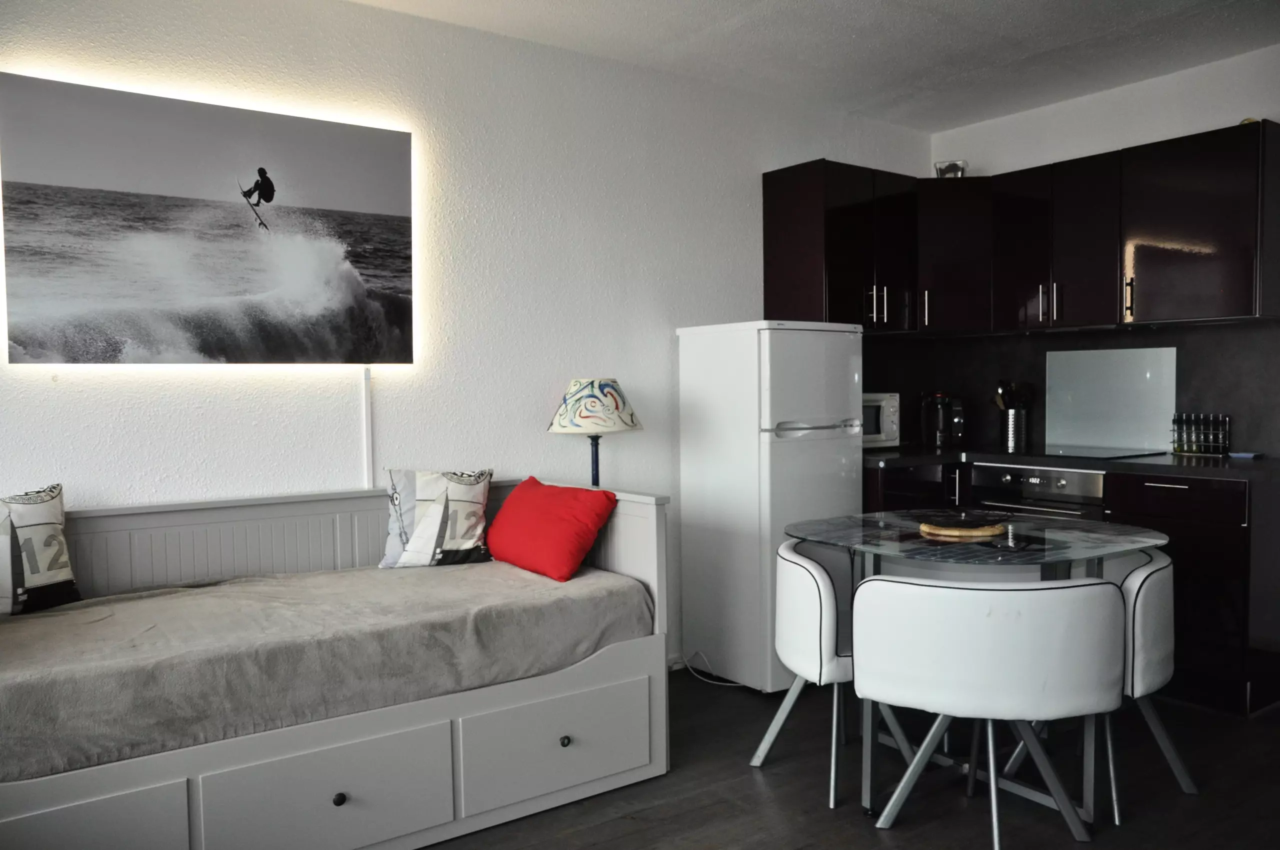 SEJOUR avec PARTIE CUISINE : table - chaises - canapé lit (2 personnes) - TV