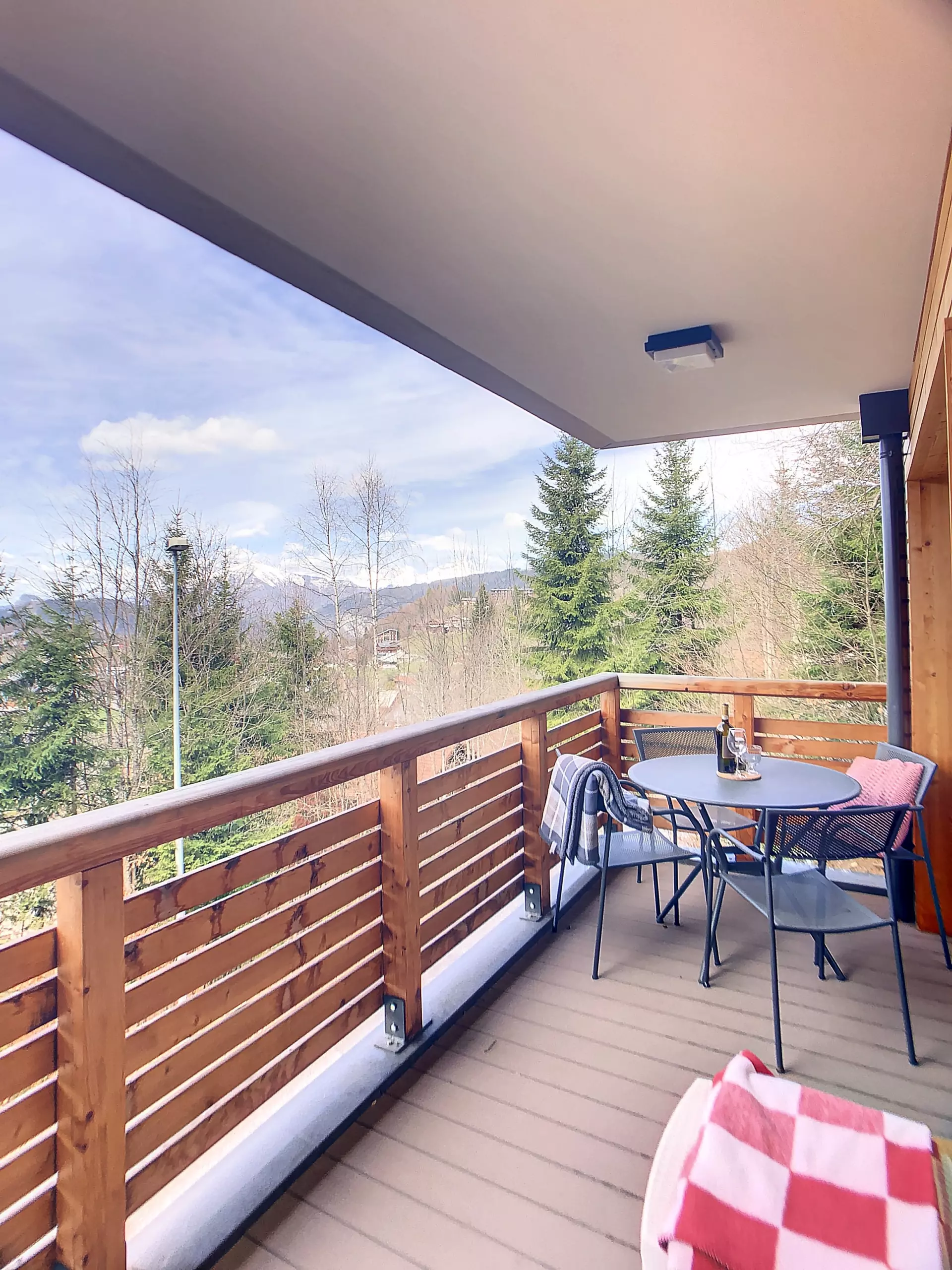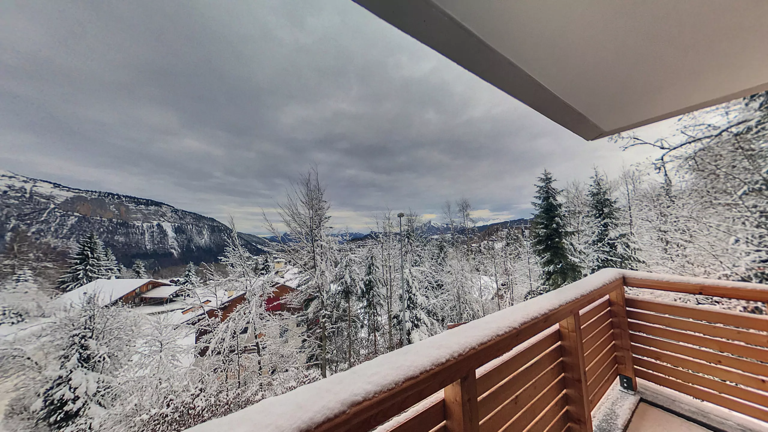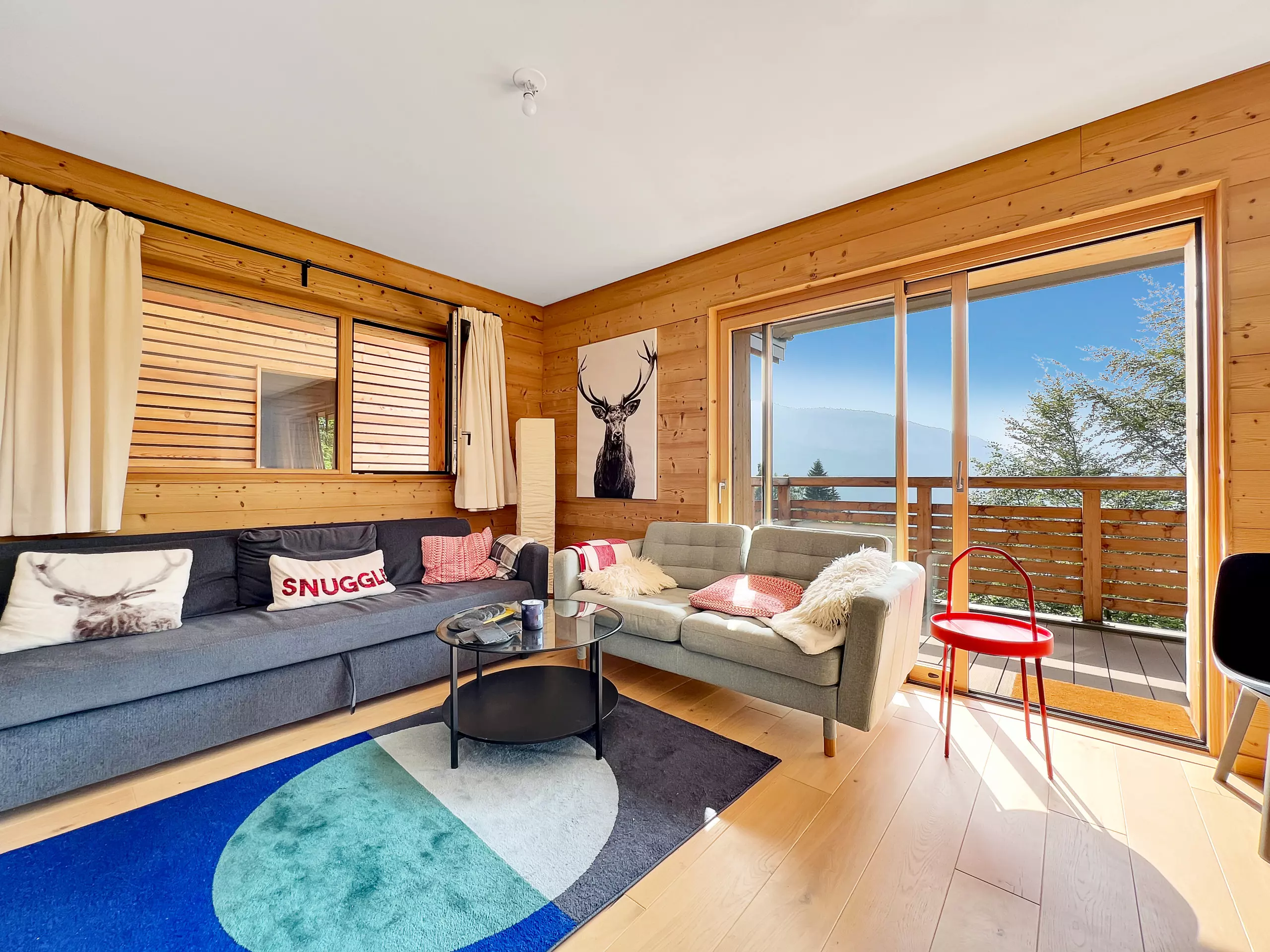 Le séjour salon de 28 m² donnant sur un grand balcon avec une vue magnifique sur la vallée
