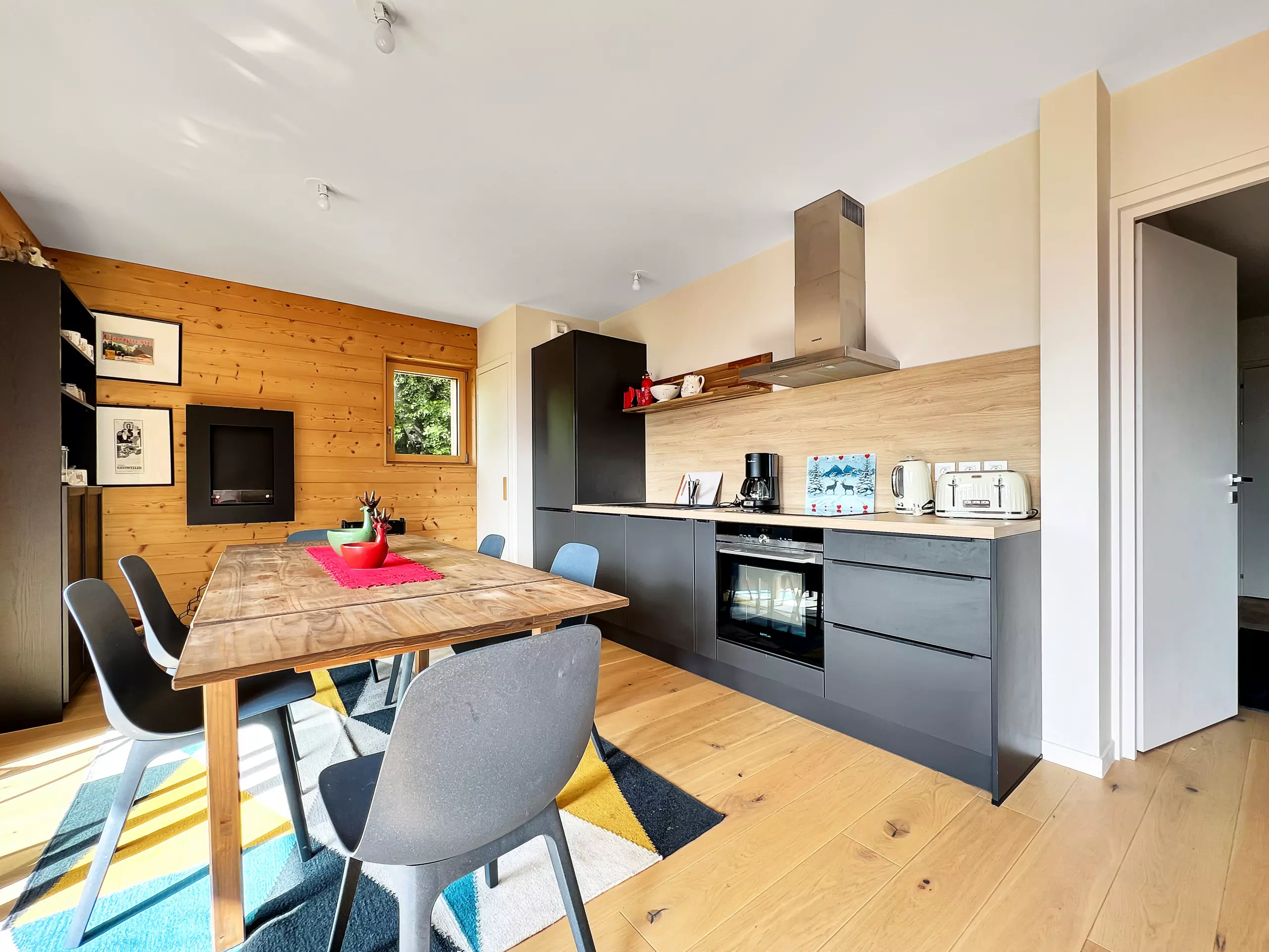 La cuisine totalement équipé avec 3 plaques inductions, hotte, lave vaisselle, lave linge séchant, grand réfrigérateur avec compartiment congélation. 2 casiers à skis n°37 et n°38.