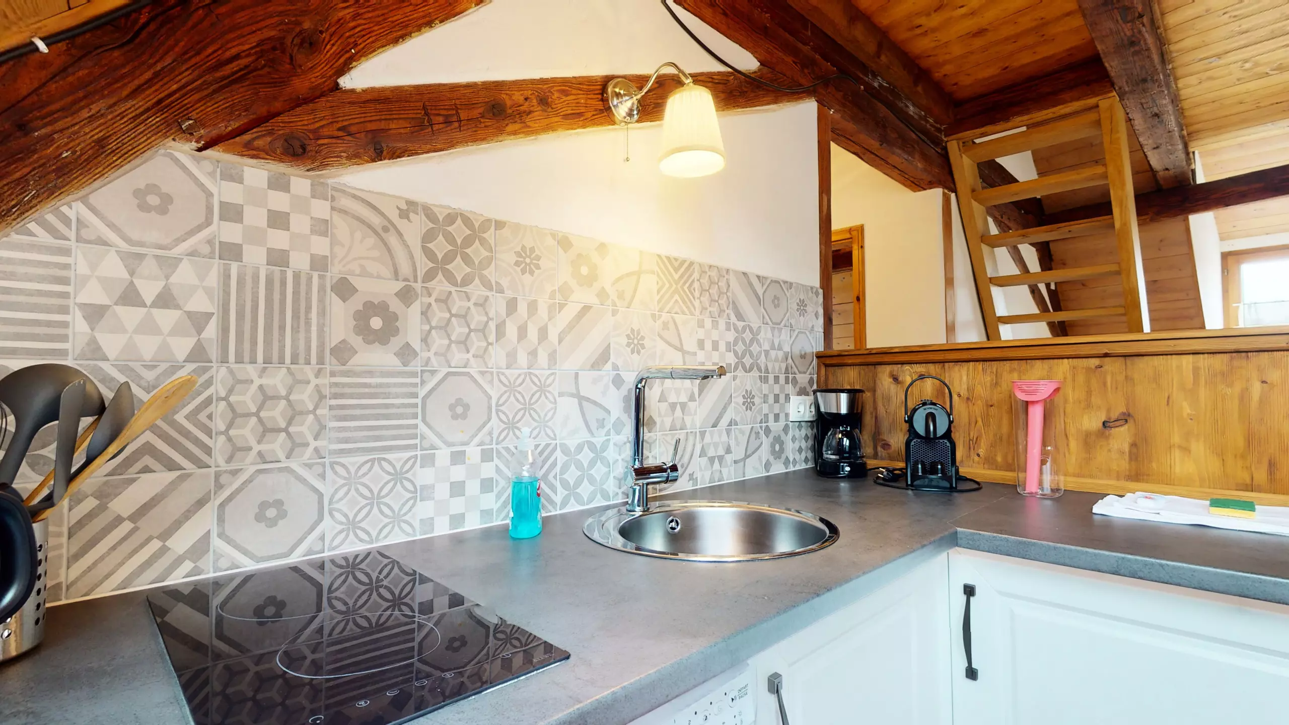 ?D'un espace de vie ouvert avec ? un coin salon/télévision, ? un coin repas pour partager un bon repas, et ? d'une cuisine équipée (plaque de cuisson, réfrigérateur, lave-vaisselle, micro-onde, bouilloire, grille-pain, cafetière Nespresso),