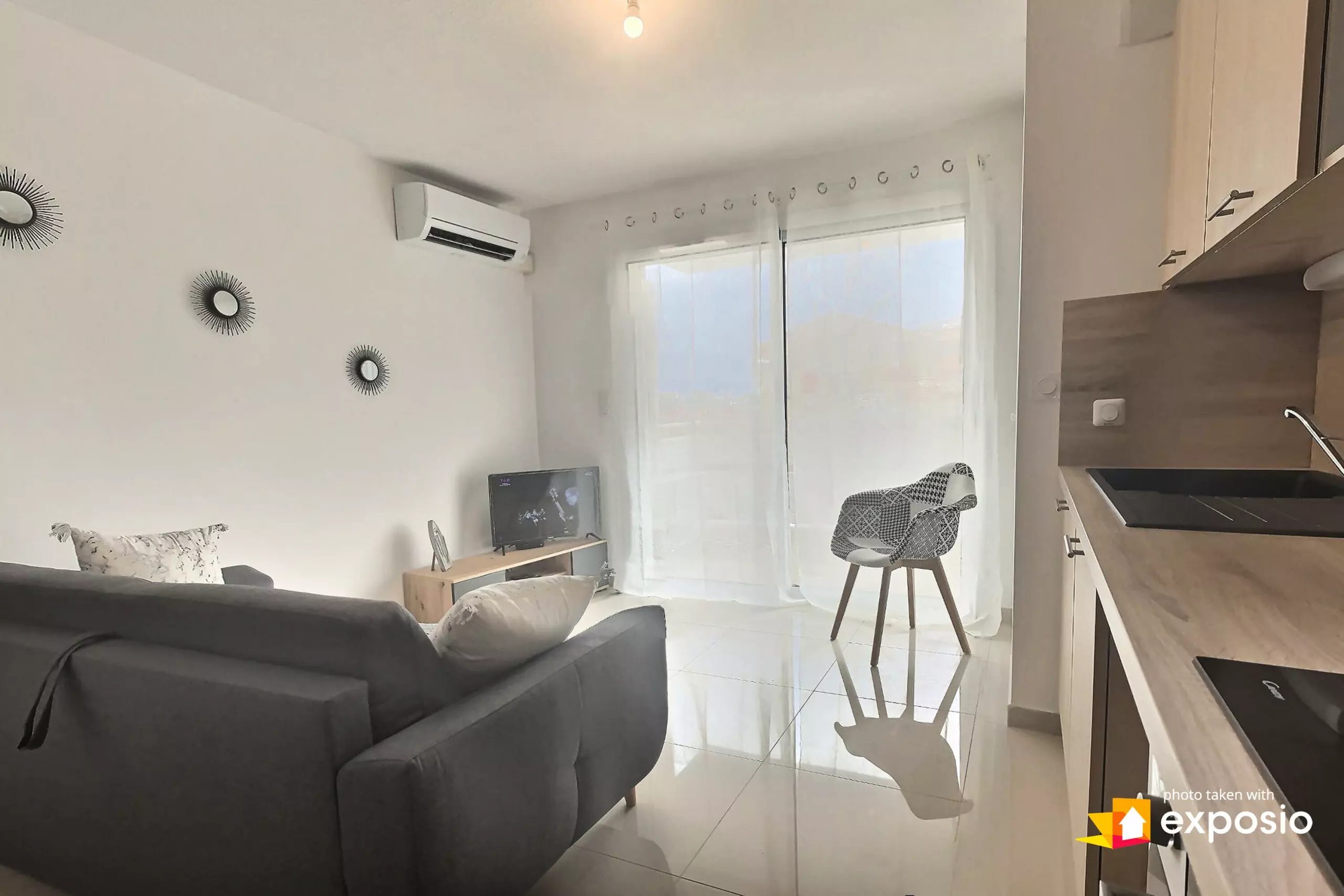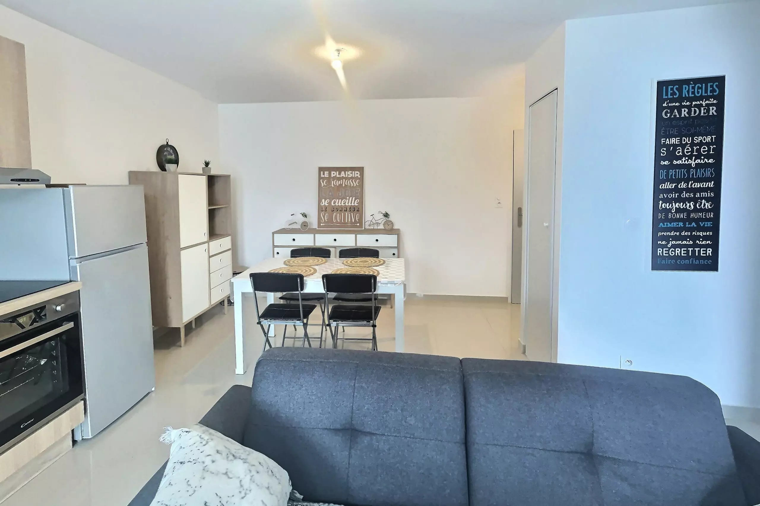 Composé d'une pièce de vie avec un canapé convertible, d'une chambre avec un lit en 140, une salle de bain avec WC et une terrasse avec mobilier d'extérieur.