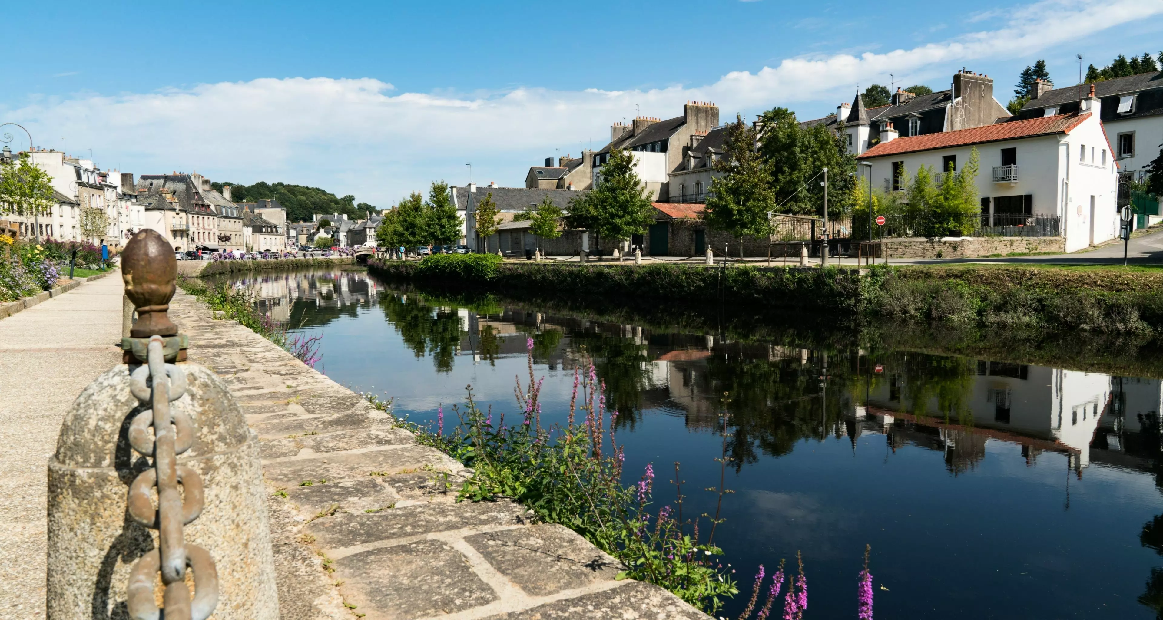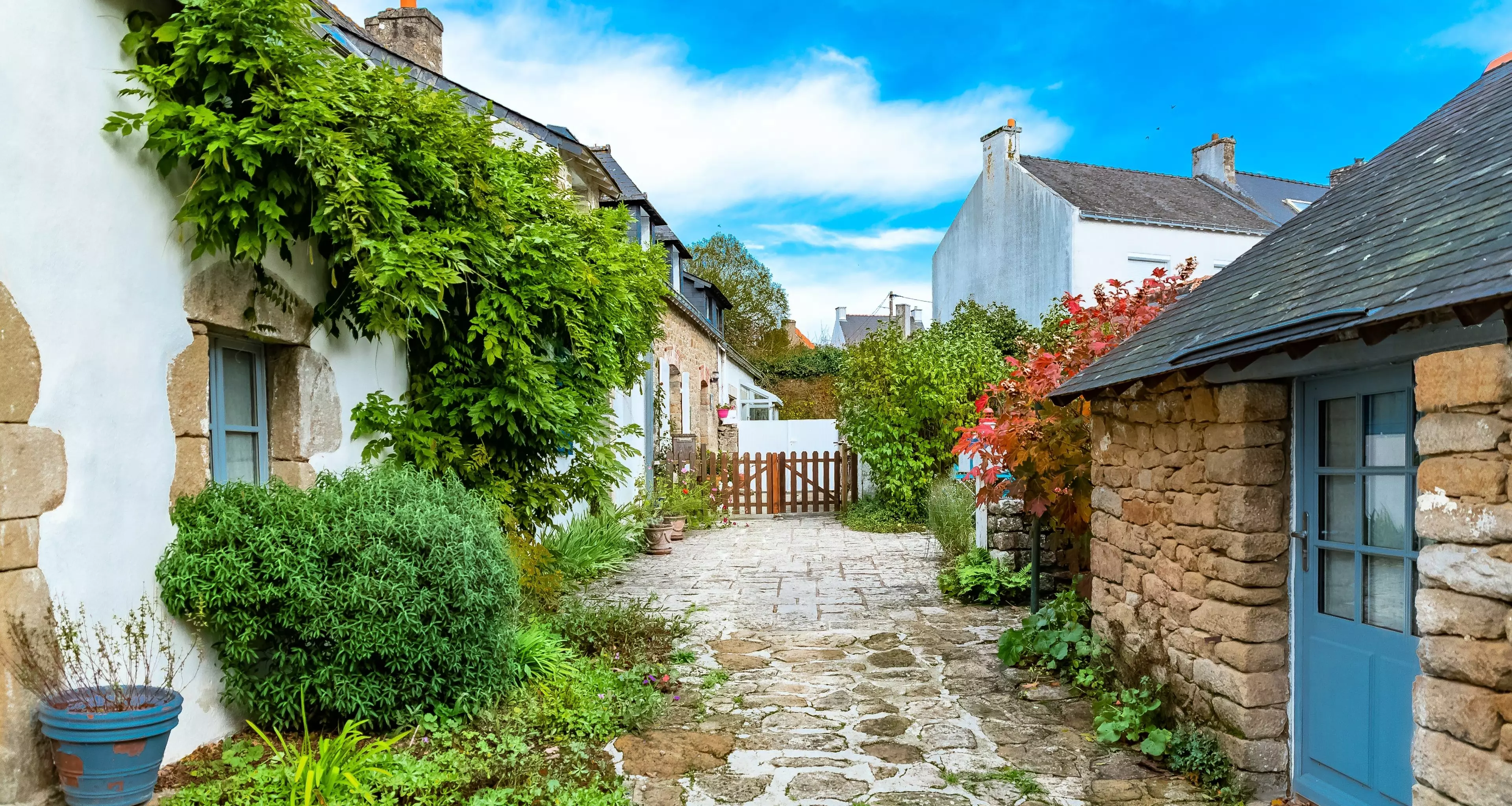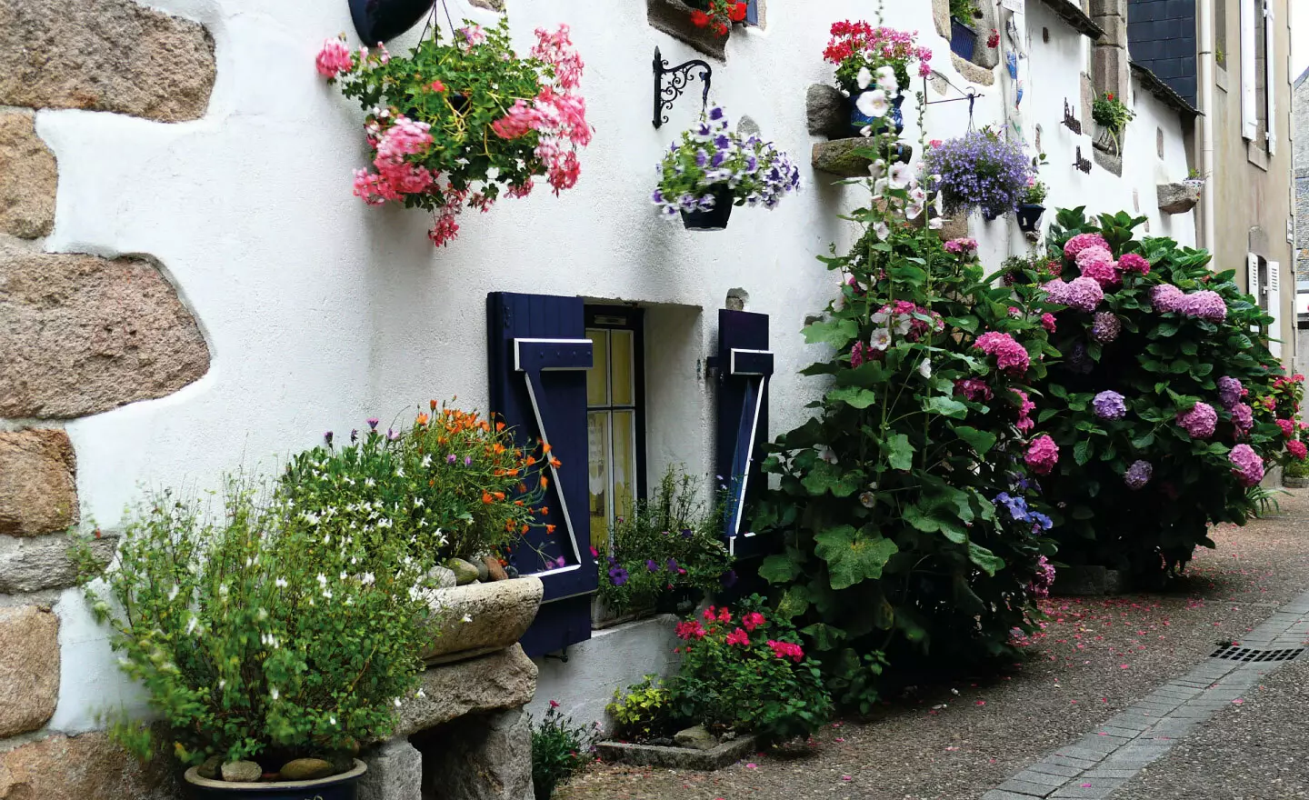 avec une architecture aux accents bretons dans des petites ruelles pavées bordées de roses trémières et d'hortensias.