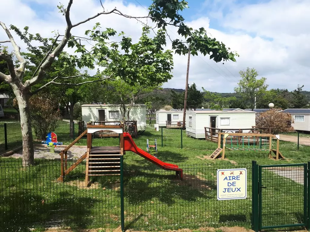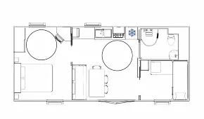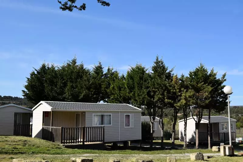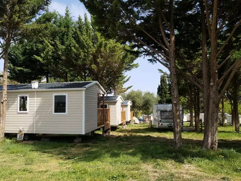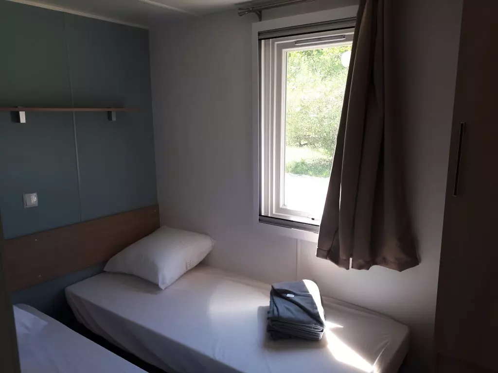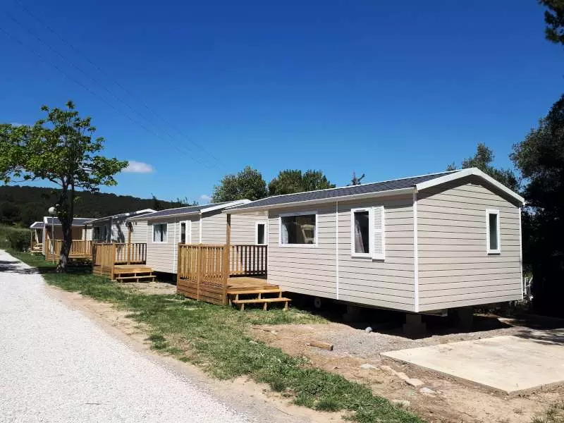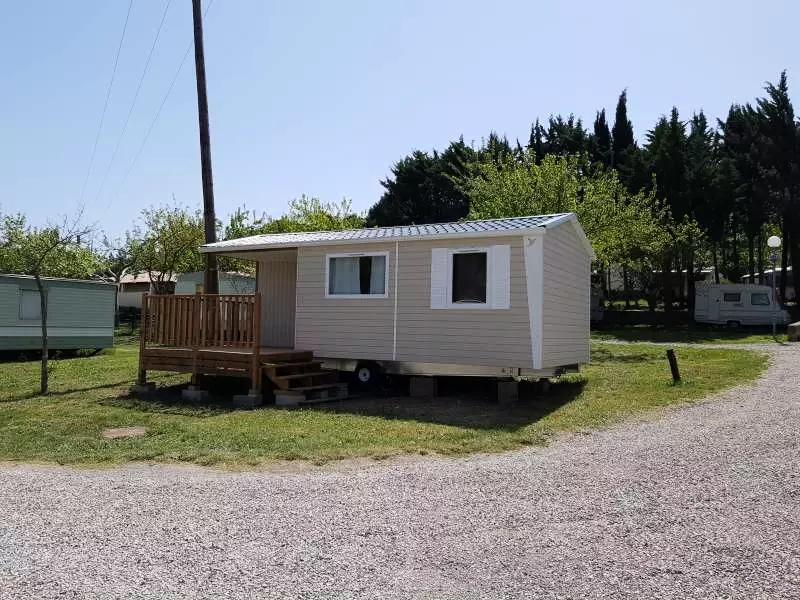 Mobil home pour 4 personnes, composé d'un salon, d'un coin cuisine équipé, d'une chambre avec un lit double, d'une chambre avec 2 lits simples, d'une salle de douche, de WC séparés, d'une terrasse.