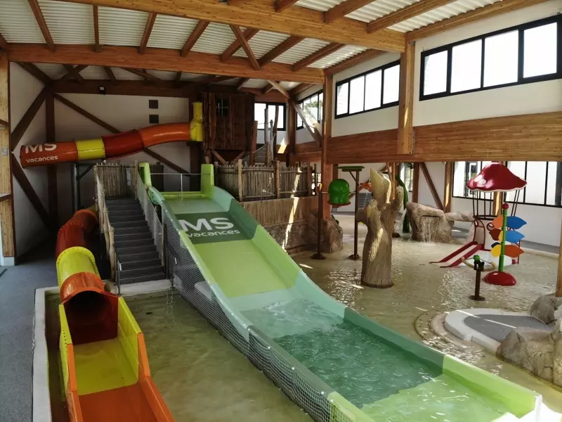 En plus de la plage, vous pourrez vous baigner au sein de l'espace aquatique de plus de 1500m² avec un espace intérieur de 200m² chauffé composé d'une pataugeoire et de 2 toboggans, ainsi qu'un espace extérieur avec 12 toboggans dont le fameux "Space Hole" et un pentaglisse à bouée! Une piscine "Zen" est également à votre disposition pour plus de calme. Que du bonheur en perspective ! Les enfants pourront profiter des 2 toboggans, du jardin d'eau, et de la pataugeoire couverte de 300m² qui leur sont réservés.