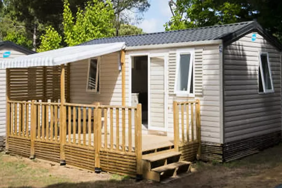 Mobil home pour 4/6 personnes, composé d'un salon avec banquette lit 2 personnes, d'un coin cuisine équipé, d'une chambre avec un lit double, d'une chambre avec 2 lits simples, d'une salle de douche, de WC séparés et d'une terrasse semi-couverte
