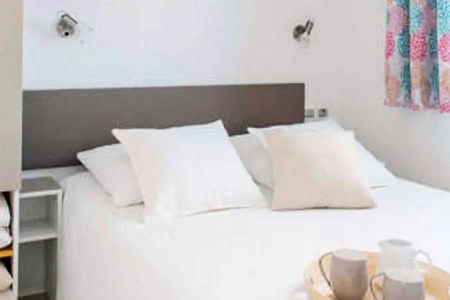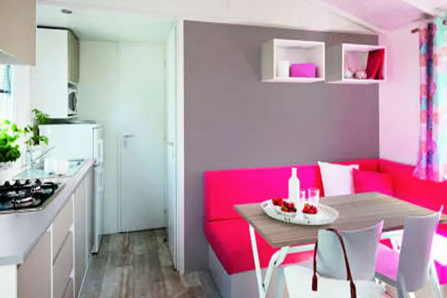 Le mobil-home de 26 m² pouvant accueillir jusqu'à 6 personnes est composé d'un séjour avec banquette convertible en lit double, d'une chambre avec un lit double, d'une seconde chambre avec deux lits simples, d'une cuisine équipée, d'une salle d'eau avec douche, WC séparés ainsi qu'une terrasse en bois semi-couverte.