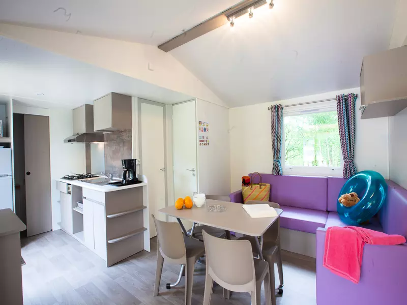 Mobil-home avec terrasse, équipement standard, idéal pour passer un agréable séjour.