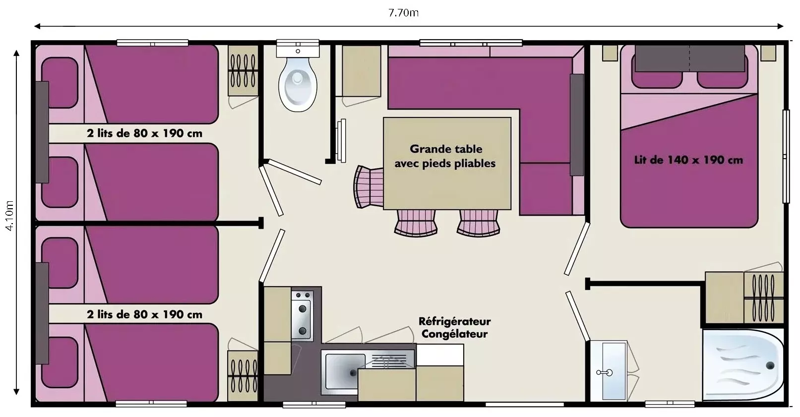 À noter : Les tailles de lits mentionnées sont non contractuelles. Il est possible d'avoir de légères différences de tailles selon les modèles de locatifs. La disposition des lits et la décoration peuvent également varier.