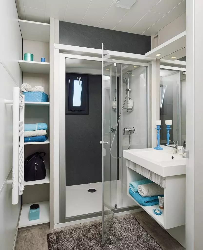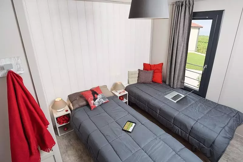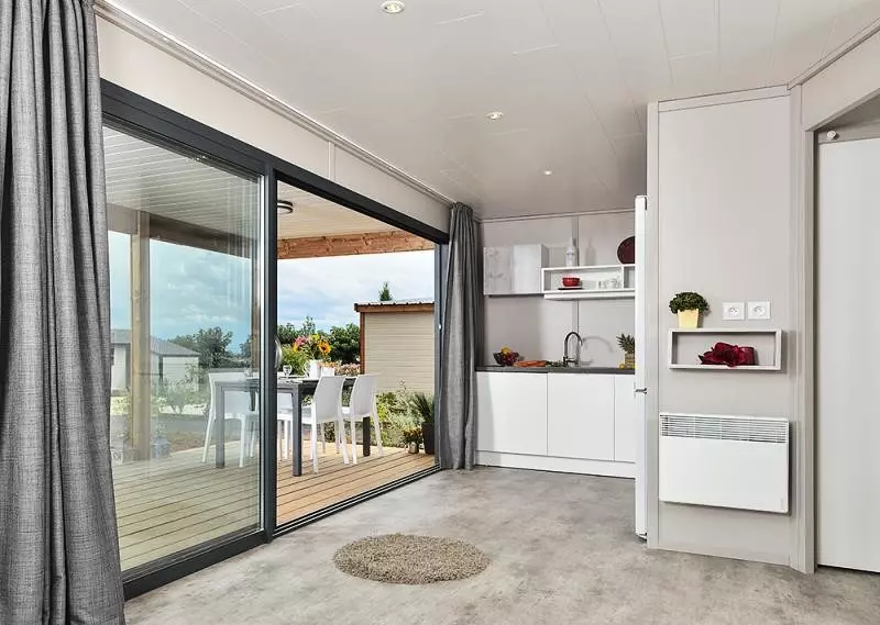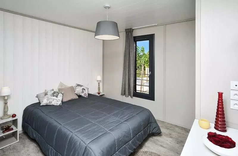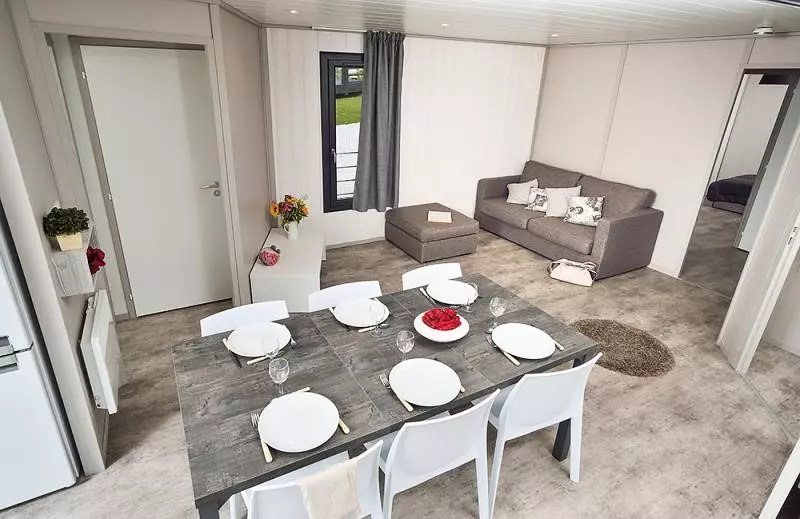 Chalet Climatisé 4 pièces 6 personnes de 63m², composé d'un coin cuisine équipé, d'un coin séjour avec télévision, d'une chambre avec un lit double, de 2 chambres avec chacune 2 lits simples, de 2 salles de douche, de 2 WC séparés et d'une terrasse.