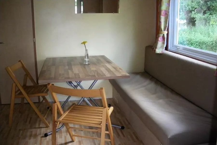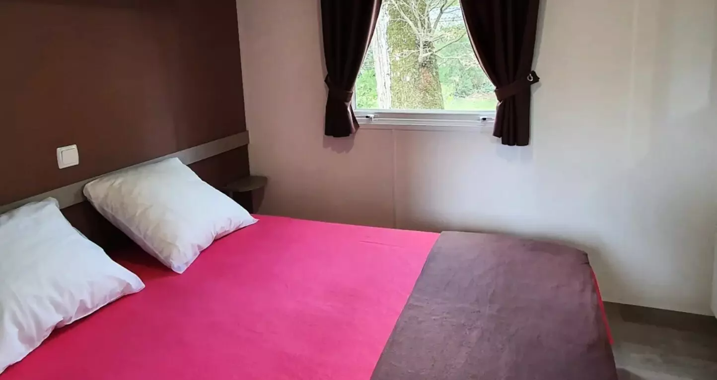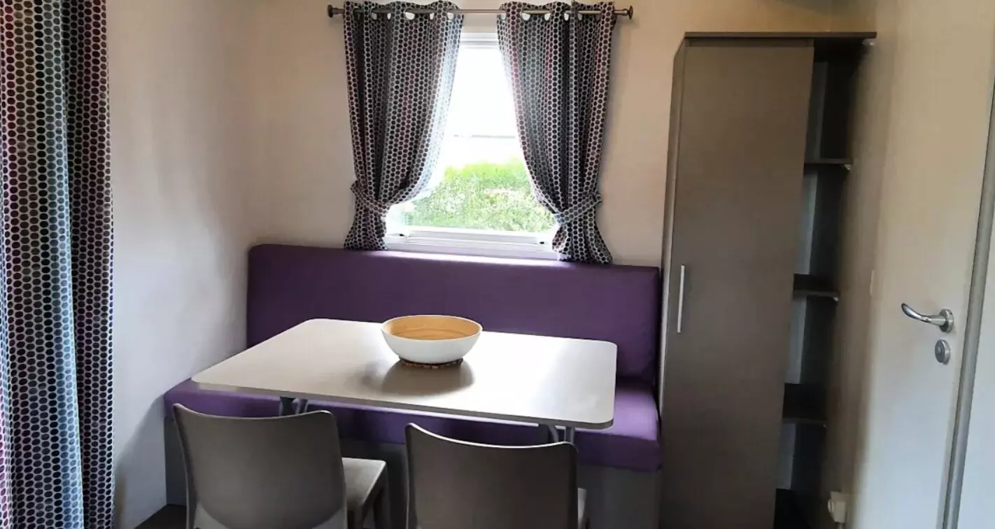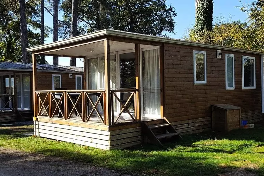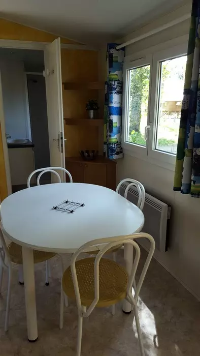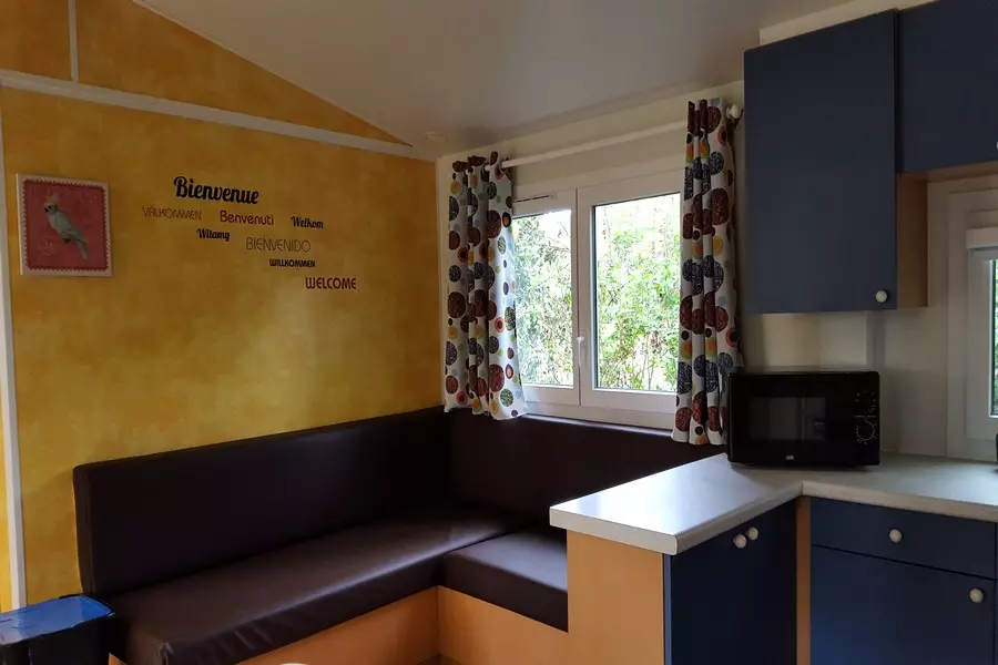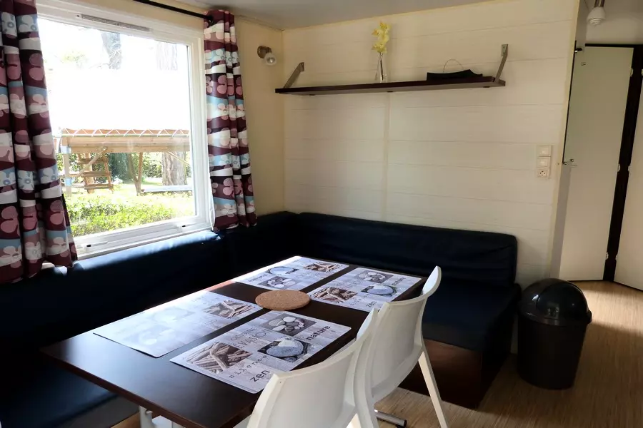 Mobil Home 3 pièces pour 5 personnes de 29m² environ, composé d'un coin salon, d'un coin cuisine équipé, d'une chambre avec un lit double (140x190), d'une chambre avec 3 lits simples (80x190), d'une salle de douche, de WC séparés et d'une terrasse.