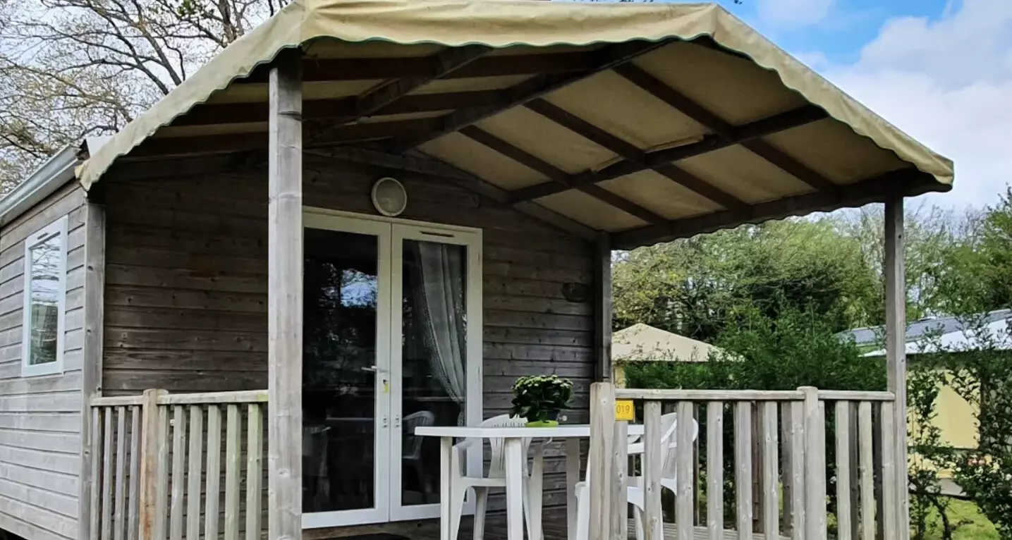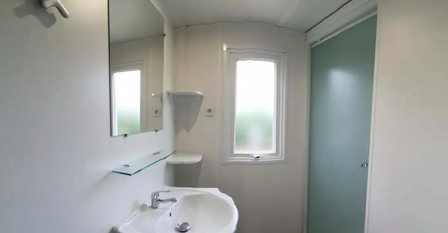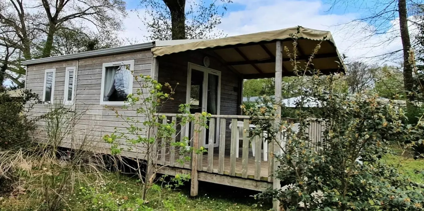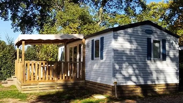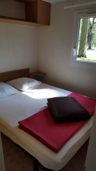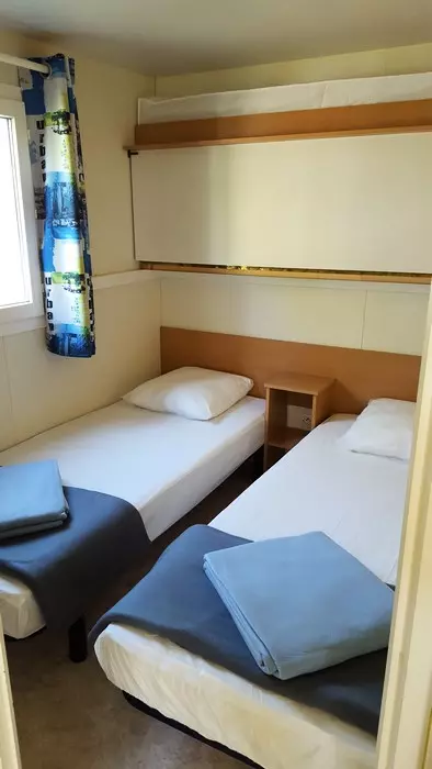 Mobil Home 3 pièces pour 4 personnes de 25m² environ, composé d'un coin salon, d'un coin cuisine équipé, d'une chambre avec un lit double (140x190), d'une chambre avec 2 lits simples (80x190), d'une salle de douche, de WC séparés et d'une terrasse.