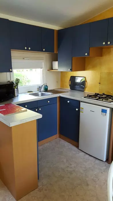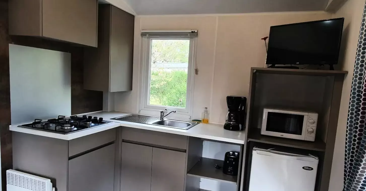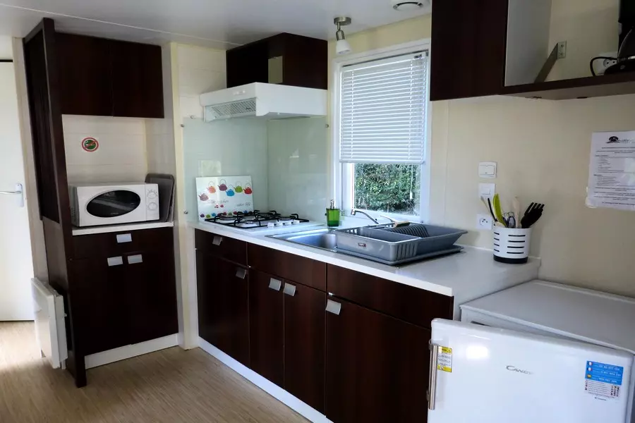 Le Mobil Home comprend un coin cuisine équipé avec réfrigérateur, plaques de cuisson 4 feux, micro-onde, cafetière, grille pain, ustensiles de cuisine et vaisselle adaptée au nombre de personnes dans le logement.
