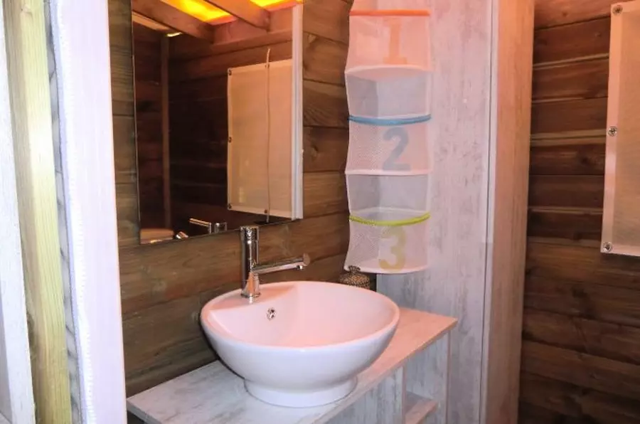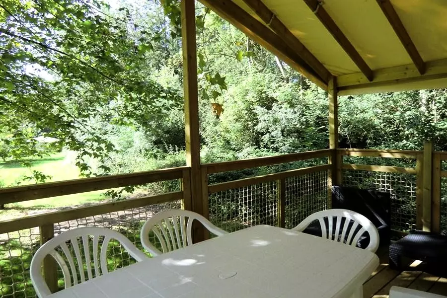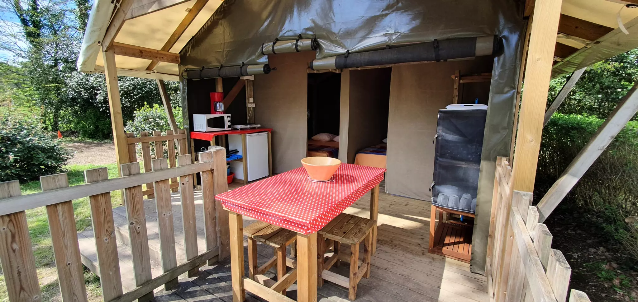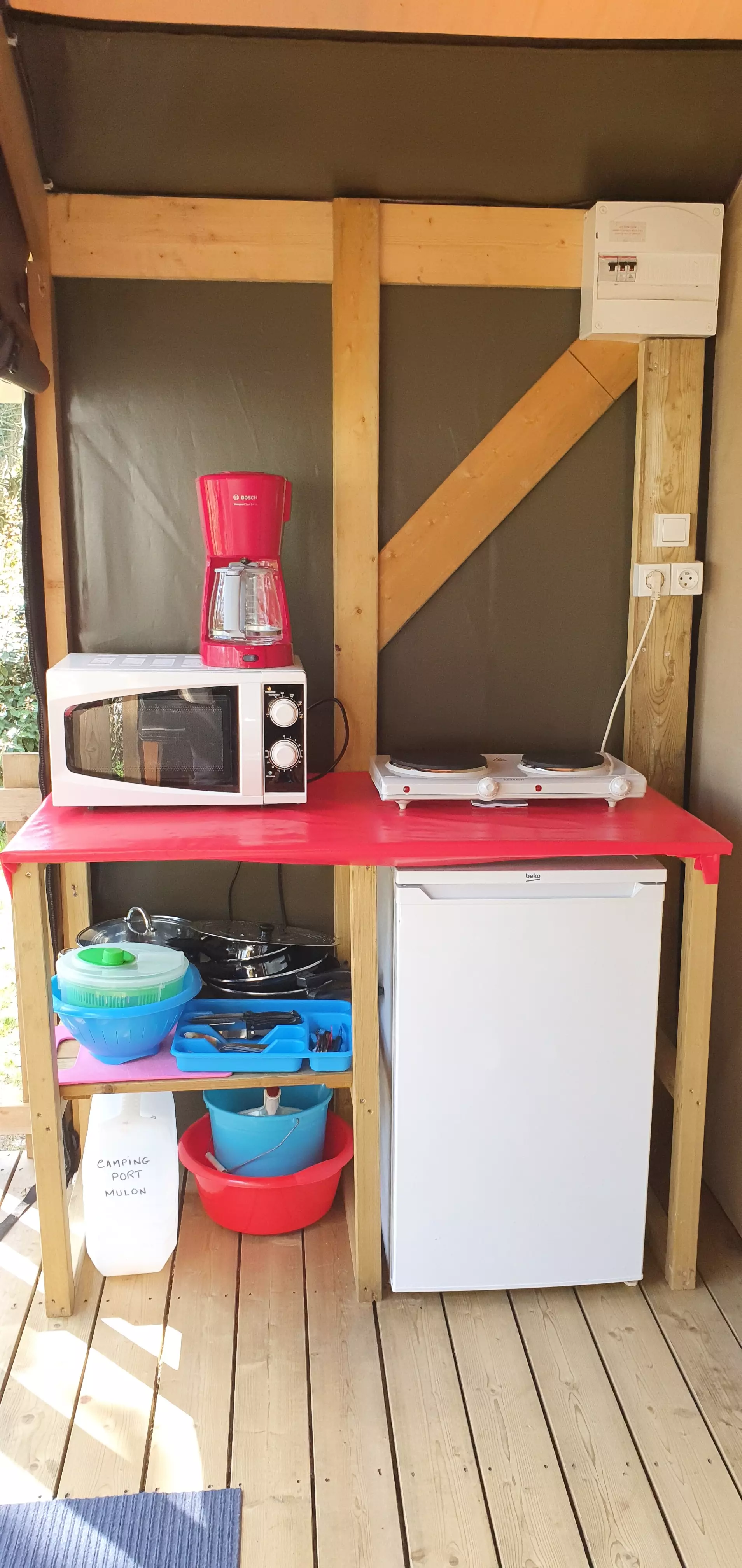 L'écolodge comprend un coin cuisine équipé avec réfrigérateur, plaques de cuisson 2 feux, micro-onde, cafetière, grille pain, ustensiles de cuisine et vaisselle adaptée au nombre de personnes dans le logement. La terrasse dispose d'un salon de jardin.