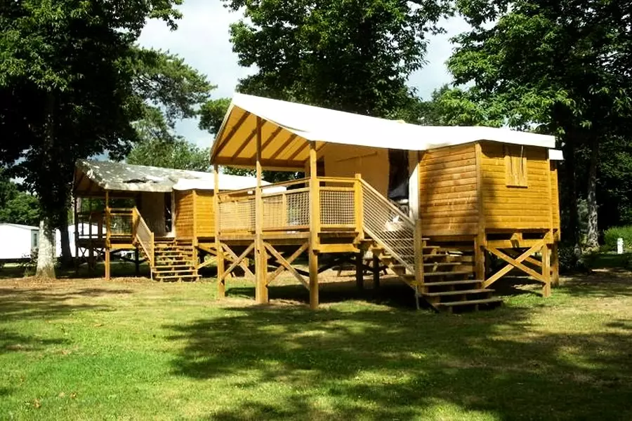 Ecolodge sur pilotis 3 pièces pour 4 personnes de 21m² environ, composé d'un coin salon, d'un coin cuisine équipé, d'une chambre avec un lit double (140x190), d'une chambre avec 2 lits simples (80x190), d'une salle de douche avec WC et d'une terrasse.