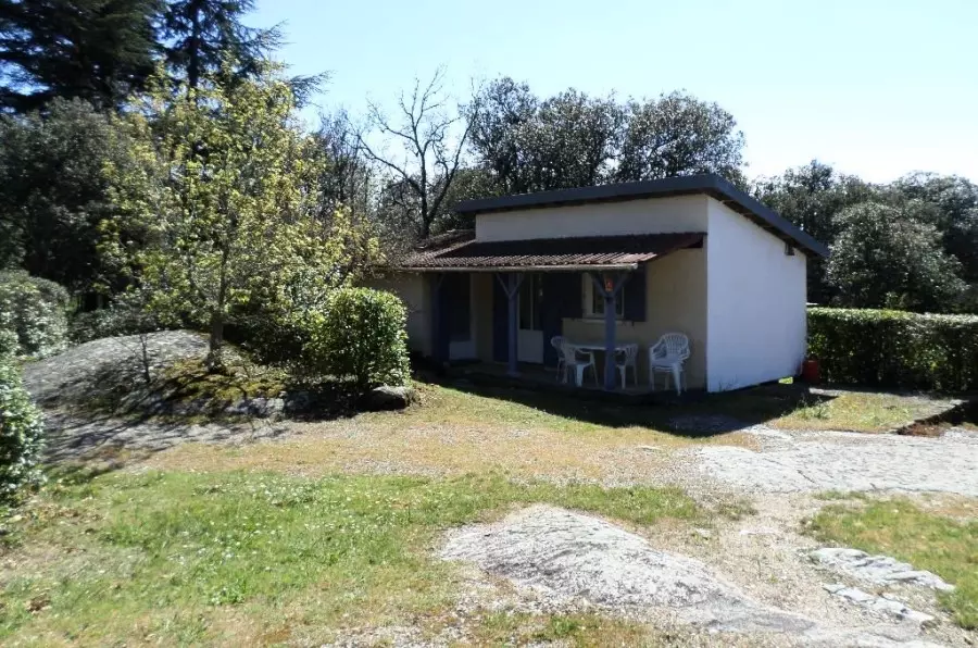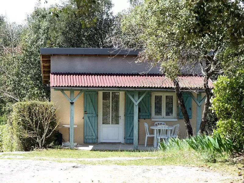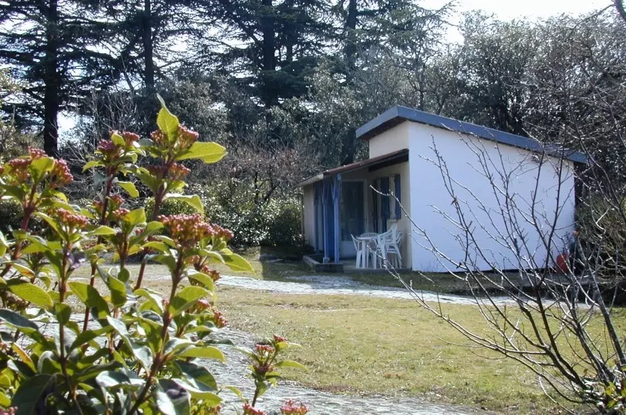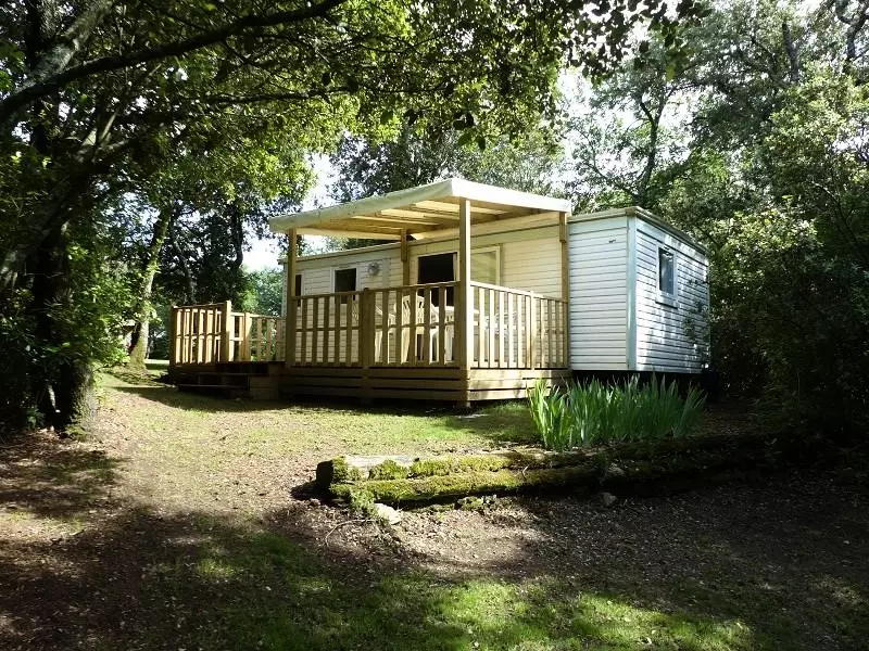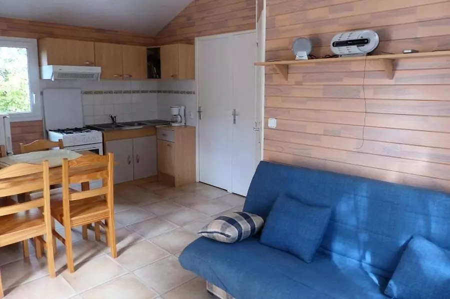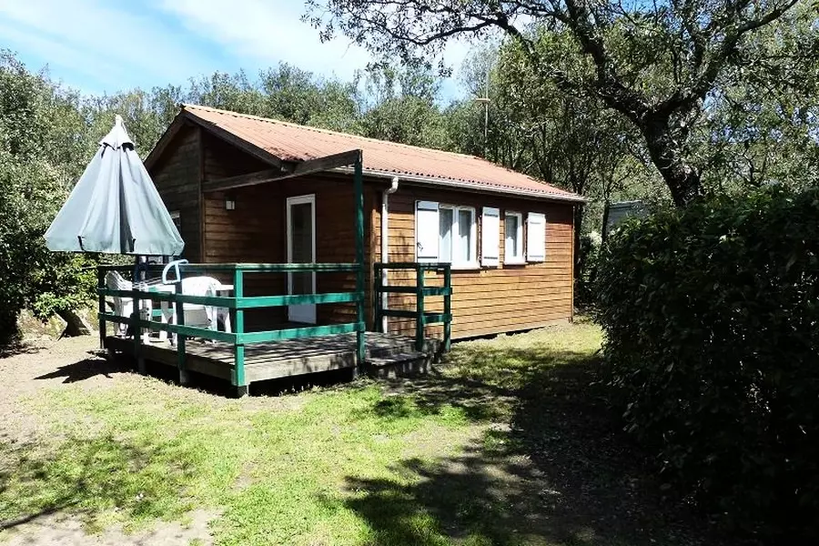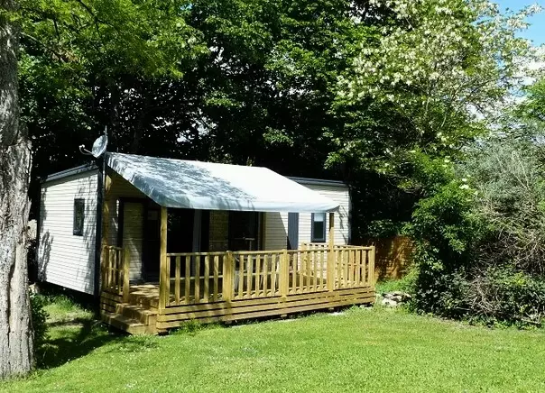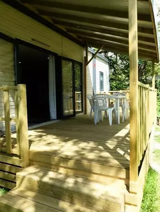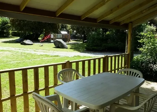 Chalet Premium 28m2 : Double Terrasse semi-couverte, Cuisine équipée (micro-ondes, frigo/congélateur, gazinière, cafetière, vaisselle), SDB avec douche et lavabo, WC séparé, 1 chambre 1 lit double 160cm + 1 chambre 3 lits simples 80cm + jardin privé + télévision (à l'ombre sans aucun vis-à-vis)