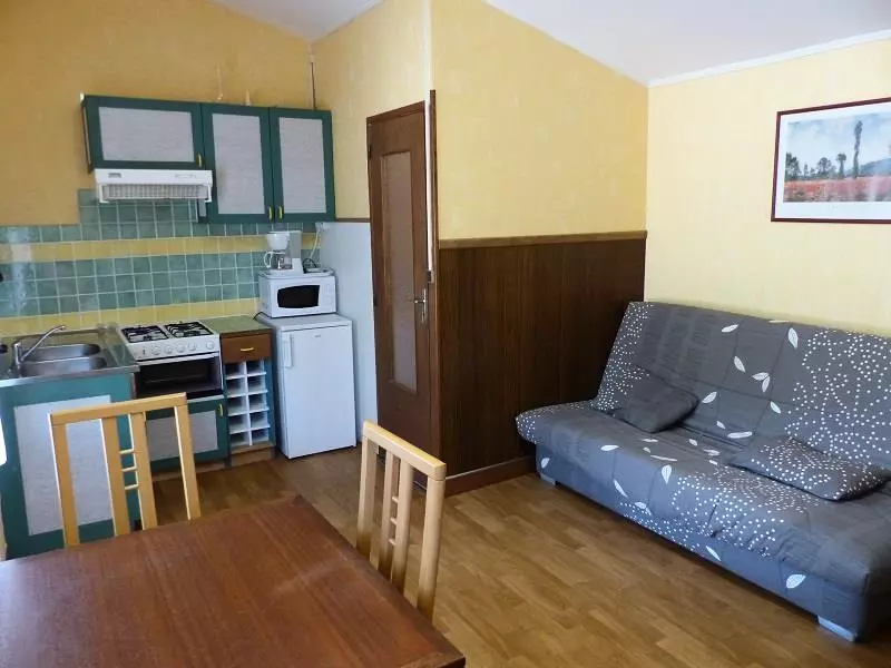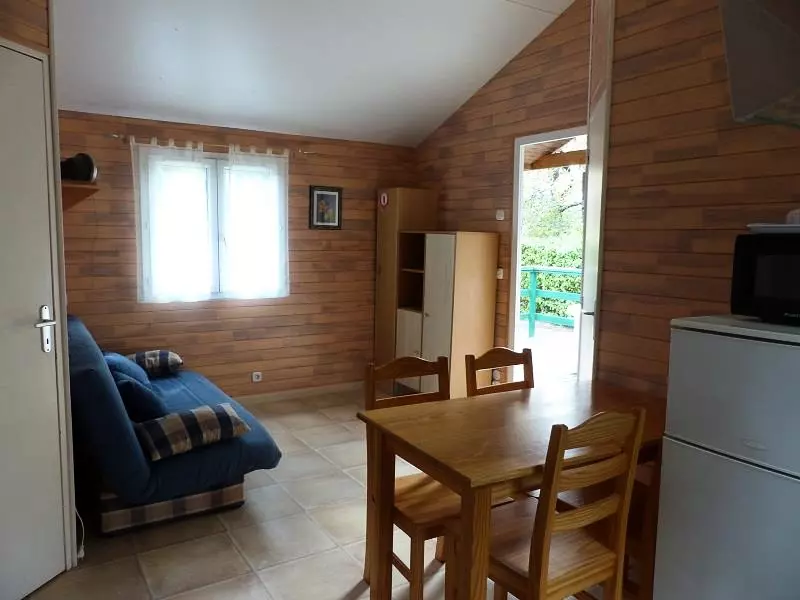 Mobil home 2 pièces de 20m² pour 4 personnes, composé d'un séjour avec un canapé-lit, d'un coin cuisine équipé, d'une chambre avec un lit double, d'une salle d'eau avec douche, lavabo et WC et d'une terrasse équipée.