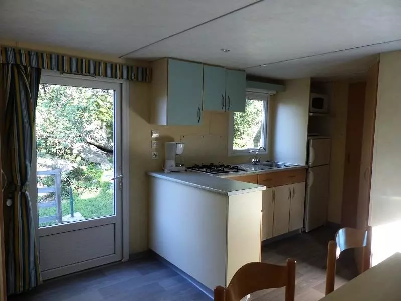 Le Mobil Home comprend un coin cuisine équipé avec feux gaz, micro-ondes, ustensiles de cuisine et vaisselle adaptée au nombre de personnes dans le logement. La terrasse dispose d'un salon de jardin.
