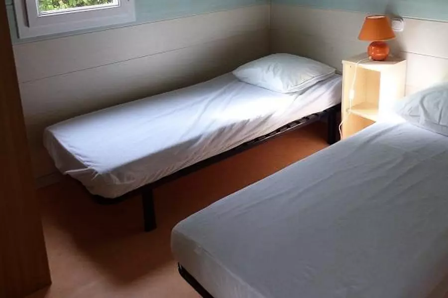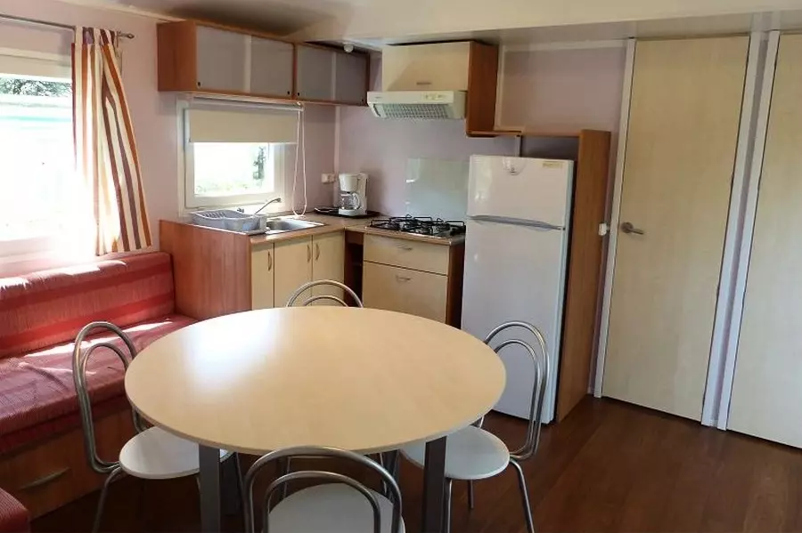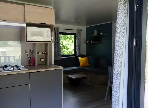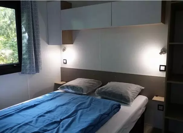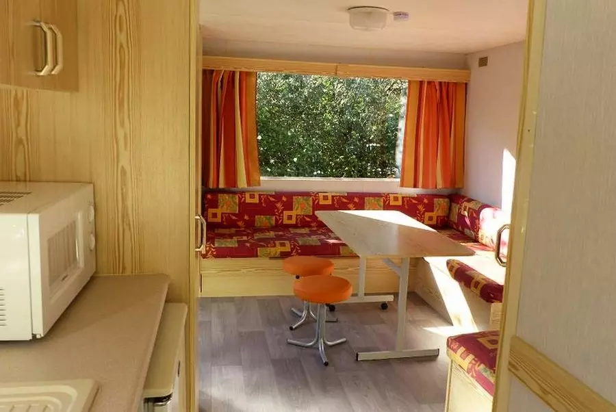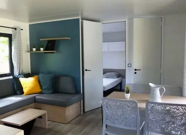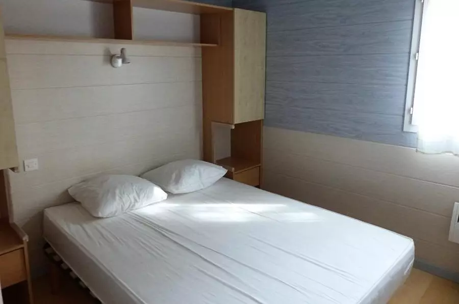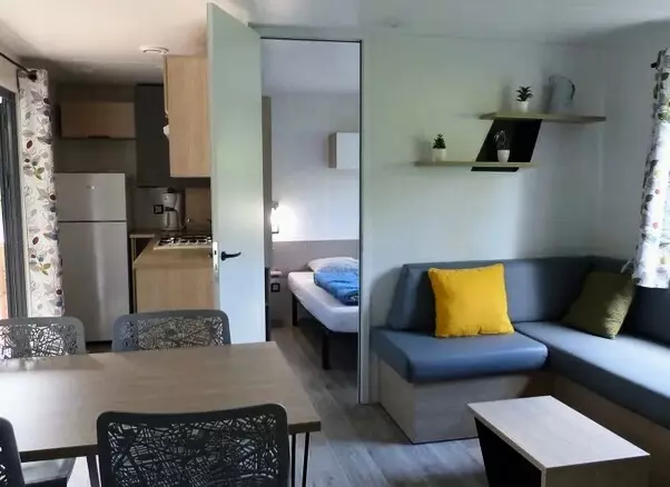 Mobil home 3 pièces de 28m² pour 4/6 personnes, composé d'un séjour avec coin cuisine équipé, d'une chambre avec un lit double, d'une chambre avec 2 lits simples, d'une salle de douche avec lavabo et WC, d'une terrasse.