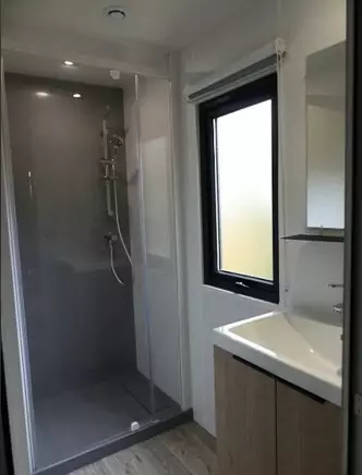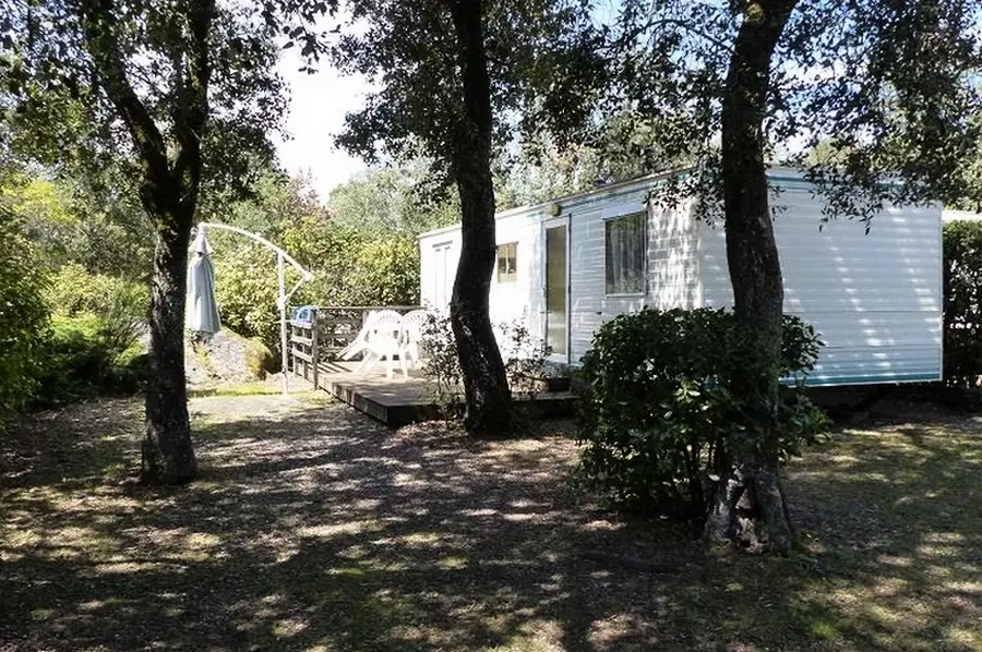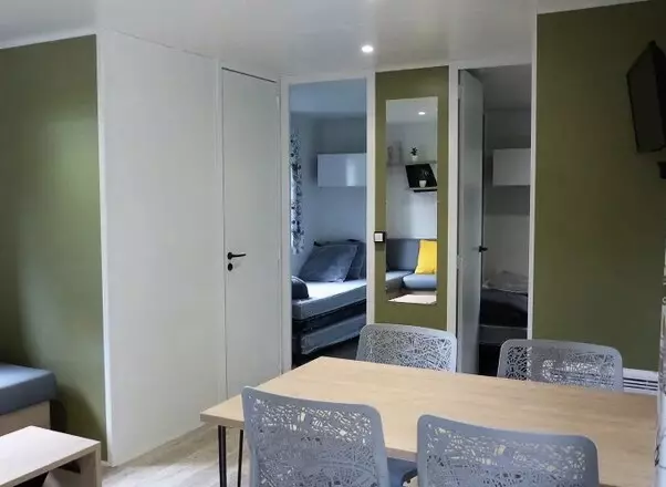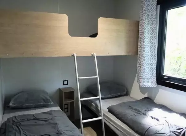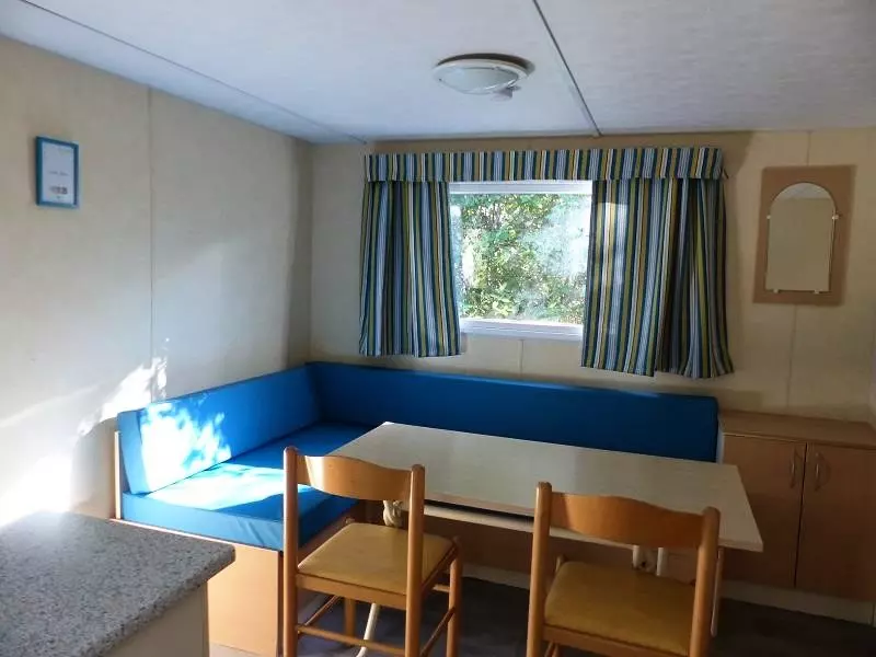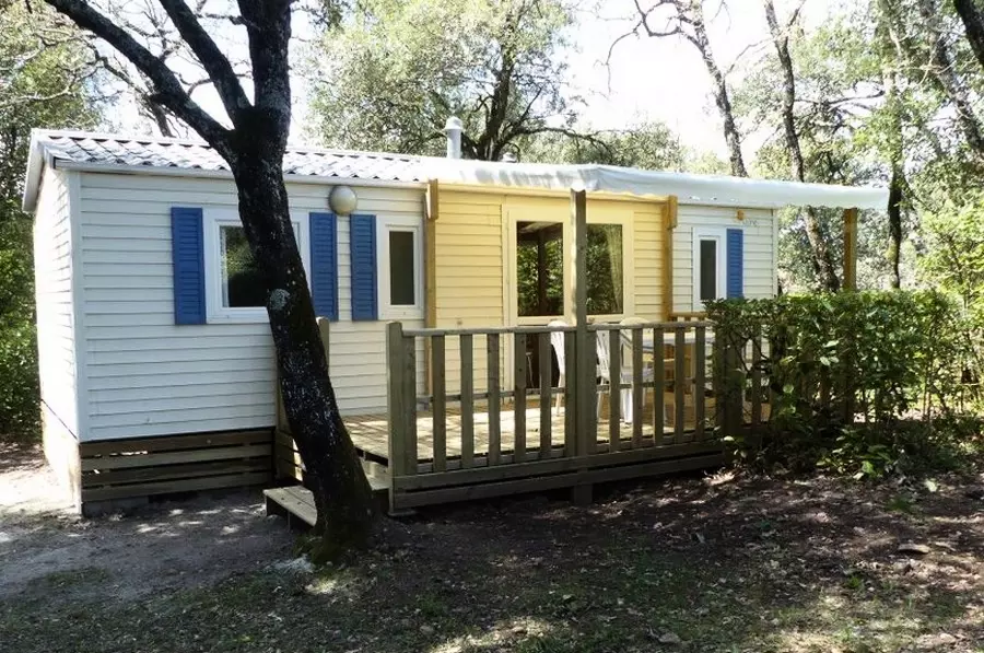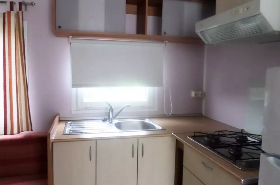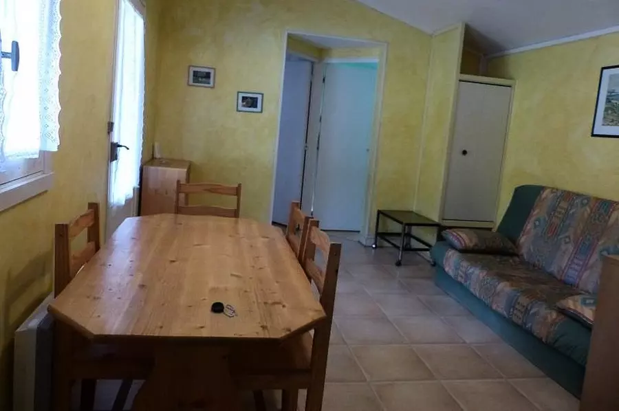 Mobil home 3 pièces de 28m² pour 4/6 personnes, composé d'un séjour avec coin cuisine équipé, d'une chambre avec un lit double, d'une chambre avec 2 lits simples, d'une salle de douche avec lavabo et WC, d'une terrasse.