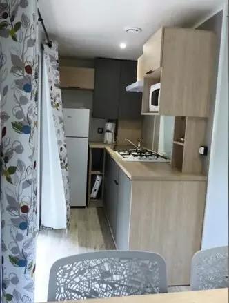 Le Mobil Home comprend un coin cuisine équipé avec réfrigérateur-congélation, feux gaz, four, micro-ondes, ustensiles de cuisine et vaisselle adaptée au nombre de personnes dans le logement.