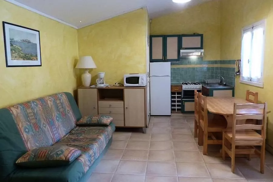 Le Bungalow comprend un coin cuisine équipé avec feux gaz, four, micro-ondes et de l'ensemble des ustensiles de cuisine et la vaisselle nécessaire pour 6 personnes.