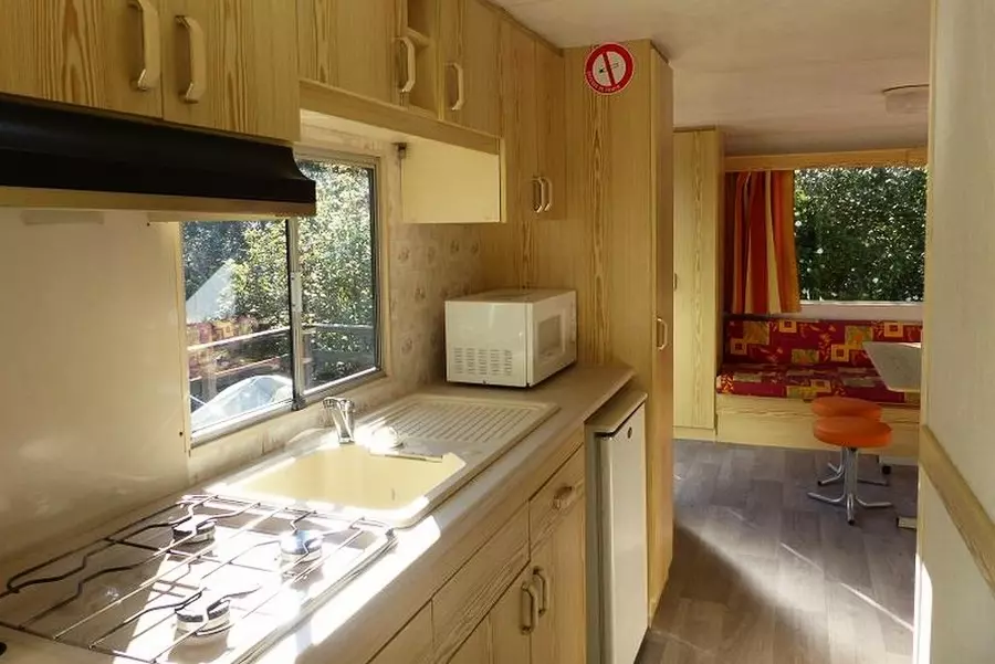 Le Mobil Home comprend un coin cuisine équipé avec feux gaz, réfrigérateur, micro-ondes, ustensiles de cuisine et vaisselle adaptée au nombre de personnes dans le logement.